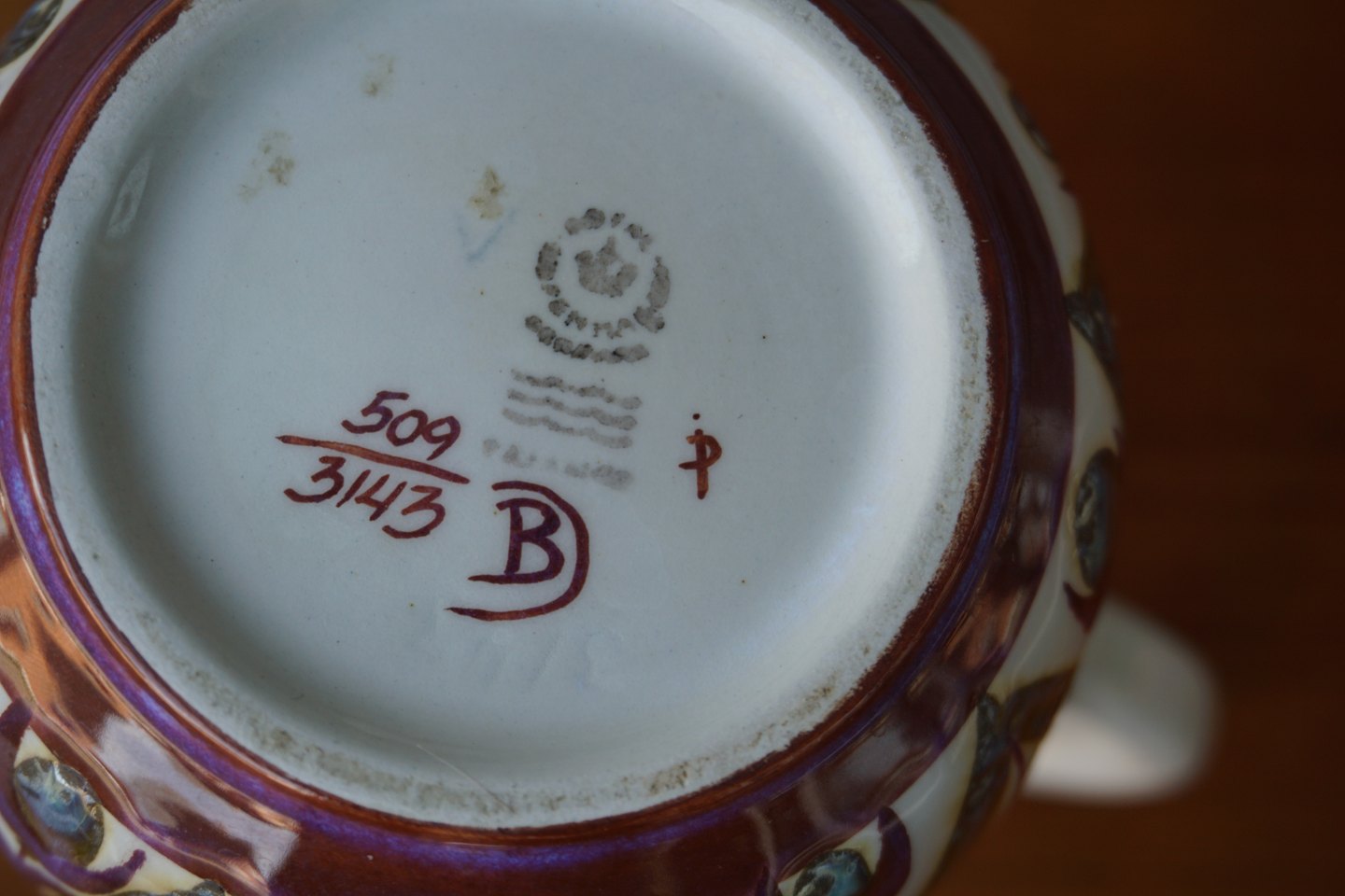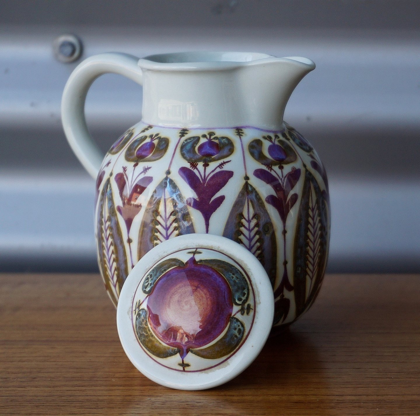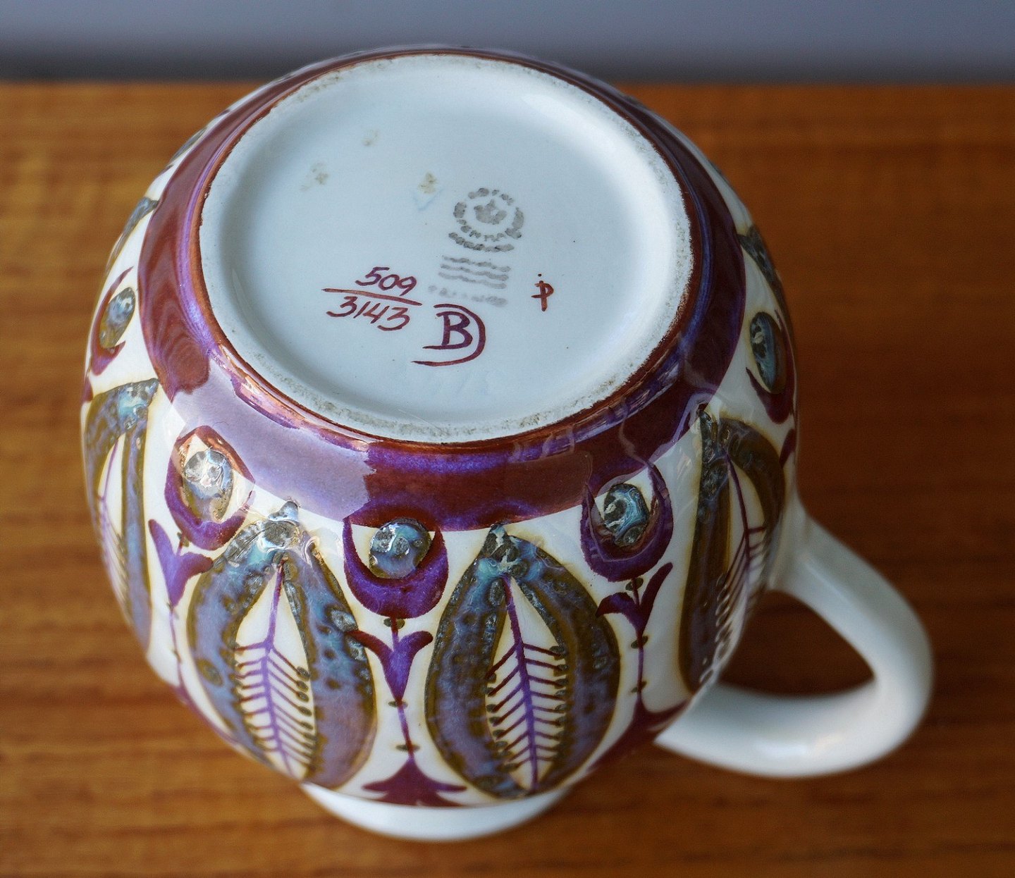 Royal Copenhagen fajance kande (509/3143)Kgl. Dekoreret med rødligt og grønligt bladmønster