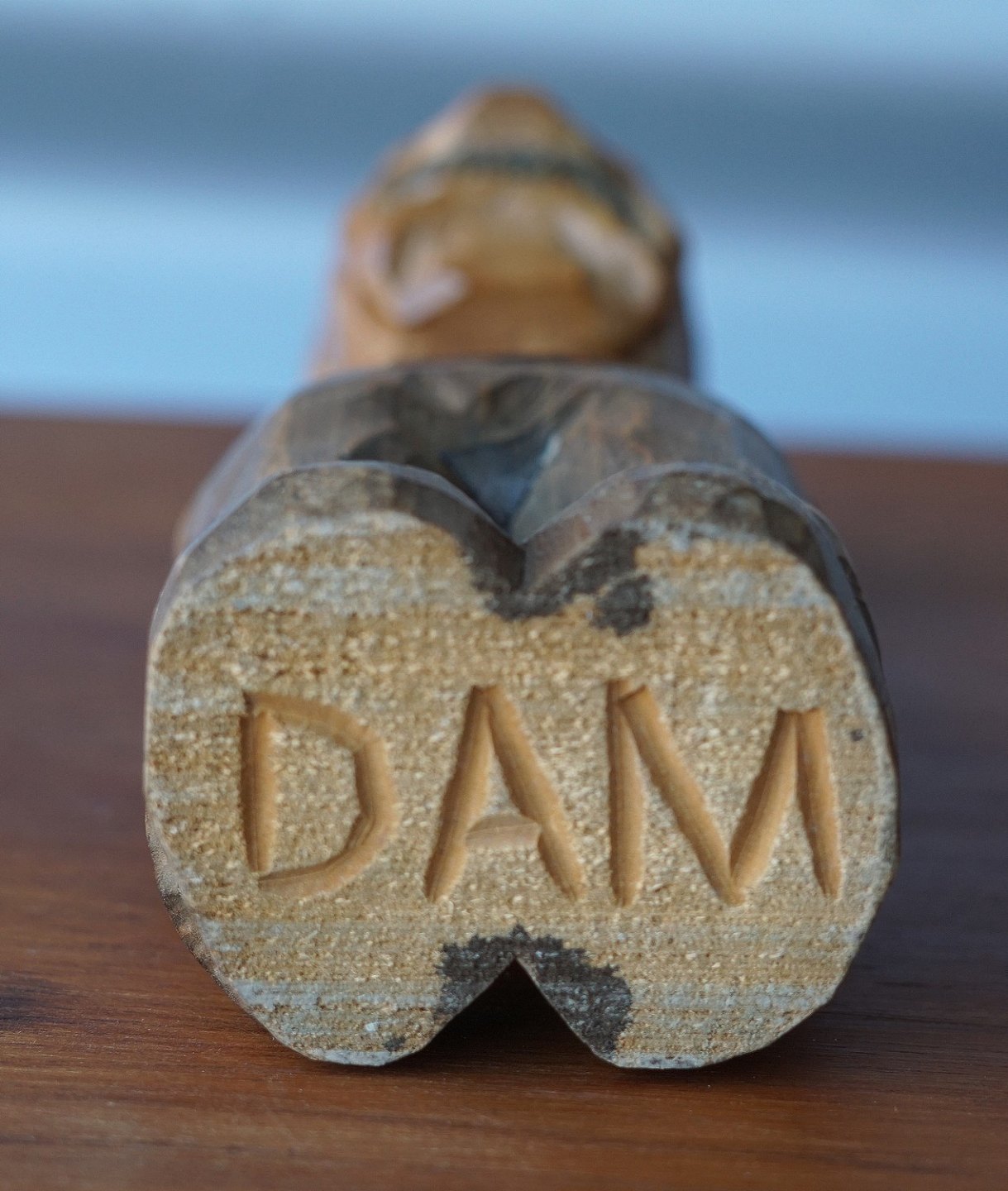 Træfigur af mand med hånden i lommen. Tidlig træskærer arbejde af Thomas Dam, mærket DAM, sort farvet hår og skæg.