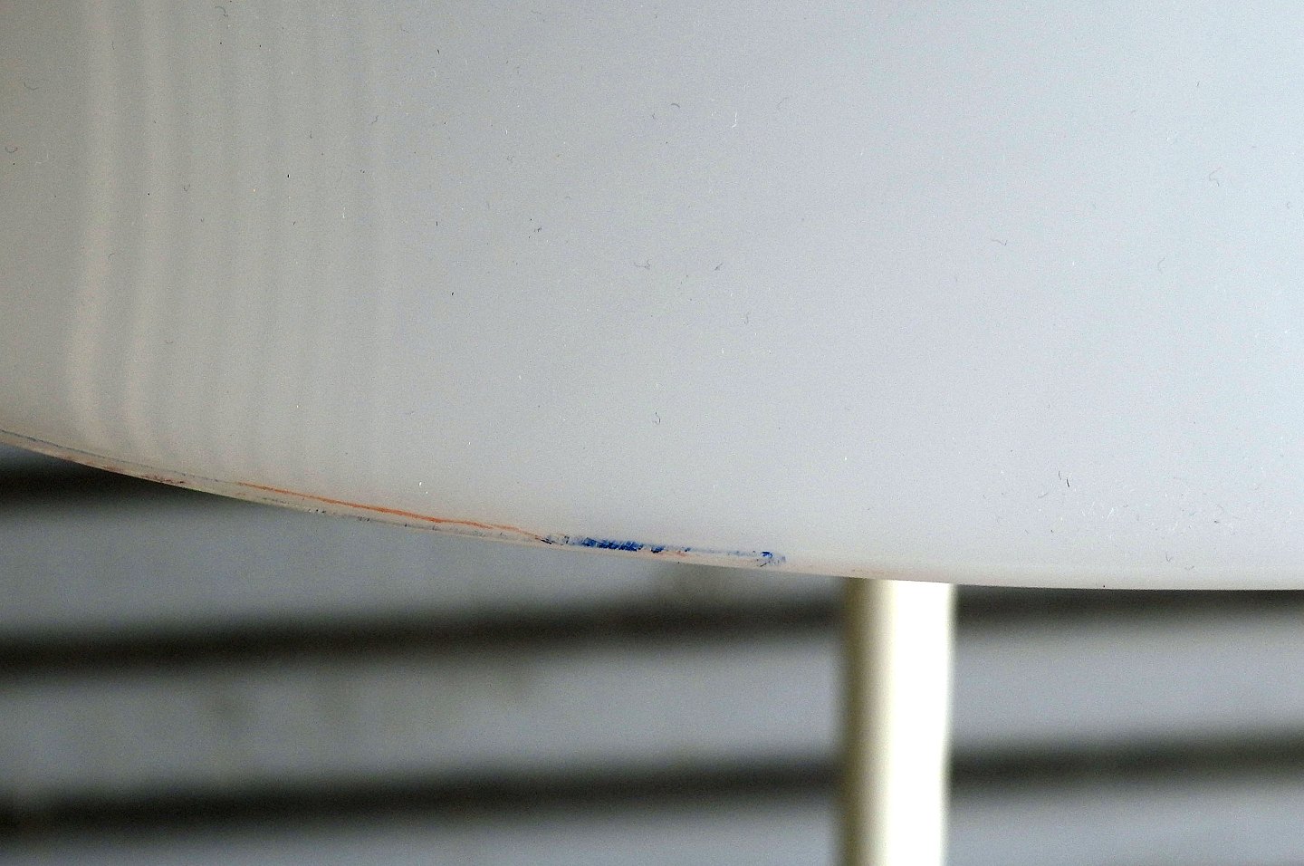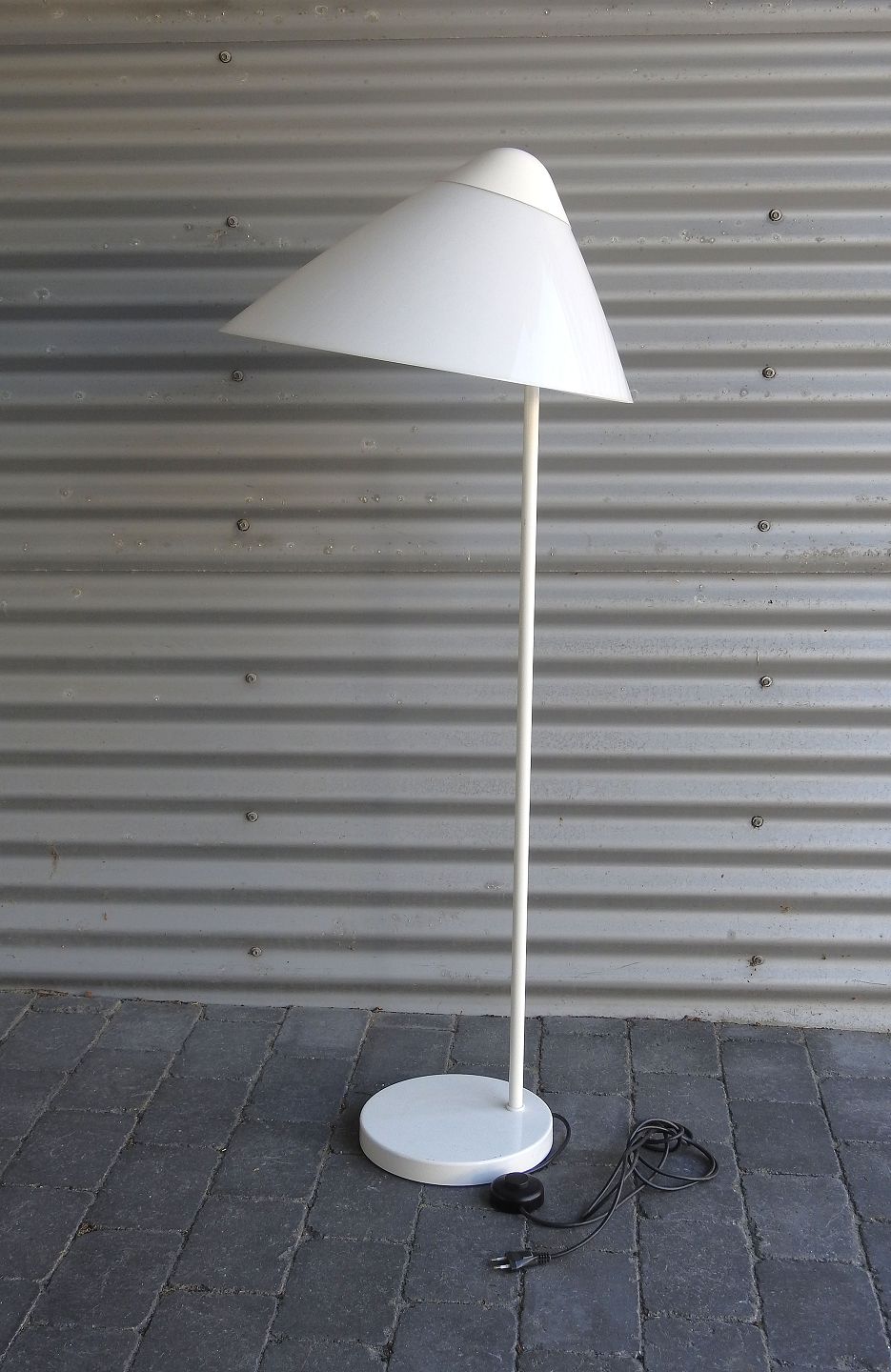Opala Standerlampe med oval skærm designet af Hans J. Wegner. Skærmen er i opalhvid plast på hvidlakeret metalfod. Fremstår med enkelte brugsspor på fod.