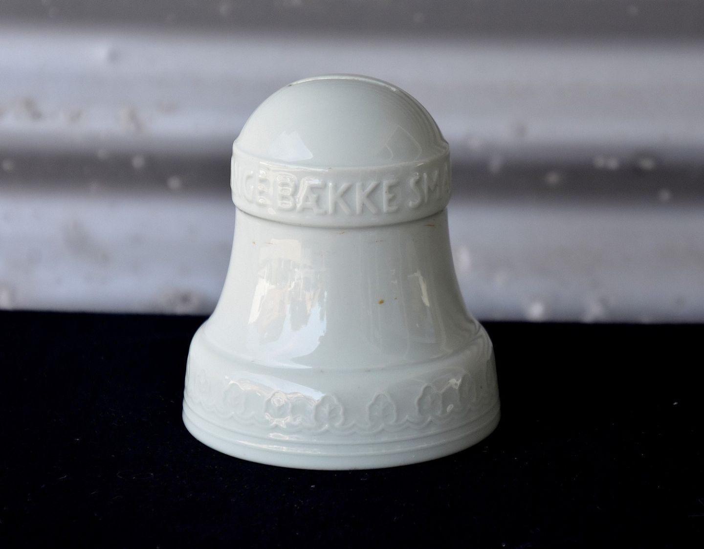 Gammel sparebøsse i mintgrøn porcelæn i form af en klokke