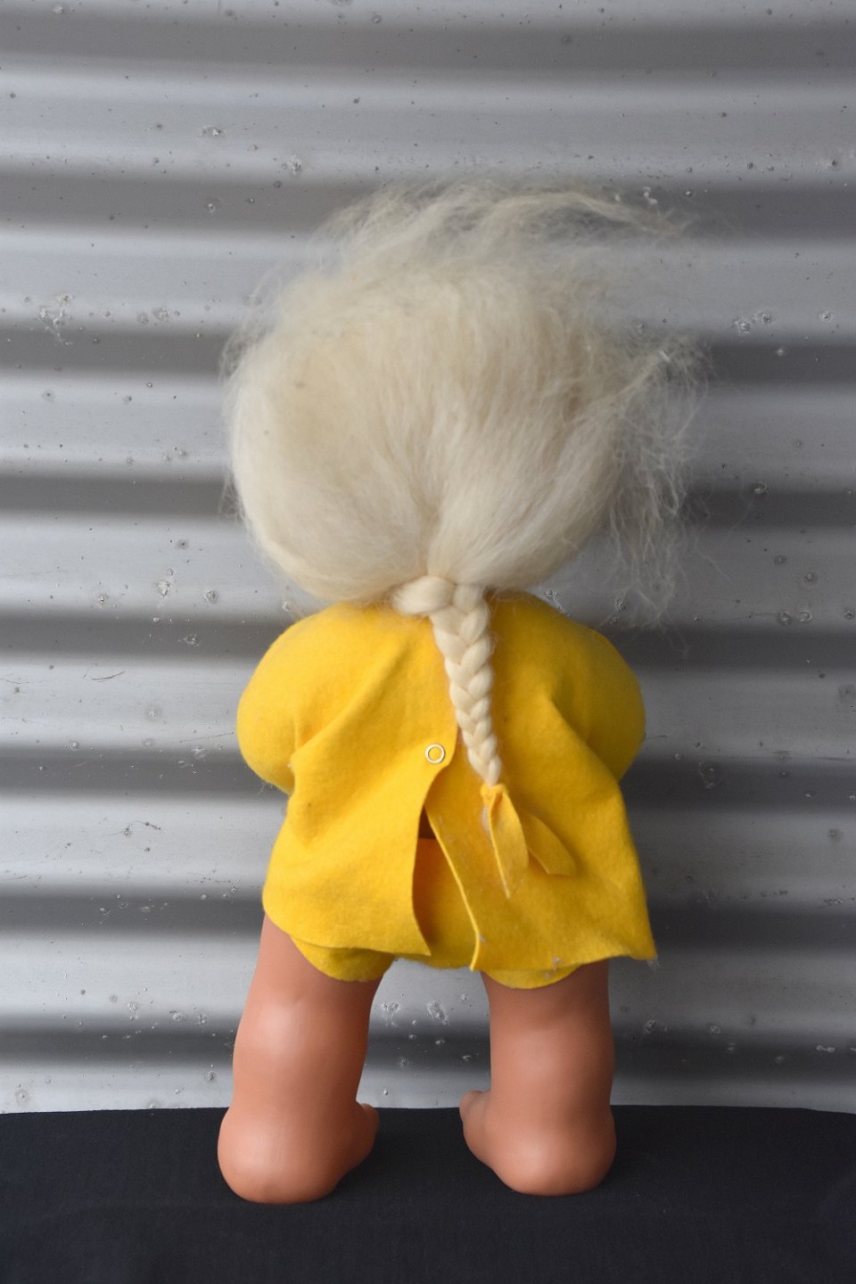 Thomas Dam, Gjøl Trold, Dam Trold (806). Pige trold med hvidt hår og fletning, gul filt kjole og gule filt bukser