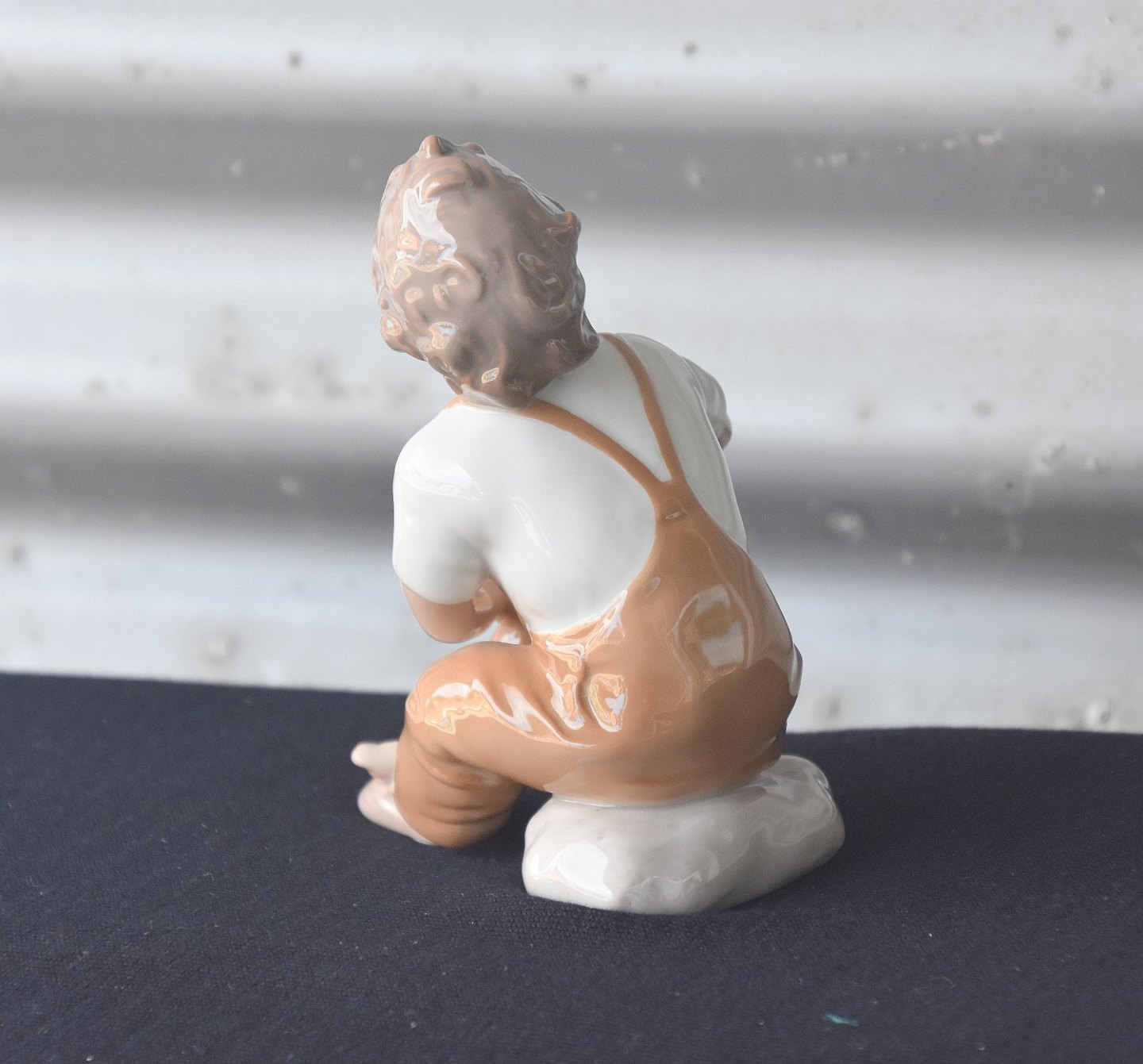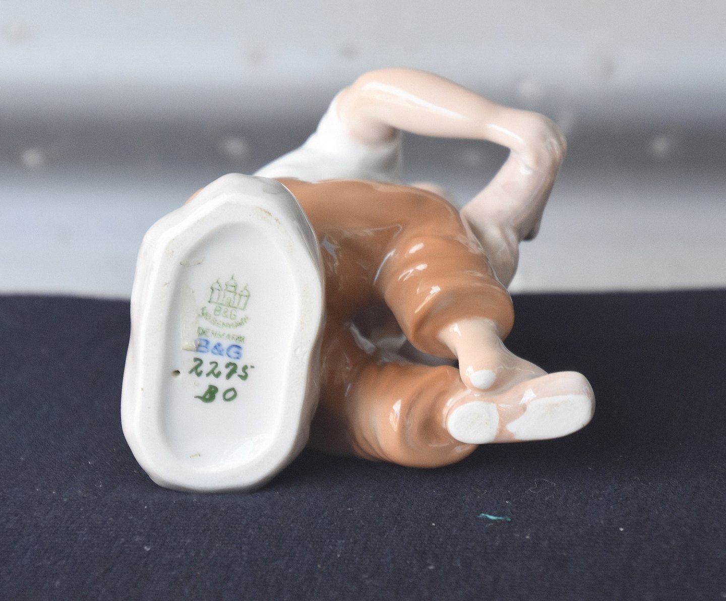 Bing & Grøndahl, Hjælp mig, mor (2275). B&G figuren har mørkebrune bukser på, bemærk vi har også den samme figur med blå bukser og lysebrune bukser.