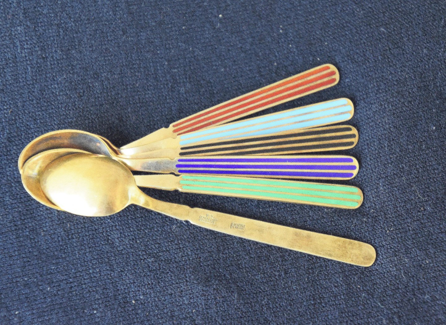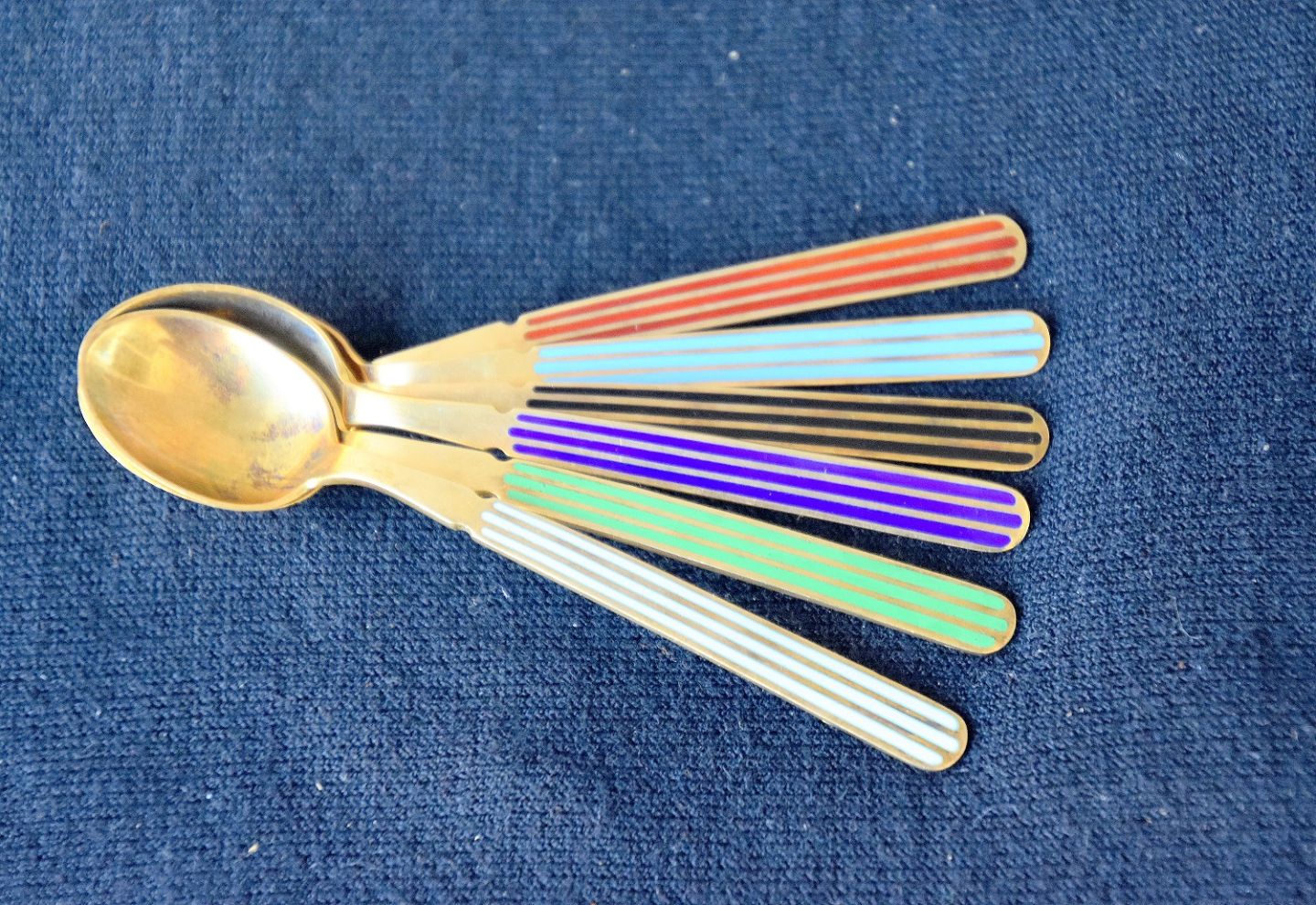 Anton Michelsen forgyldte teskeer af sterling sølv med emalje. Der er 6 skeer, skeerne har hver sin farve