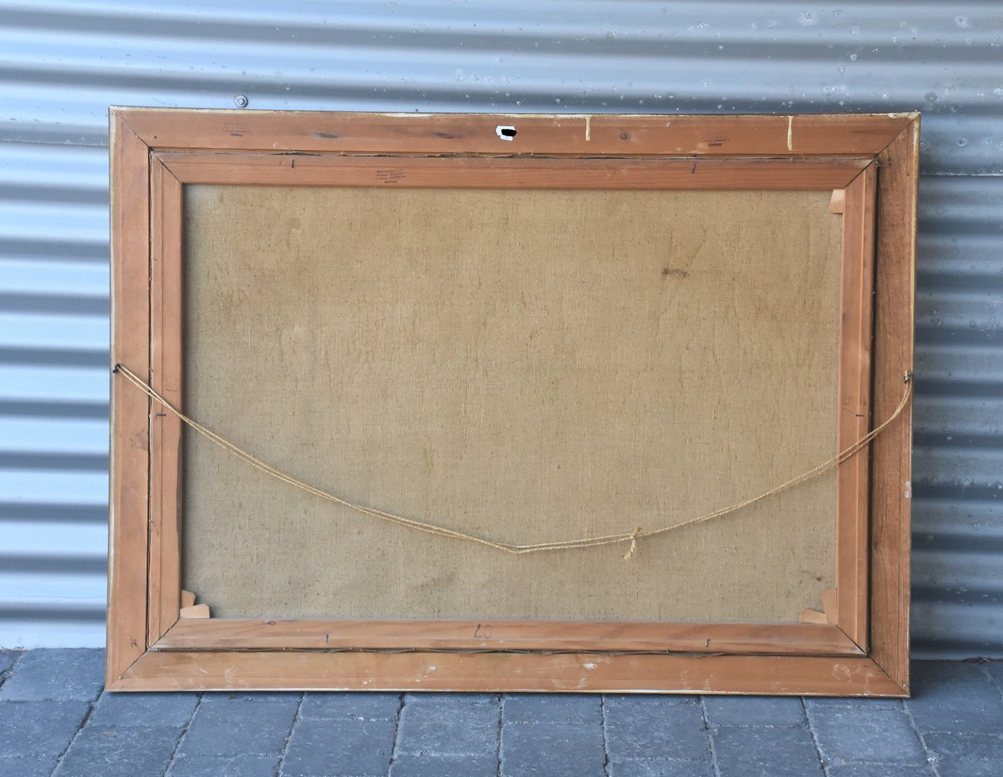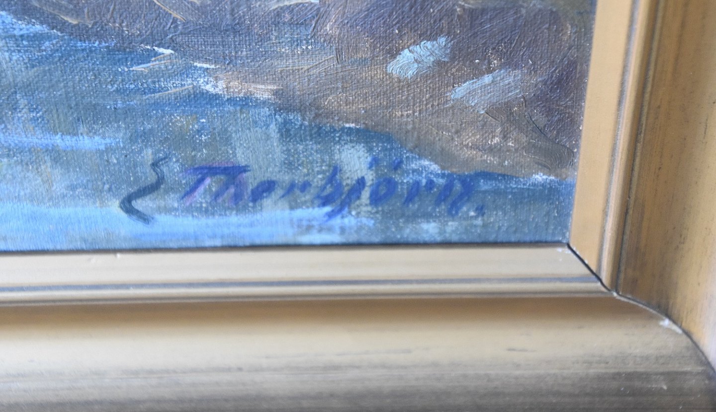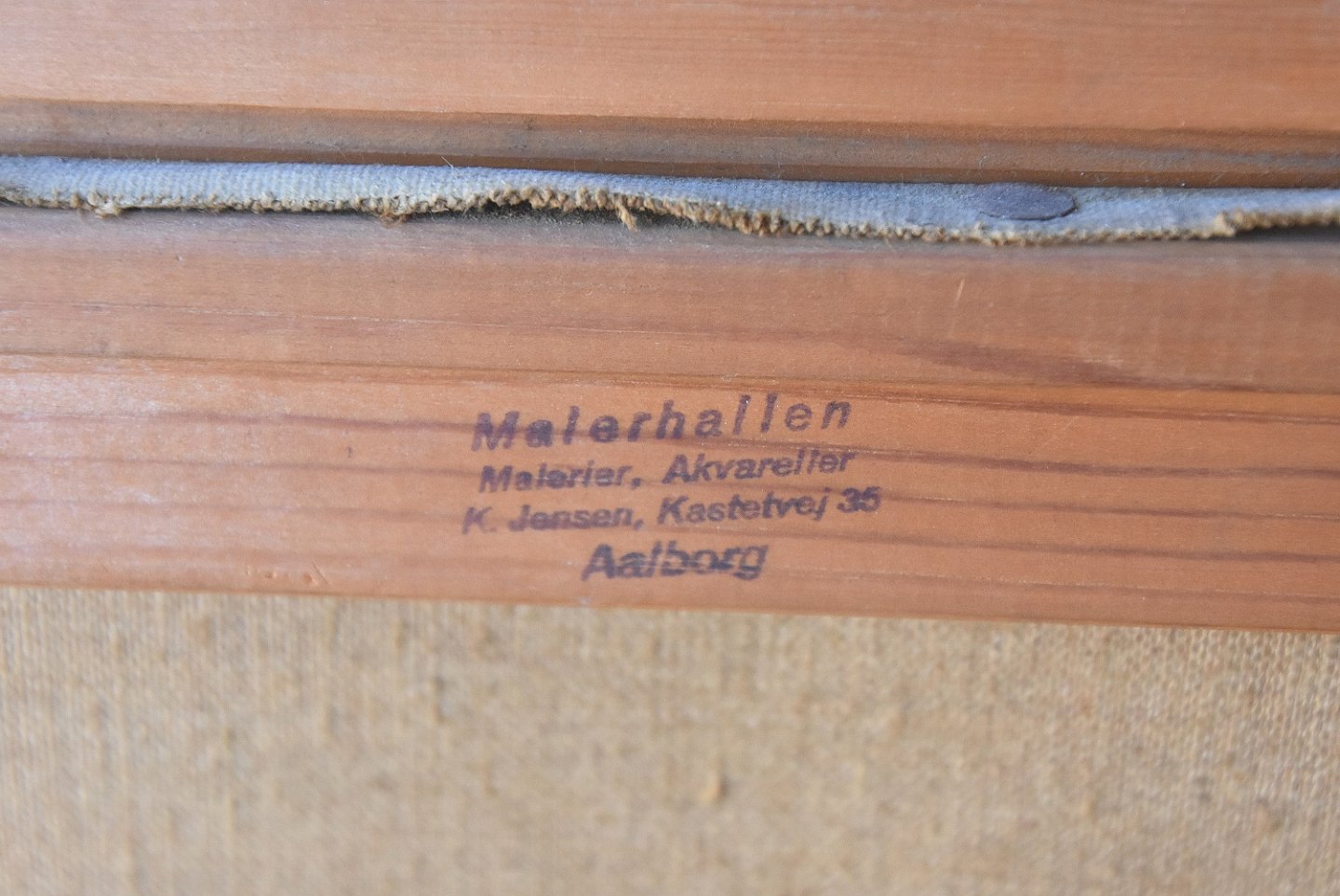 Maleri af hus mellem træer af Evelyn Thorbjørn.