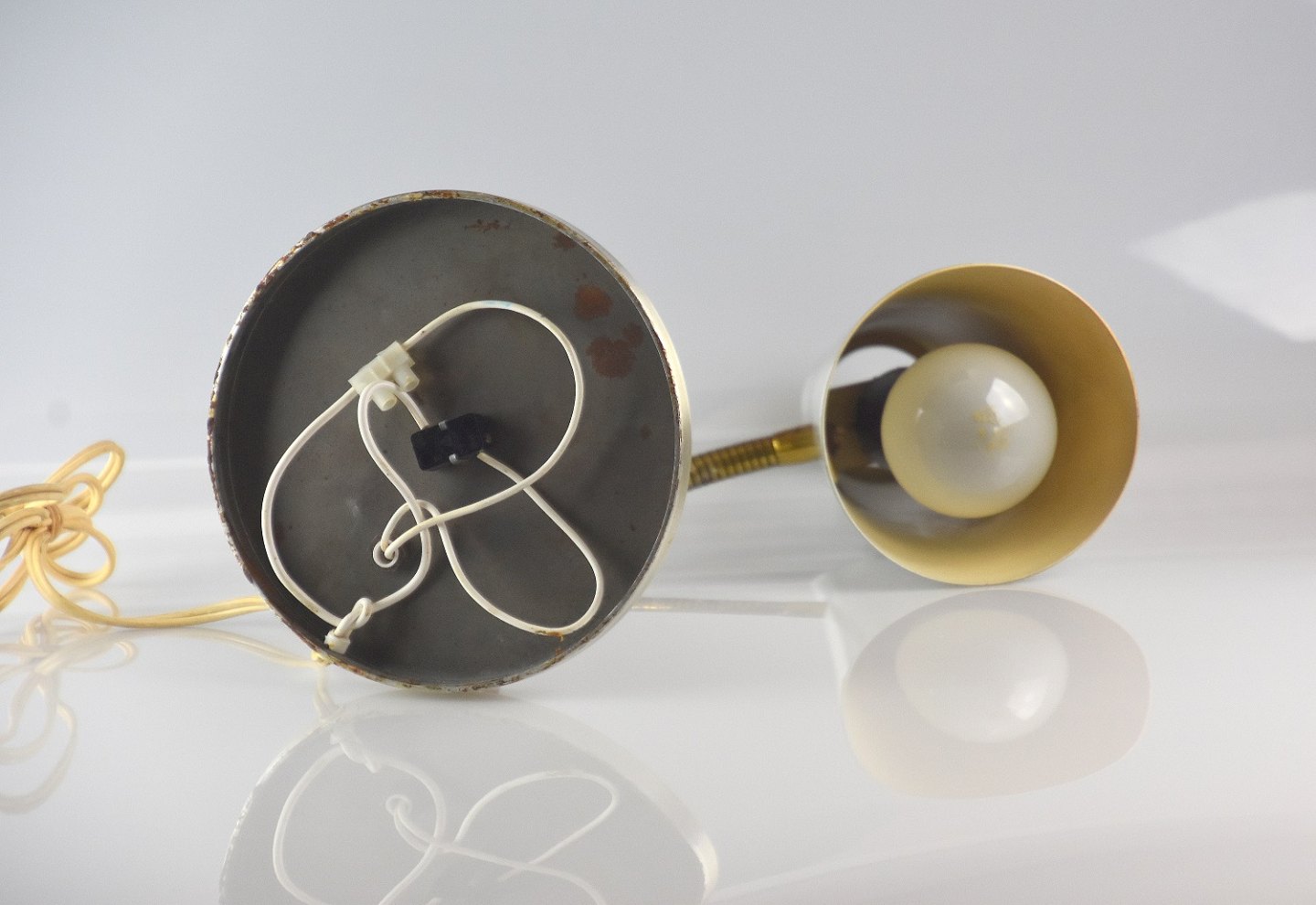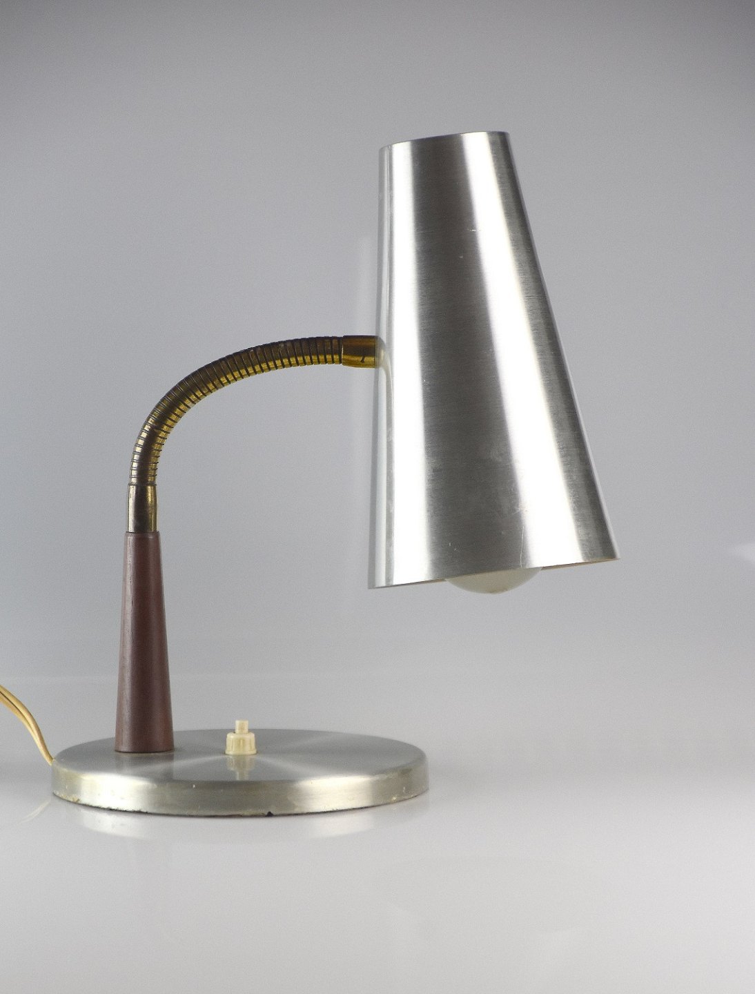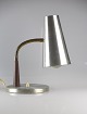 Bordlampe i børstet stål, med flexibel indstilling af skærm. Indstillingsfjederen er af teaktræ og messing.