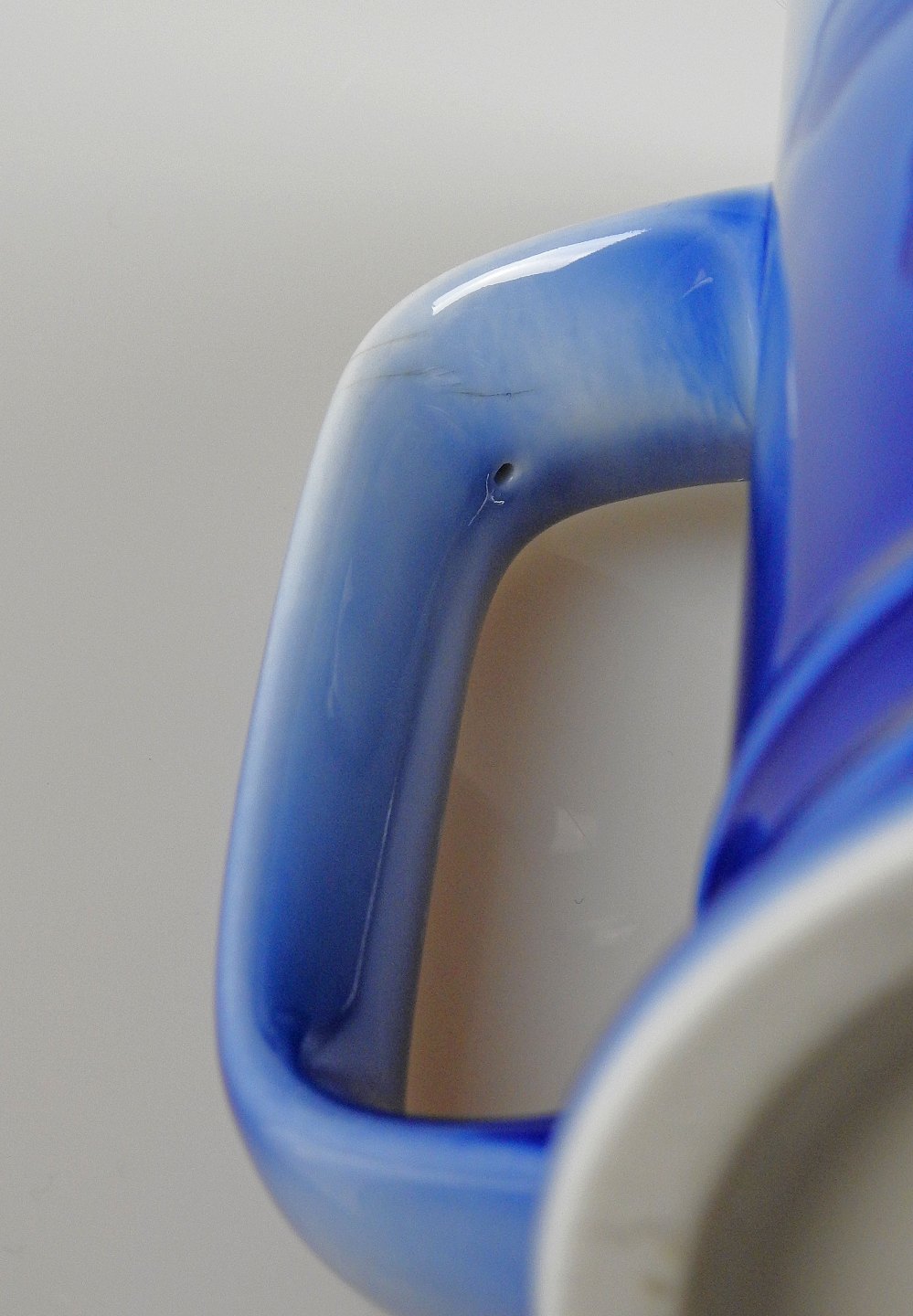 Krakkelering i glasuren ved hanken ellers intakt.