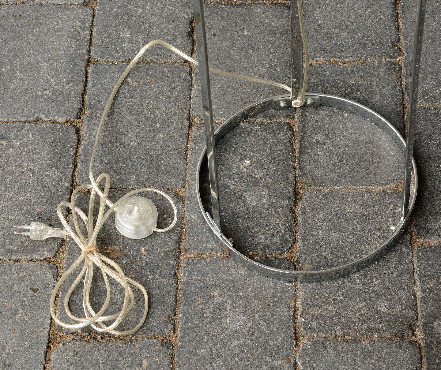 Lampenfod af blankpoleret metal med skærm af strenge af perlemorskaller.