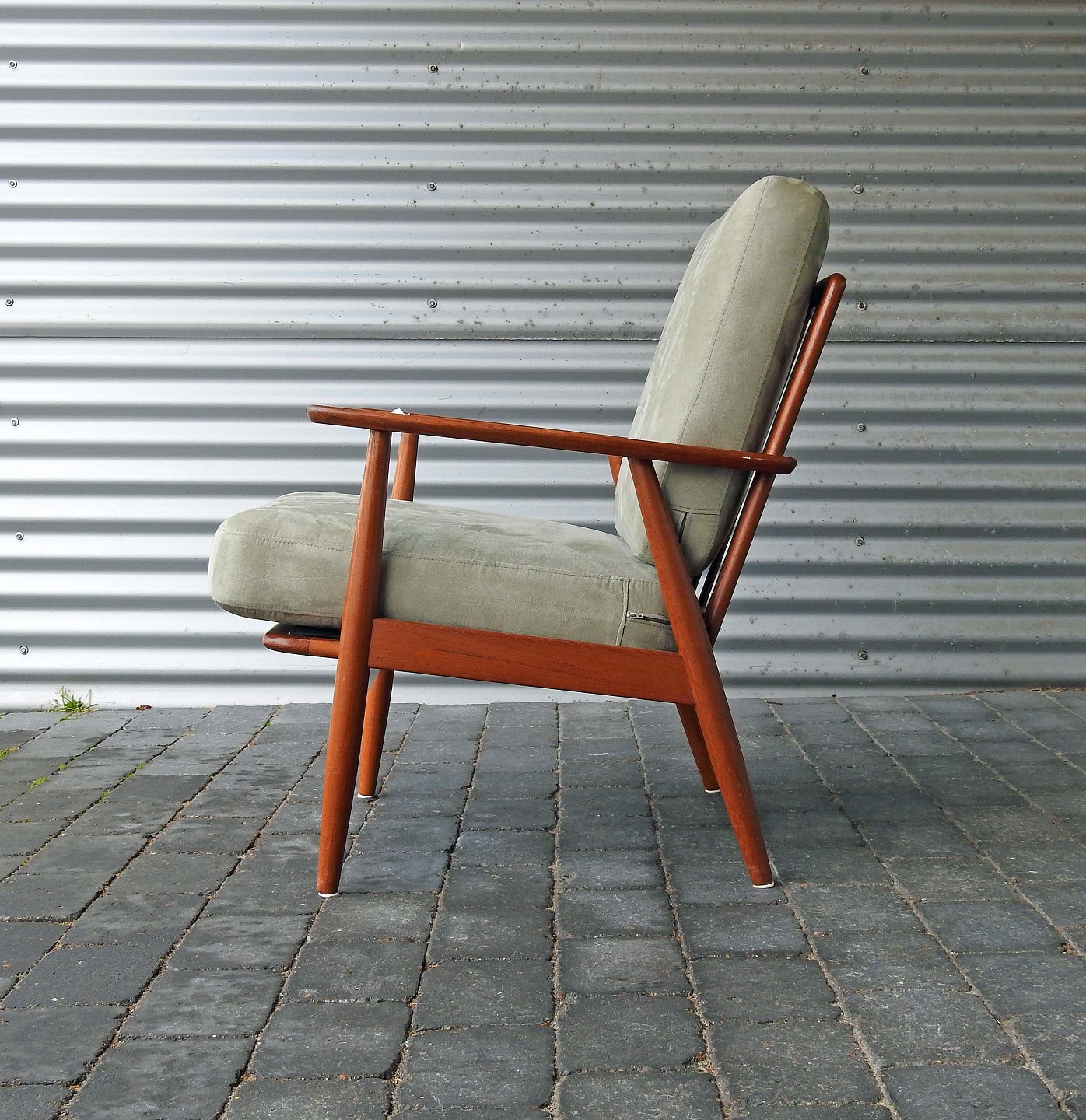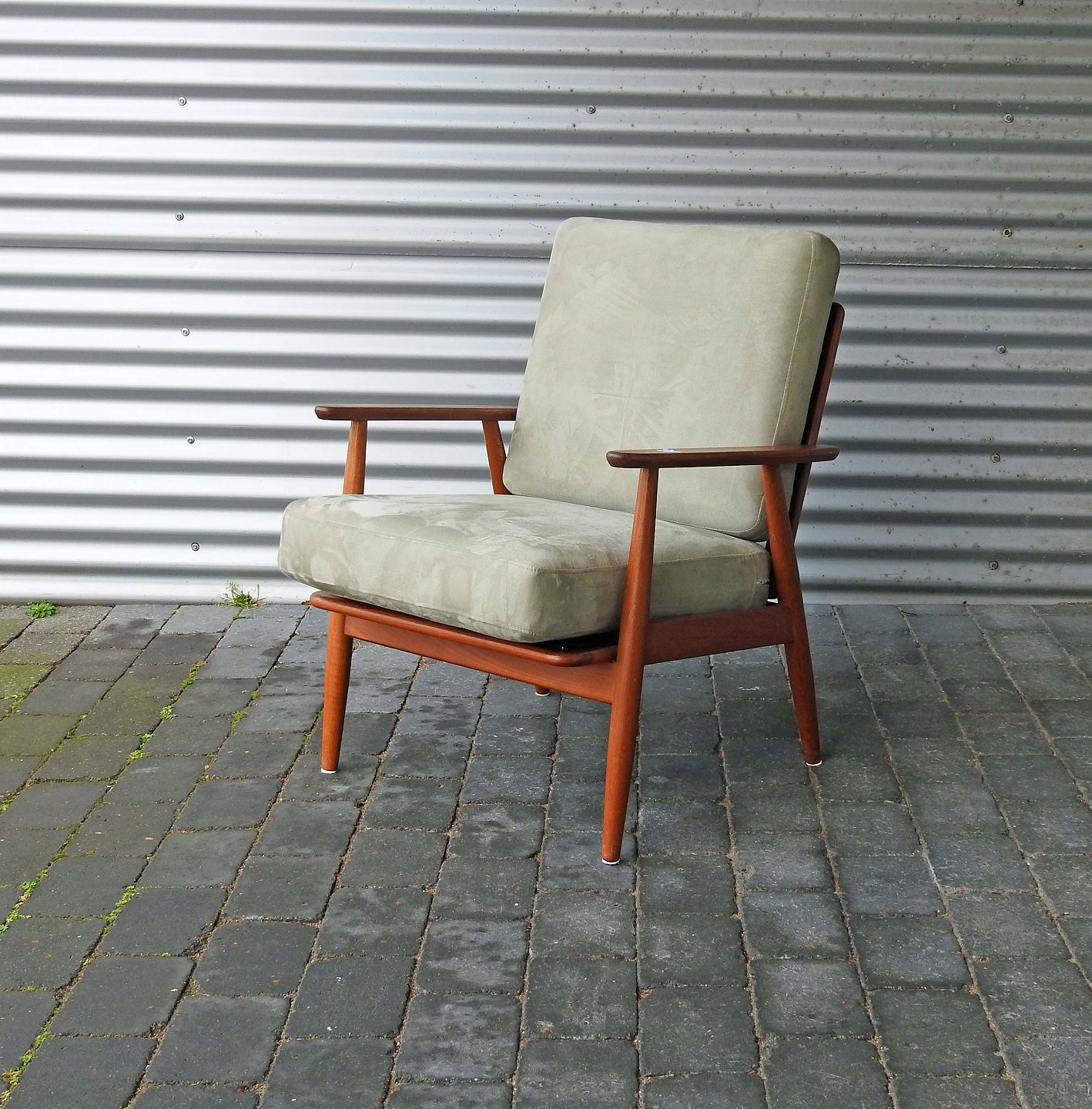 Lænestol i teaktræ med polstret sæde med gråt stofbetræk, betræk og polstring i god stand.