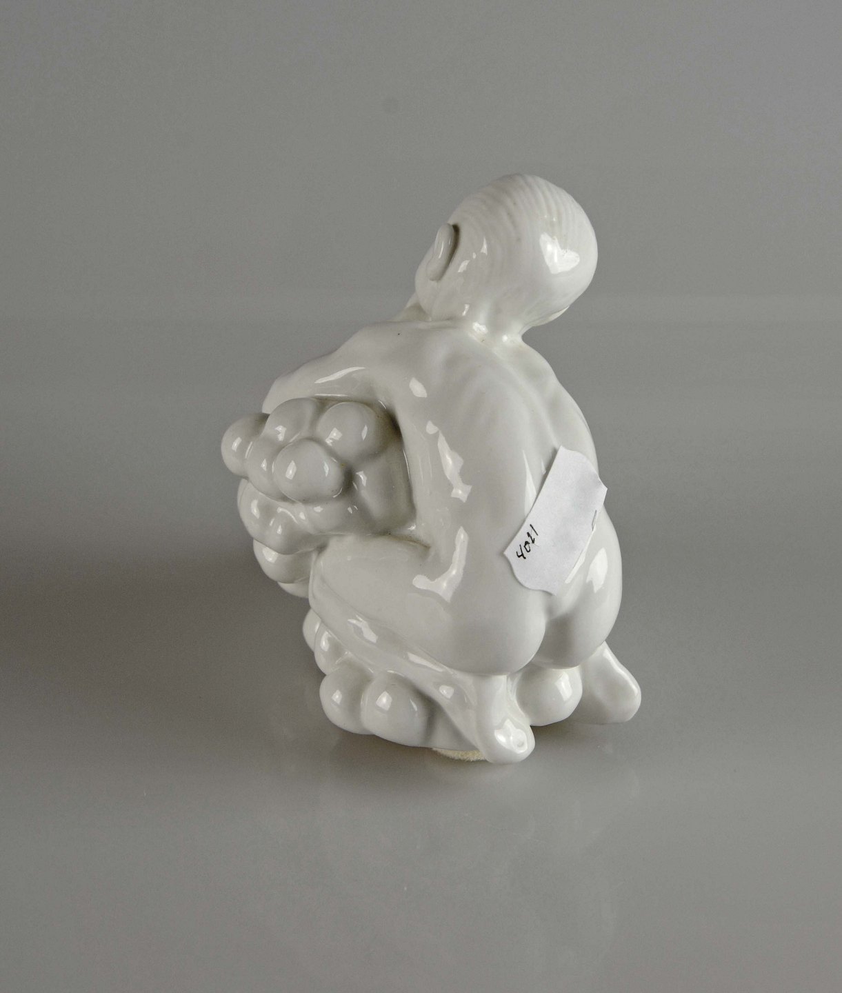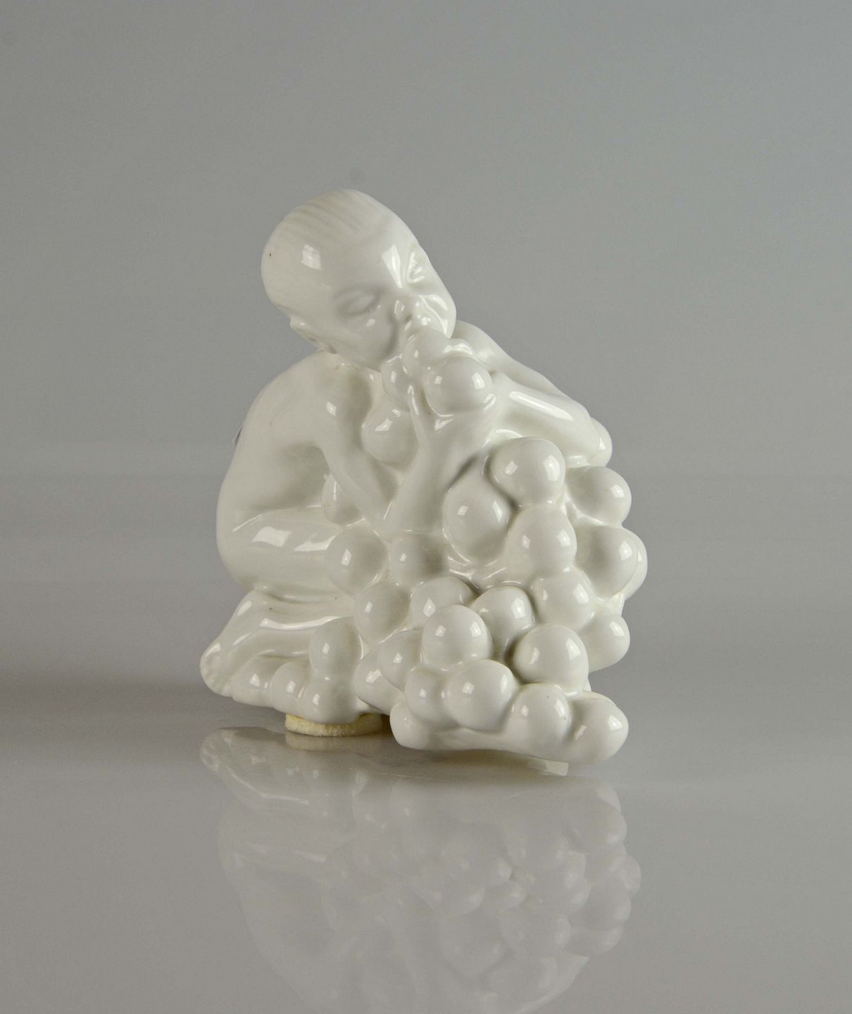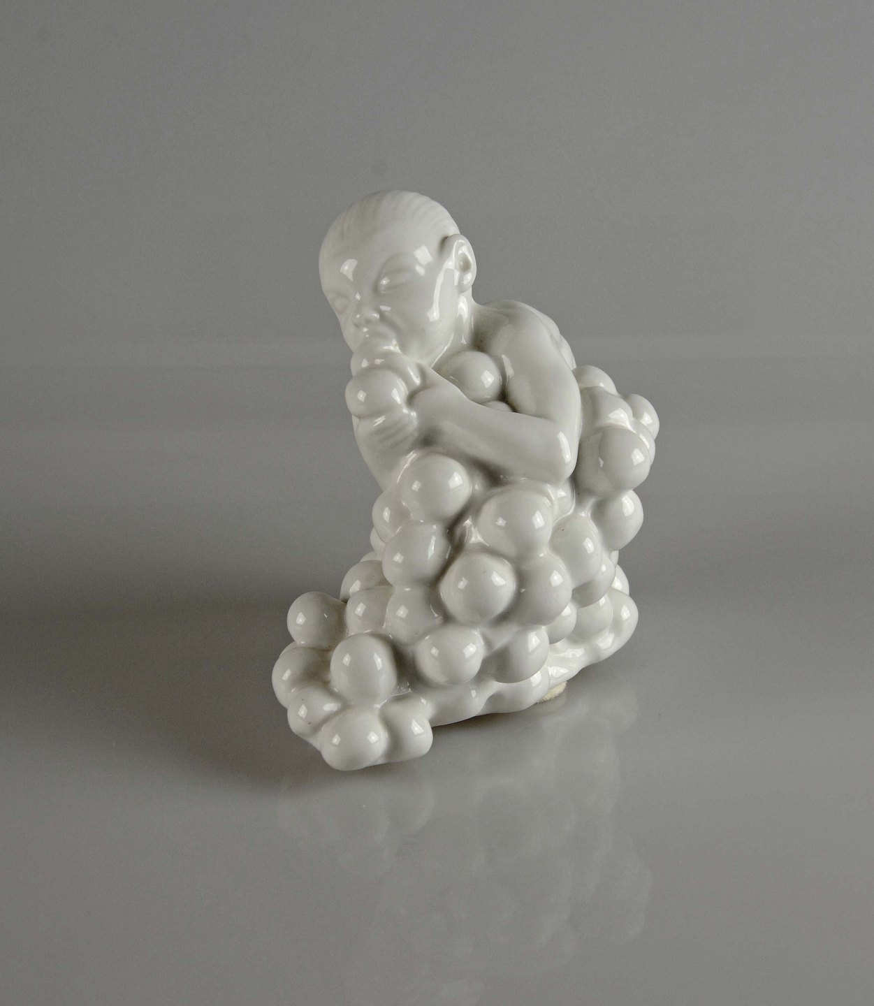 Figur i hvid porcelæn med motiv af dreng med druer