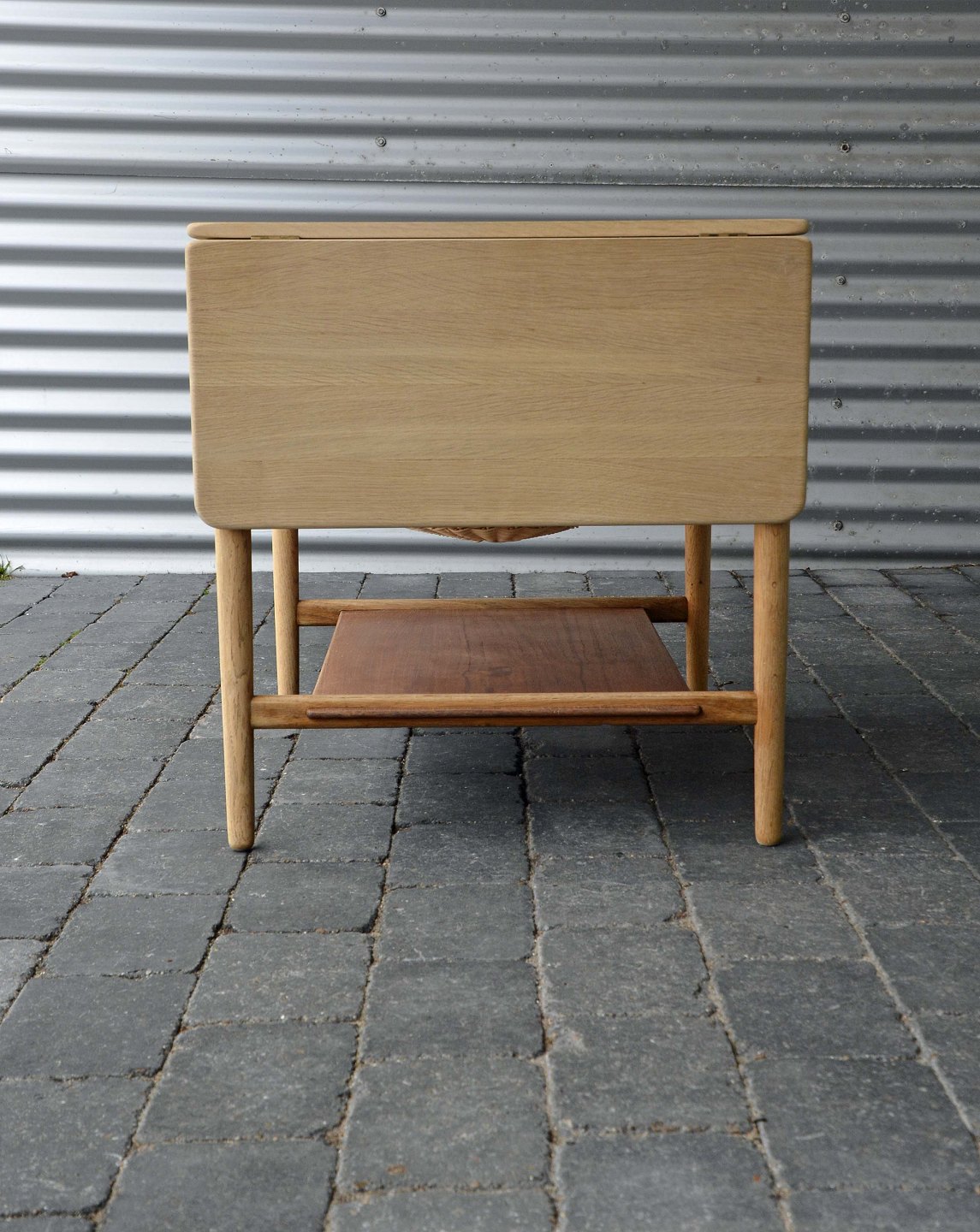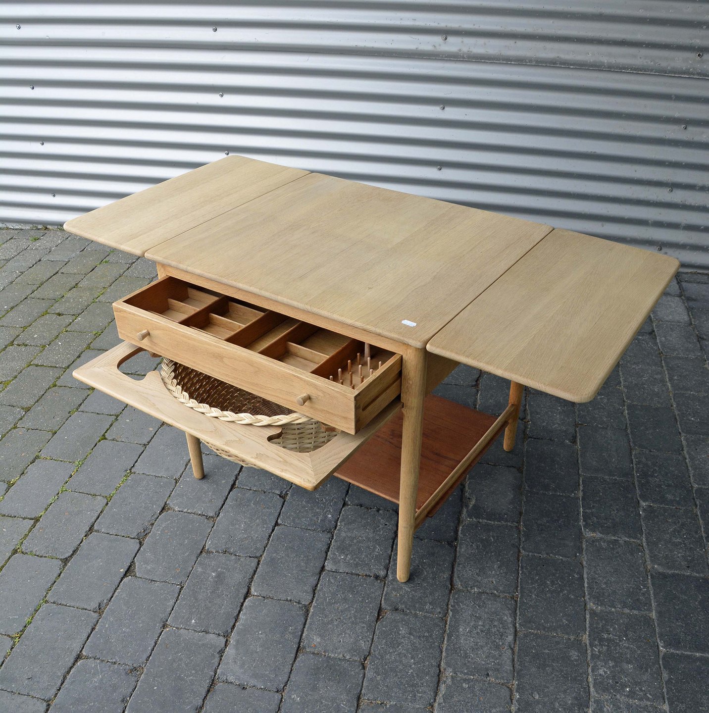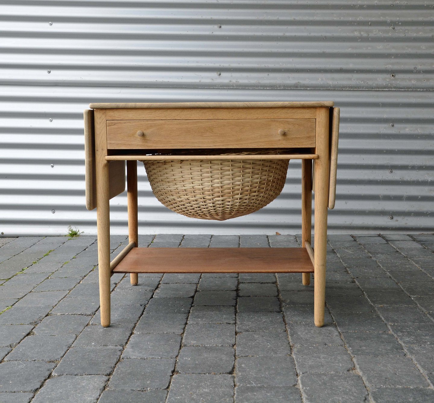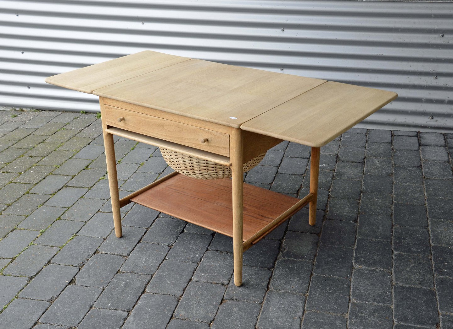 Sybord i egetræ med fletkurv, skuffe og to klapplader. Underhylde i teak.