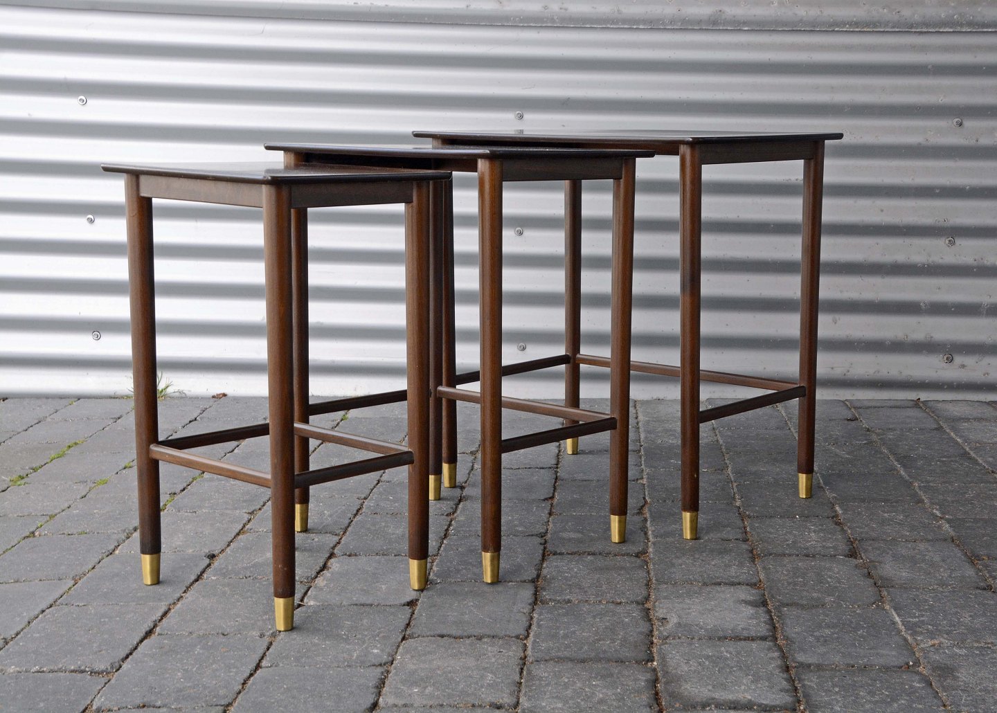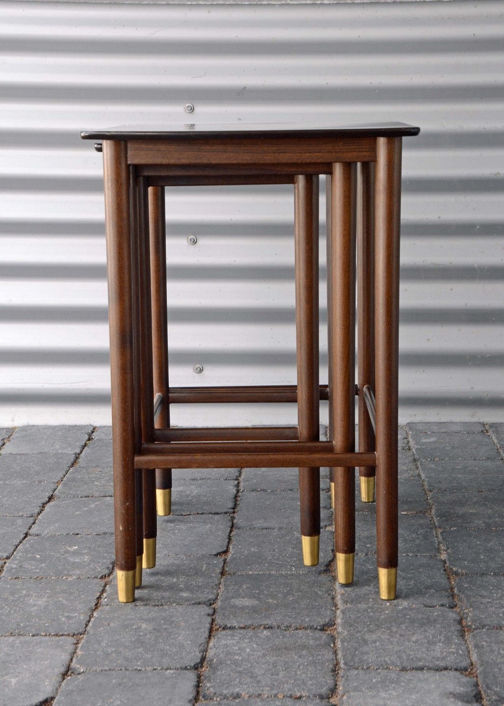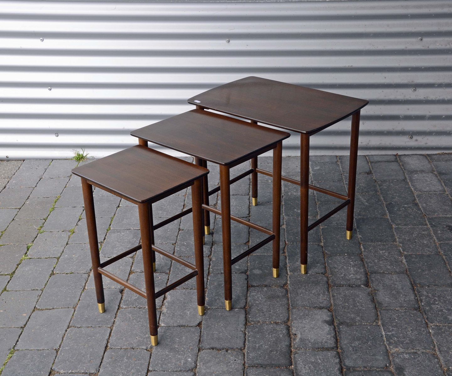 Et sæt indskudsborde i lakeret massivt træ med messingfod. Stellet er lavet af bejdset bøgetræ.