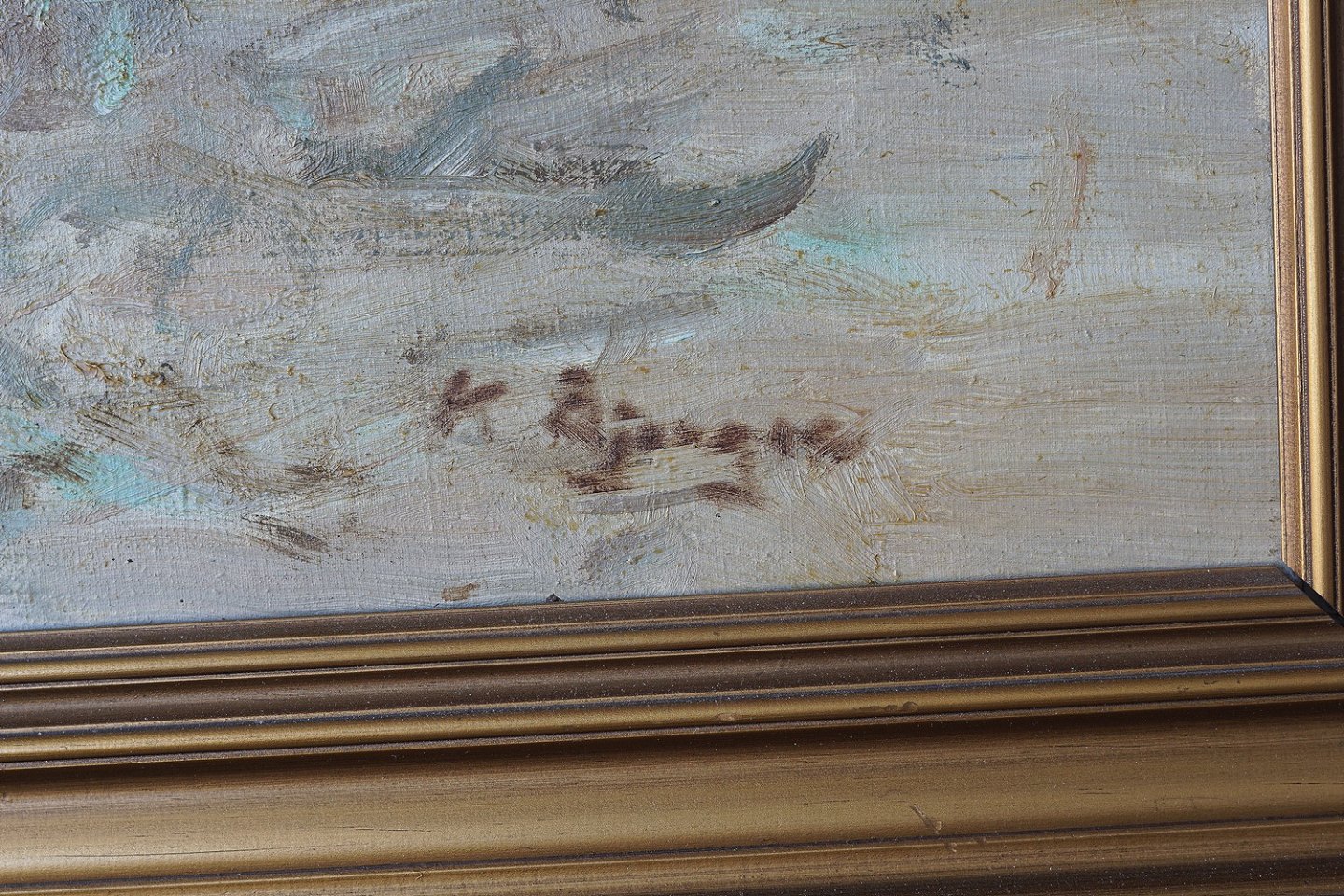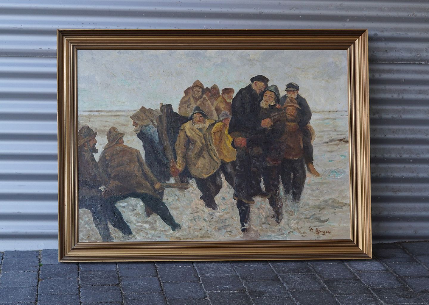 Maleri af Redningsaktion på strand, olie på lærred