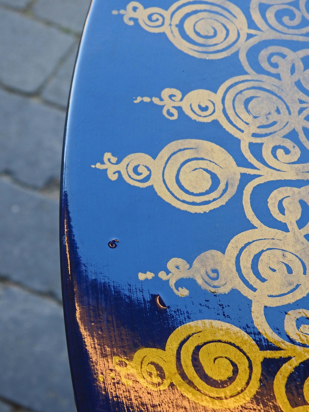 Rundt bord med mønstret bordplade i gylden, blå og grønne nuancer