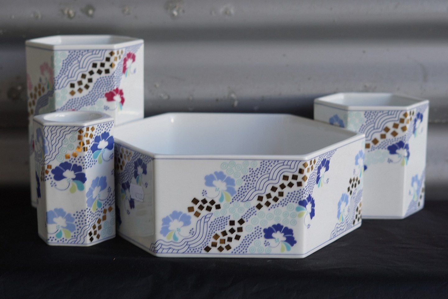 6-kantet fyrfadsstage (1817/5465). Porcelæn dekoreret med trykt motiv og guld