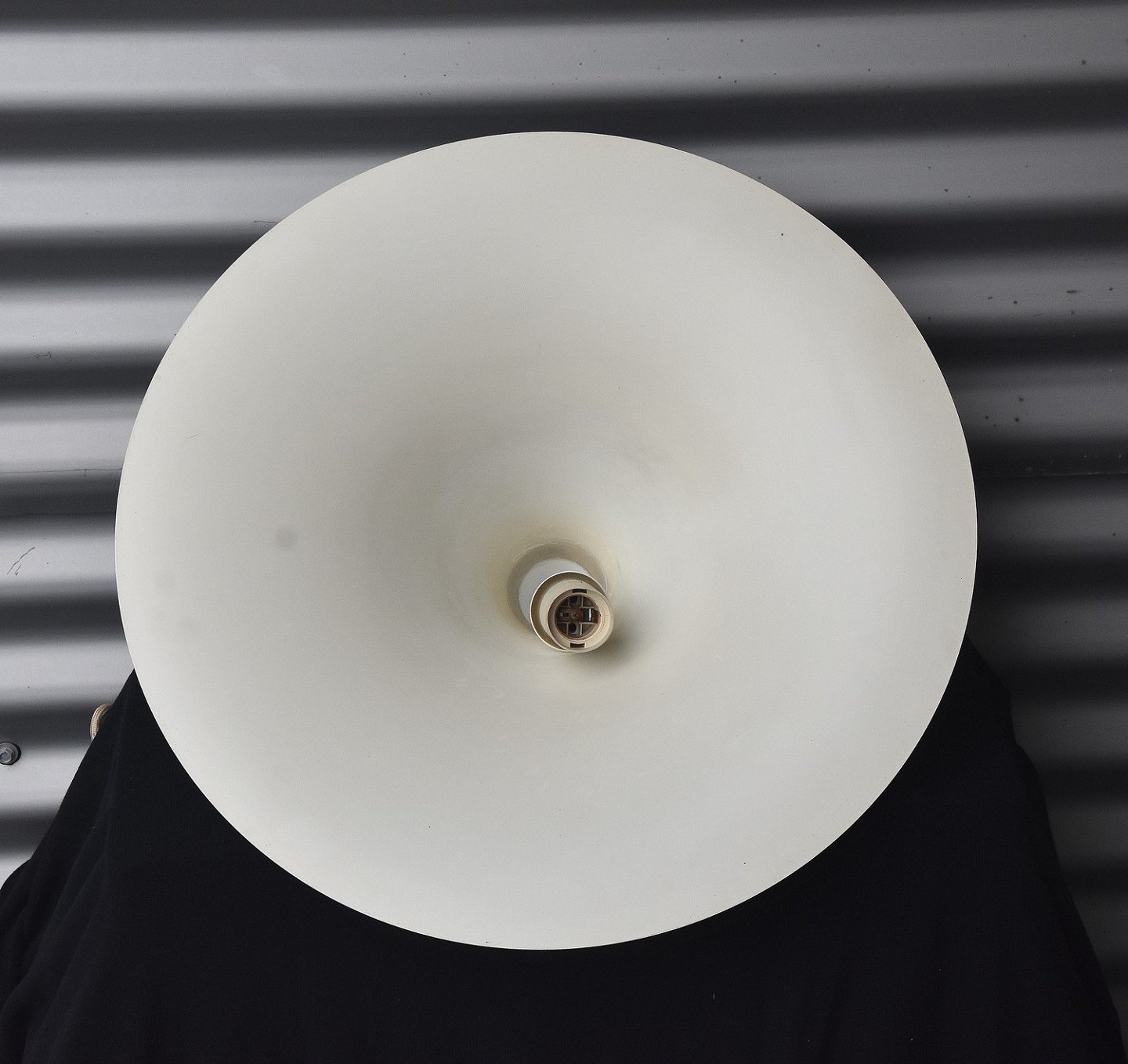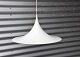 Høj hvid pendel, trompetlampe, semi-pendel. Dansk Vintage Design. Pendlen er lavet af metal
