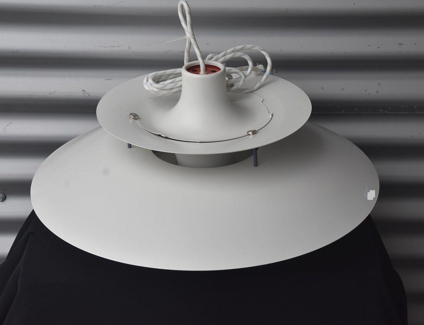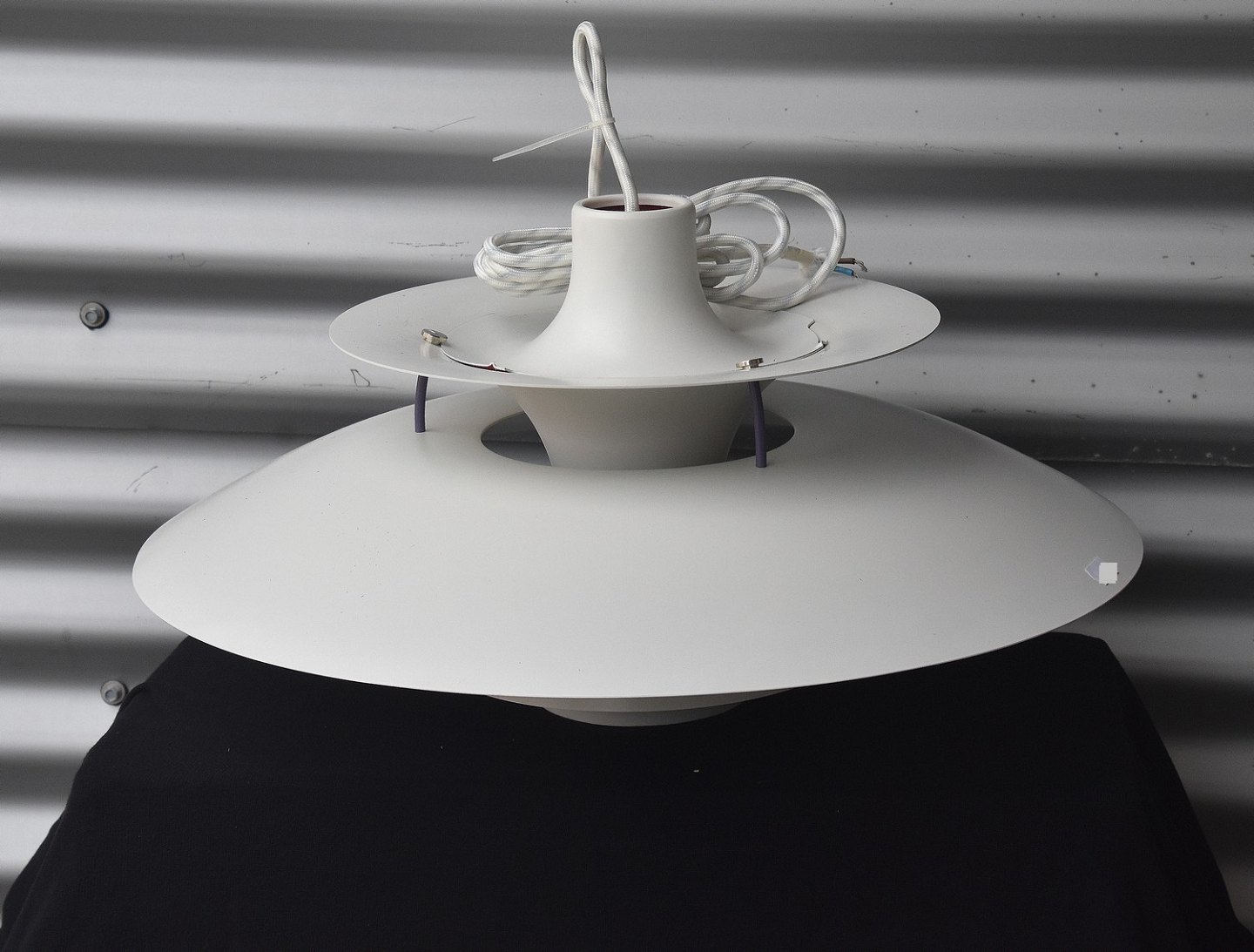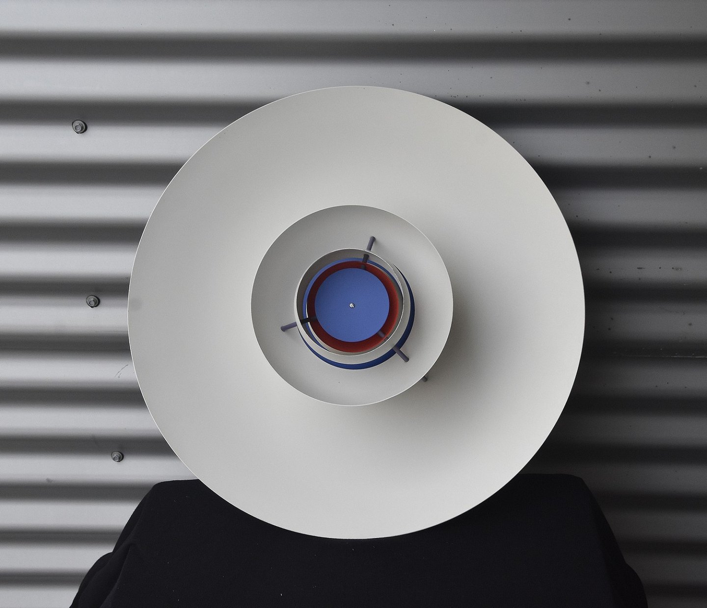 PH5 pendel med hvid yderskærm og blå/lilla inder skærm.