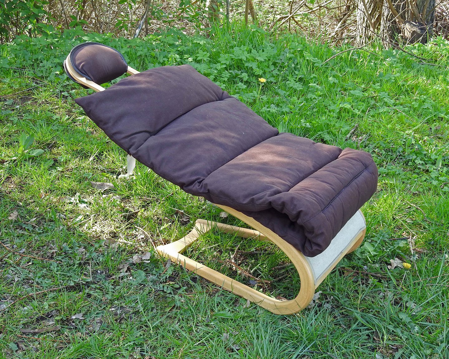 Frontal liggestol/hvilestol fra start 1980érne med stel i lakeret bøg, pude og hynde