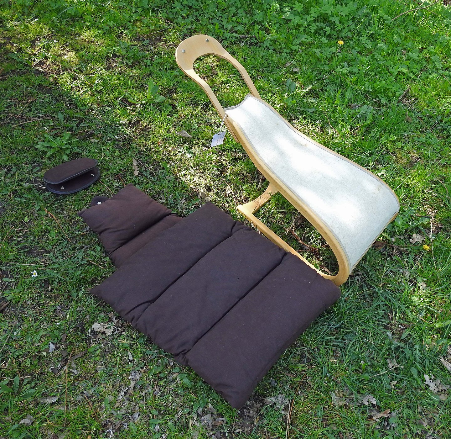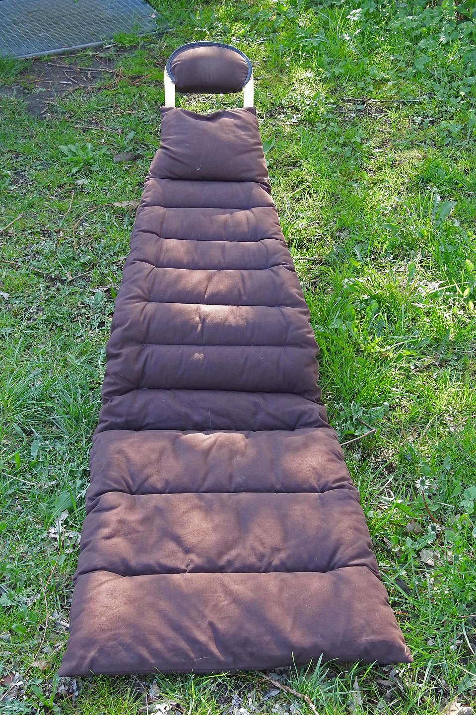 Stolen har en regulerbar hovedstøtte og polstret pude og lang hynde i brunt stof. Både pude og hynde kan afmonteres stolen.