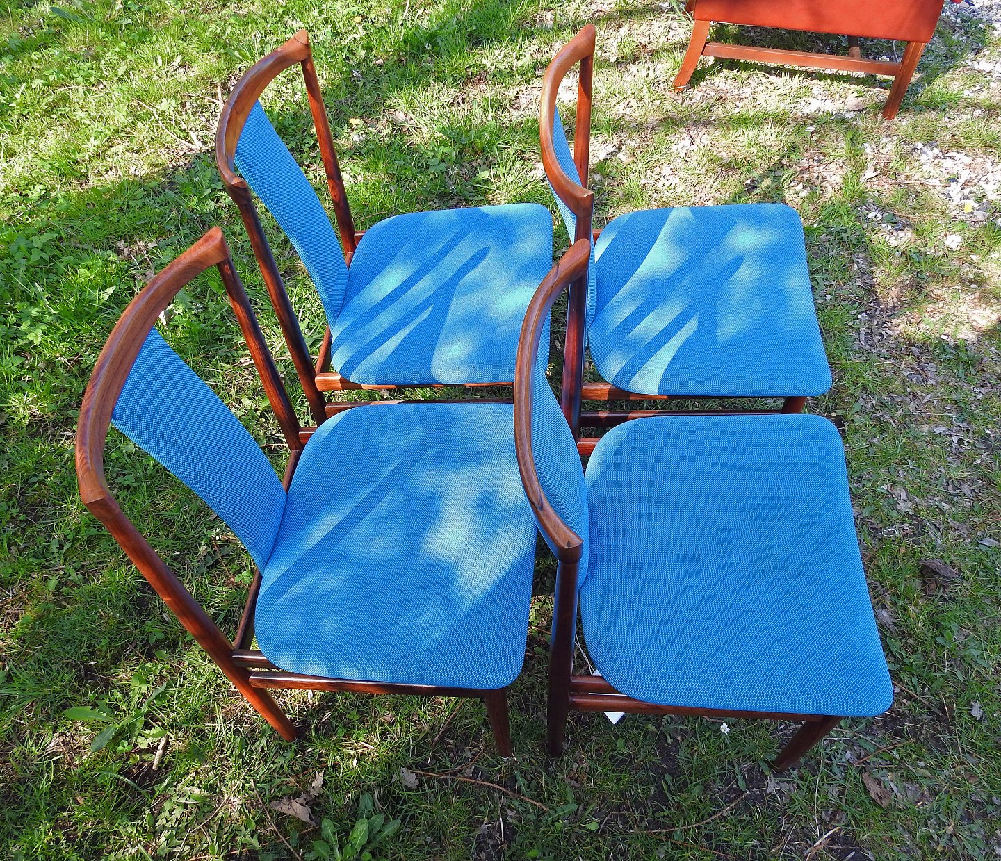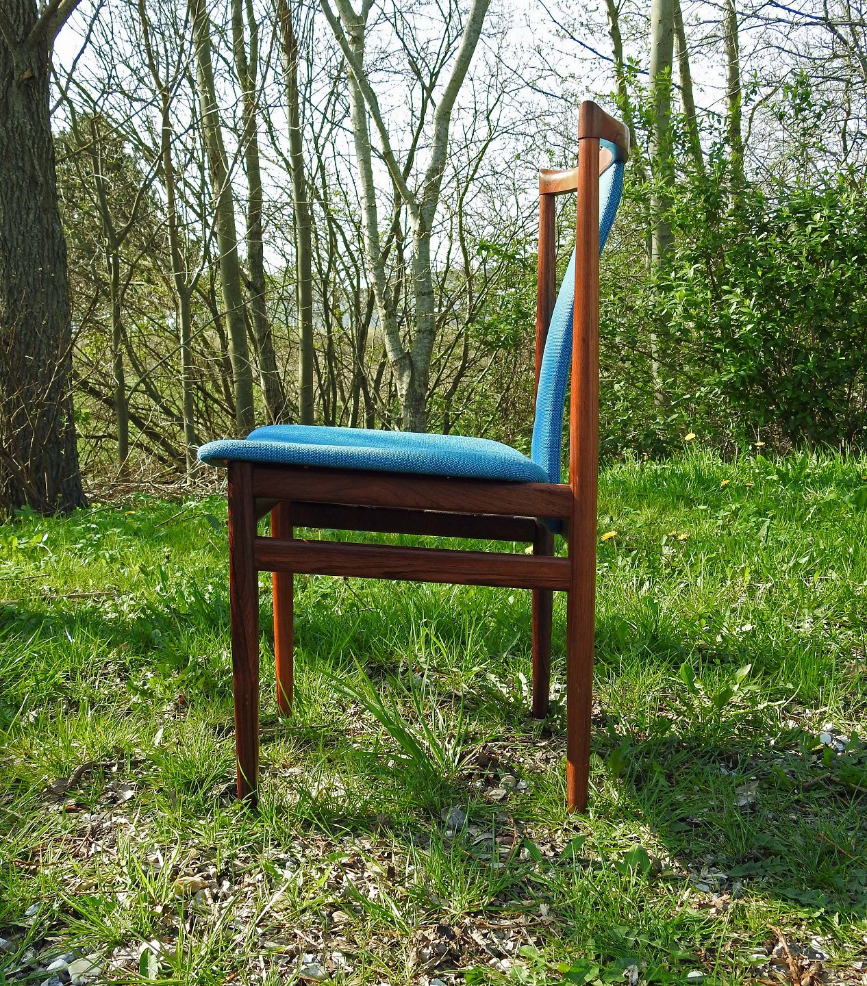 Et sæt på 4 stole i palisander med turkis stofbetræk på ryg og sæder
