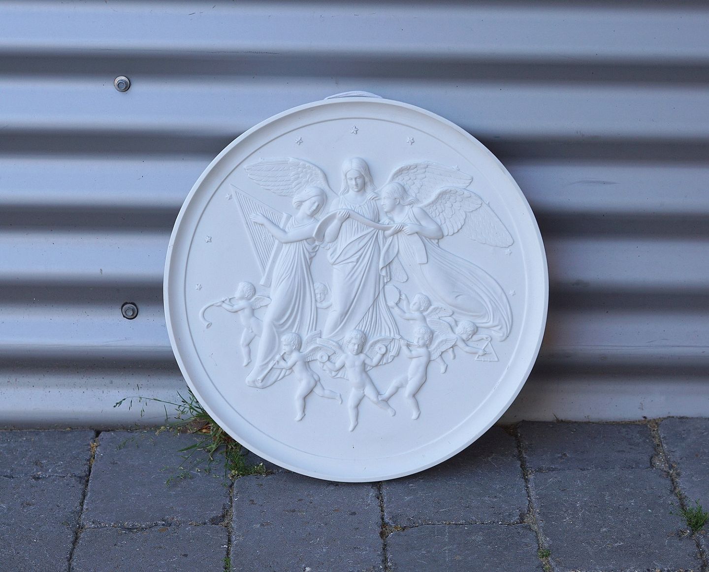 Bisquit platte med engle der spiller harpe. Motivet er lavet af Thorvaldsen