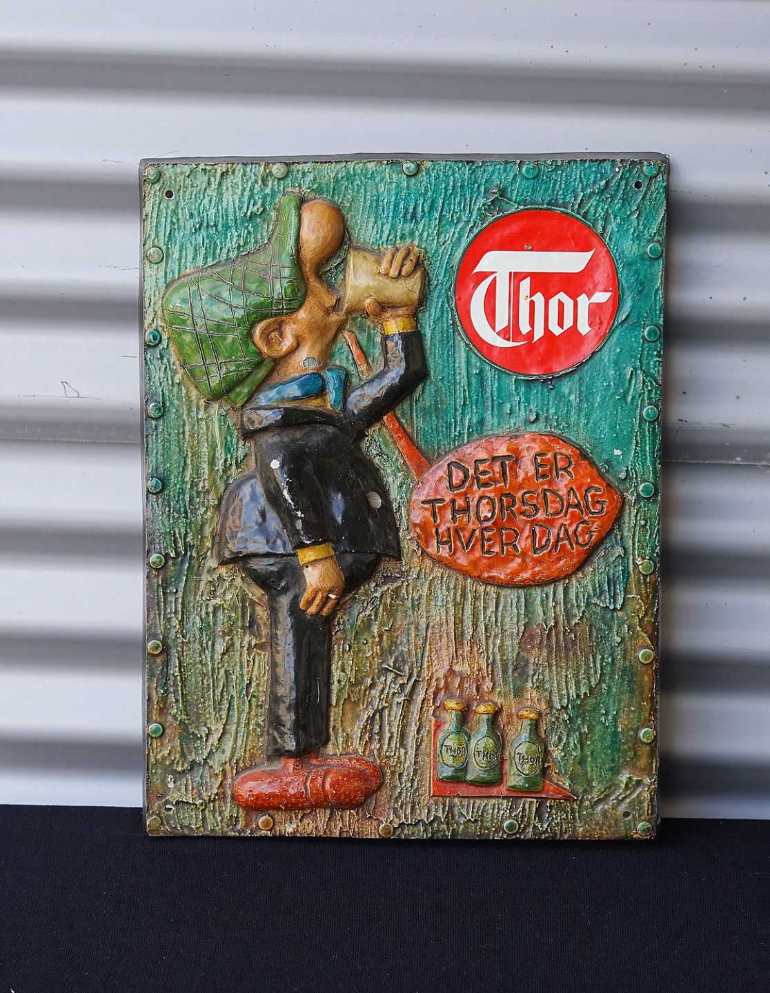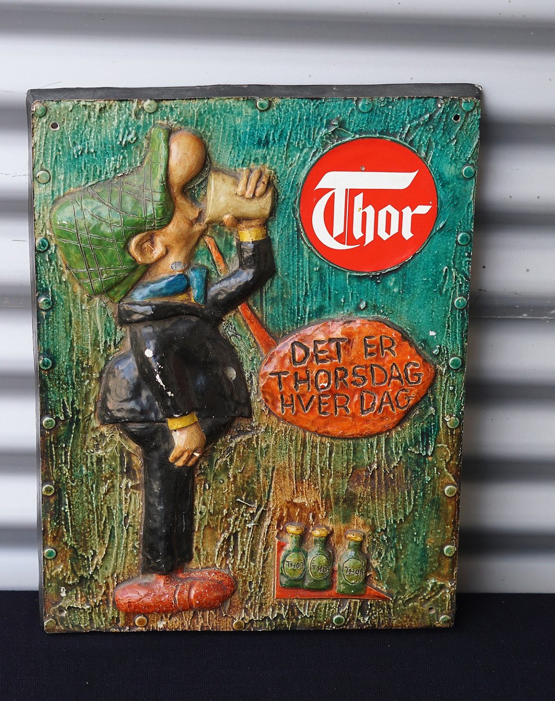 Klassiske reklameskilt, lak/oliemaling på metal, Kasket Karl der reklamerer for Thor Bryggeri, Randers
