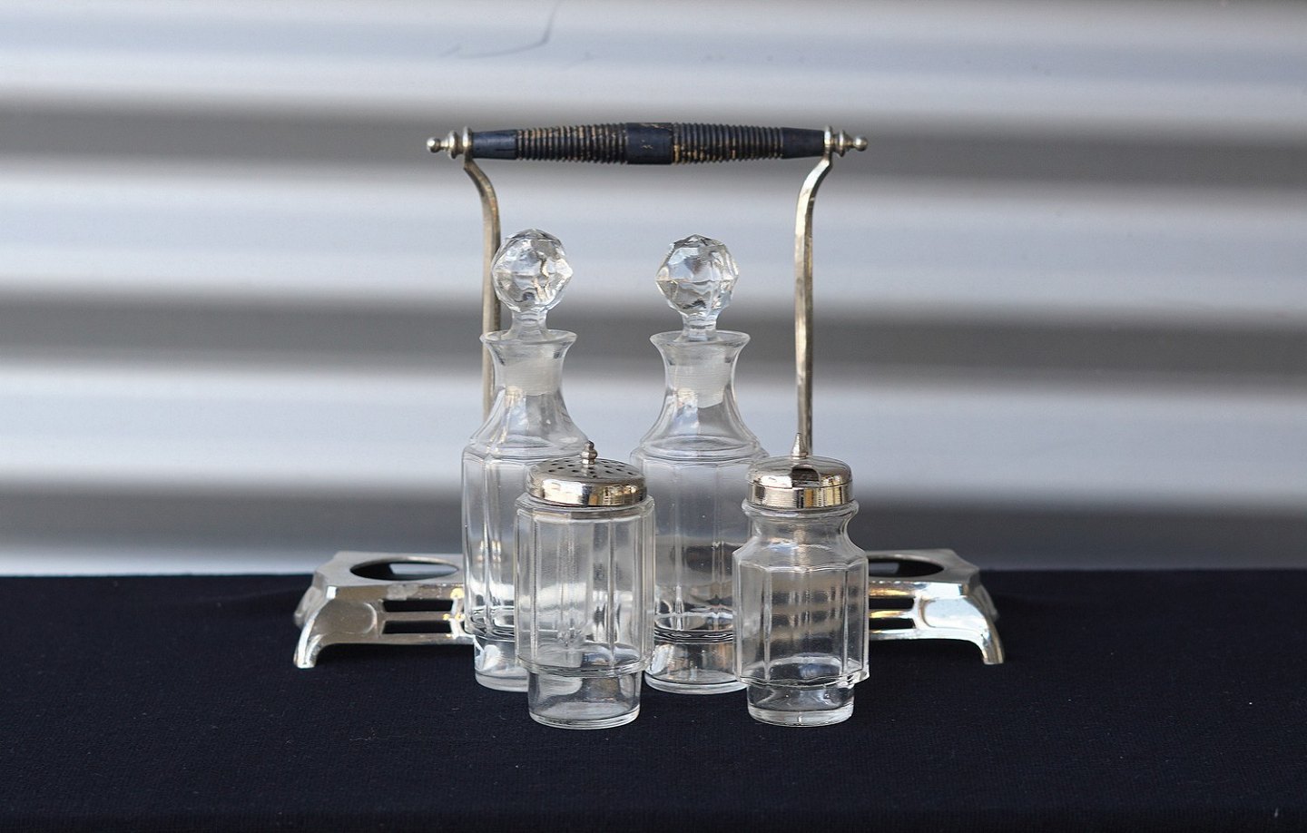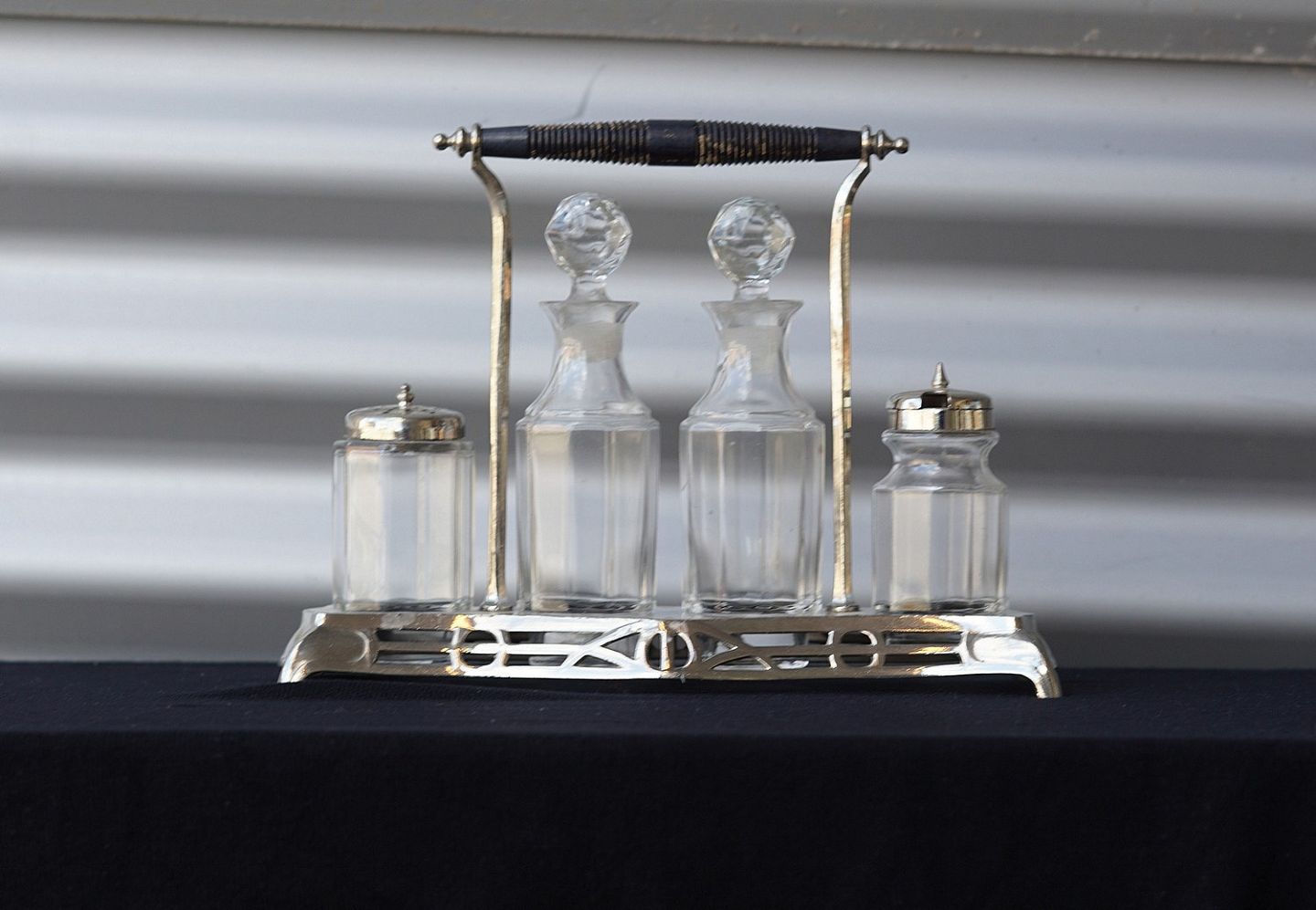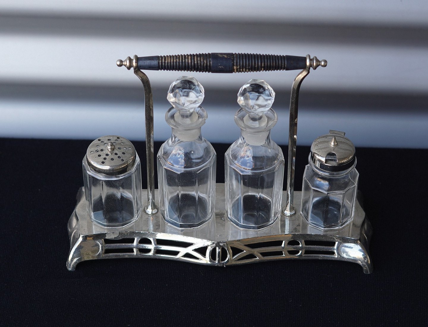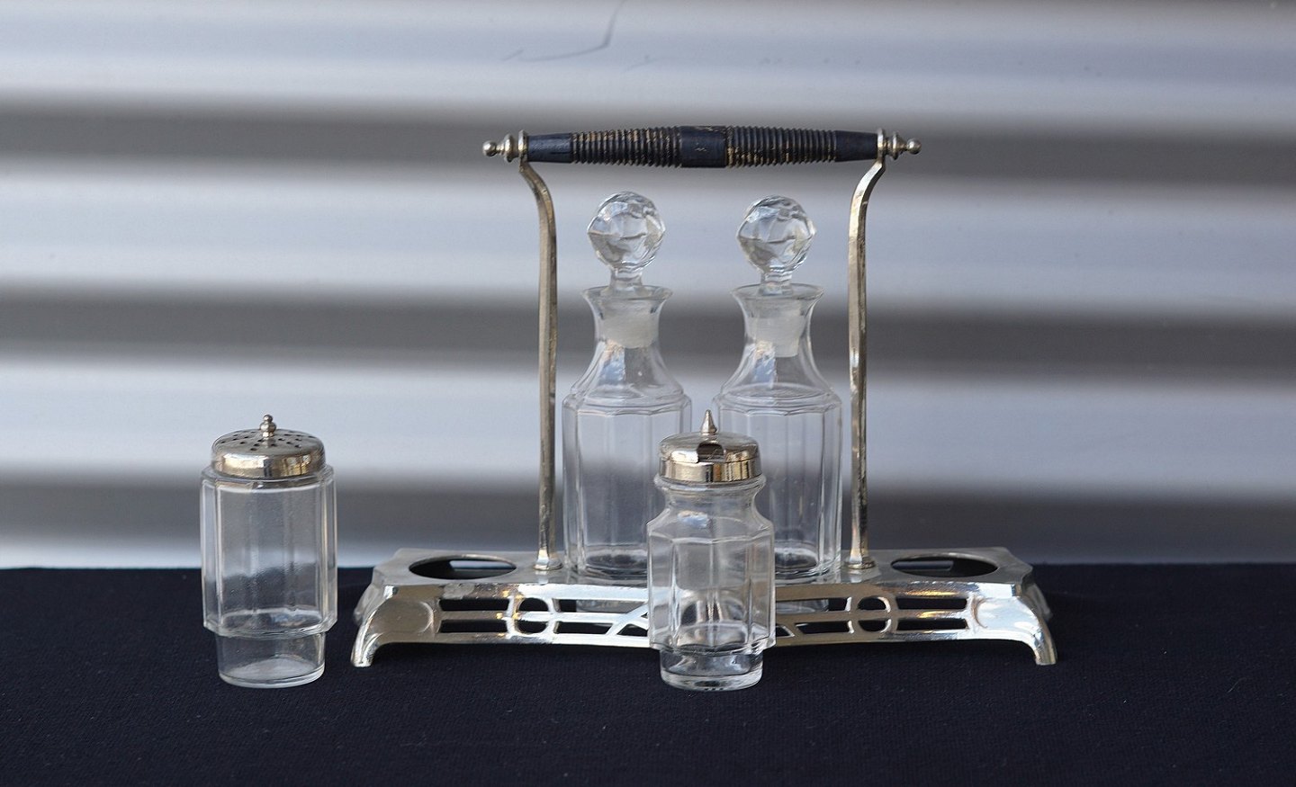 Jugendstil forsølvet platmenage med glas krukker. 1 flaske til olie, 1 flaske til eddike , 1 krukke til sennep og 1 strødåse