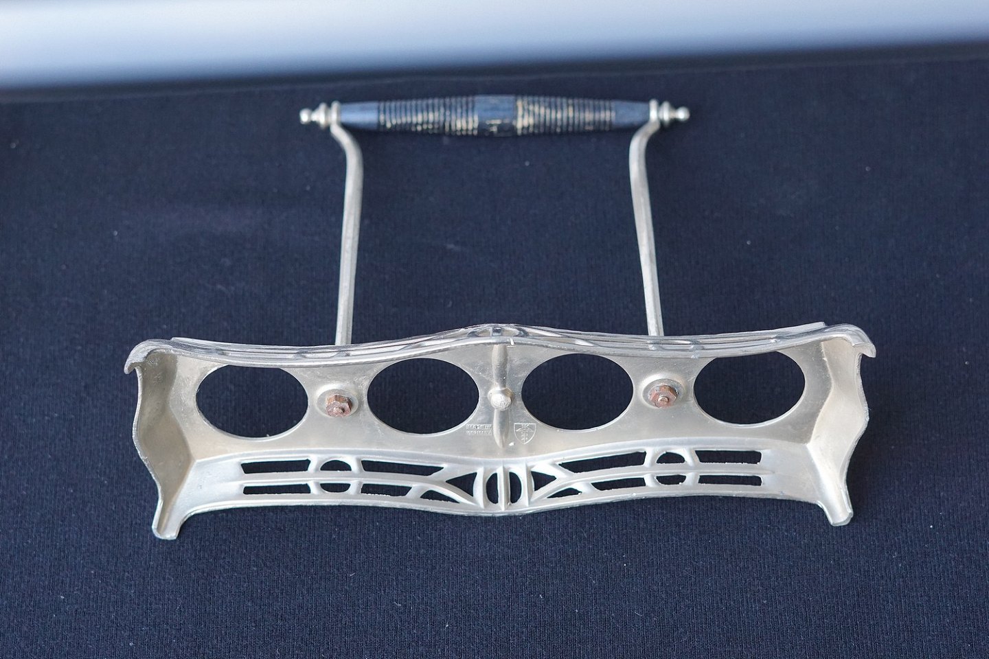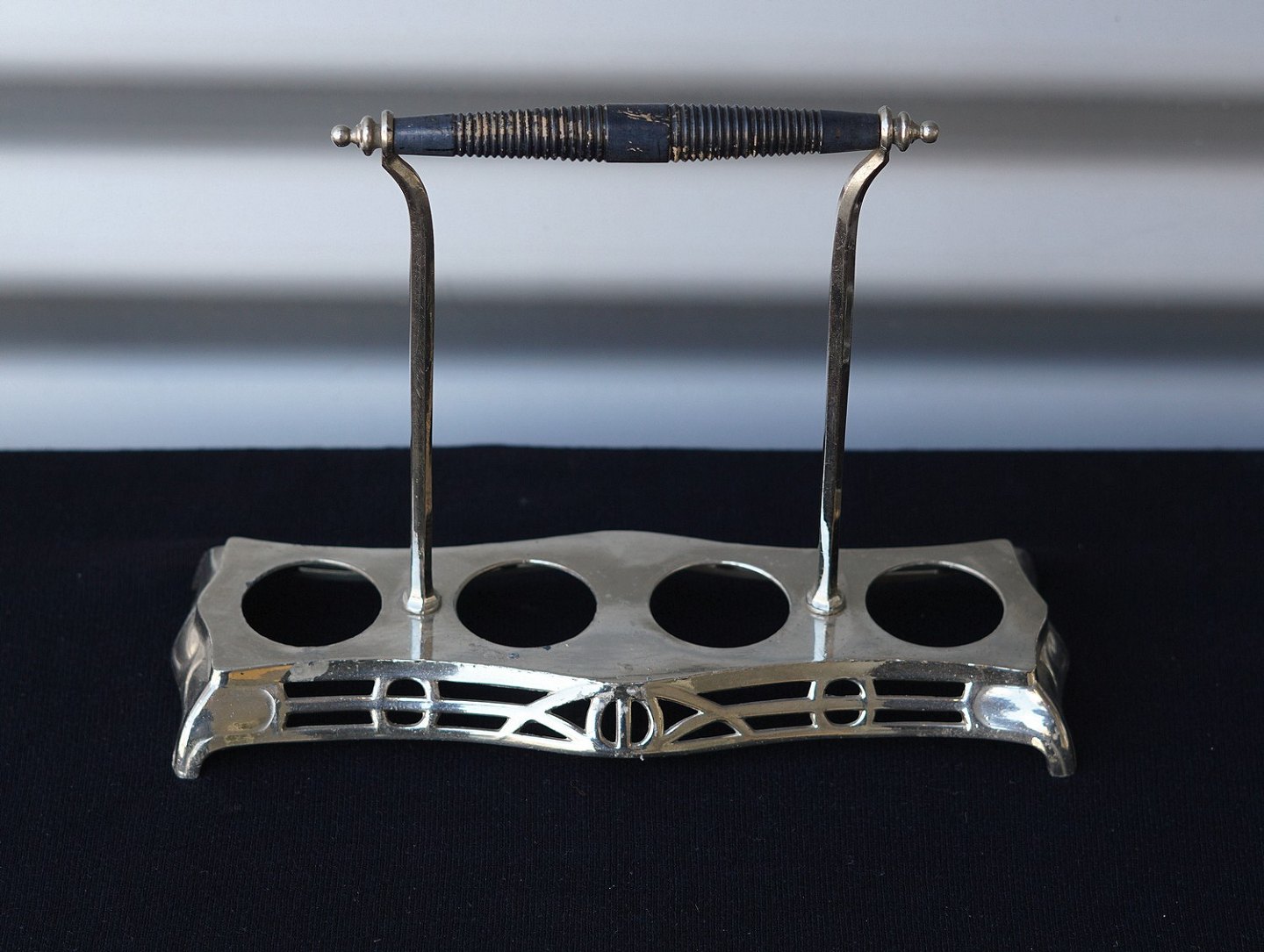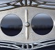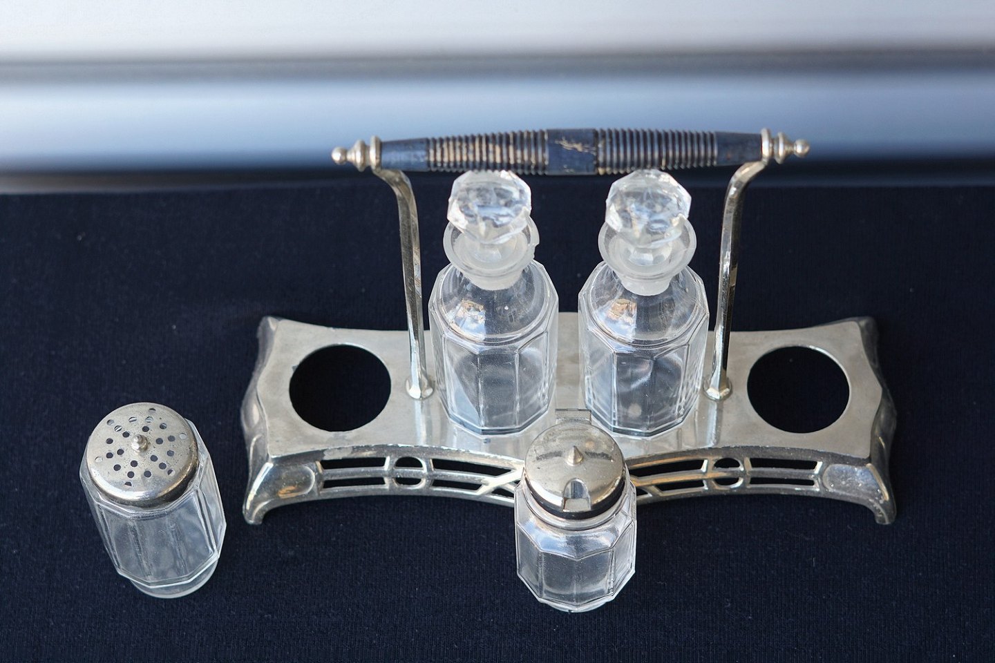 Jugendstil forsølvet platmenage med glas krukker. 1 flaske til olie, 1 flaske til eddike , 1 krukke til sennep og 1 strødåse