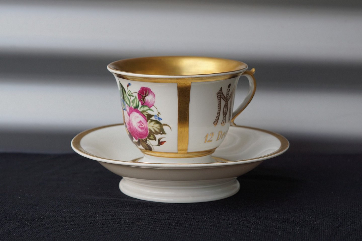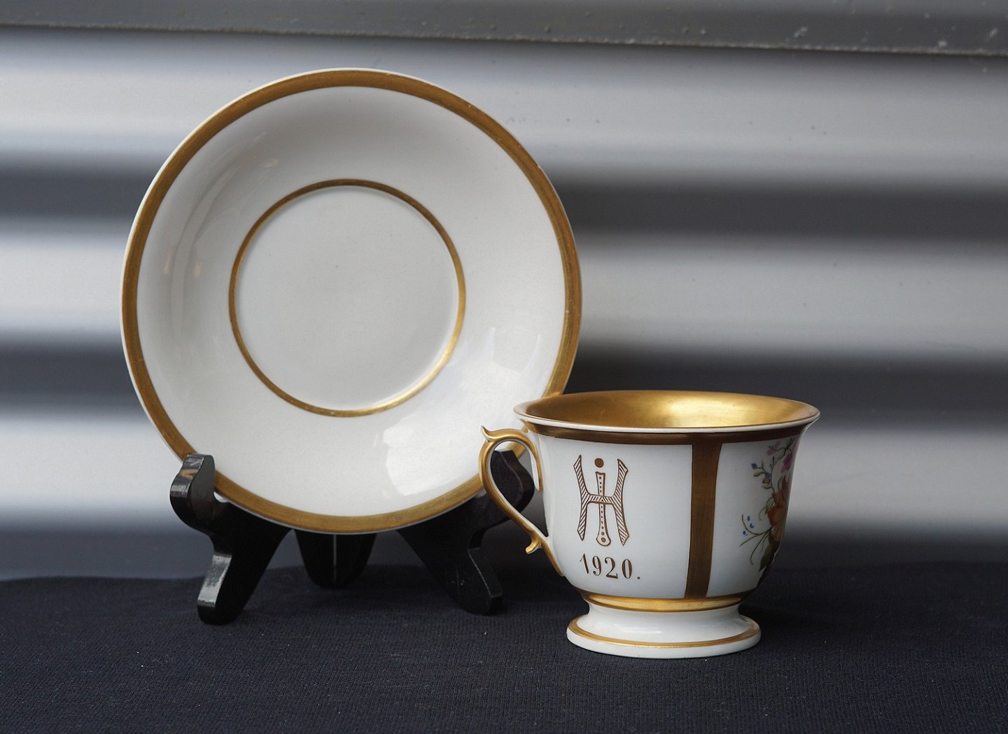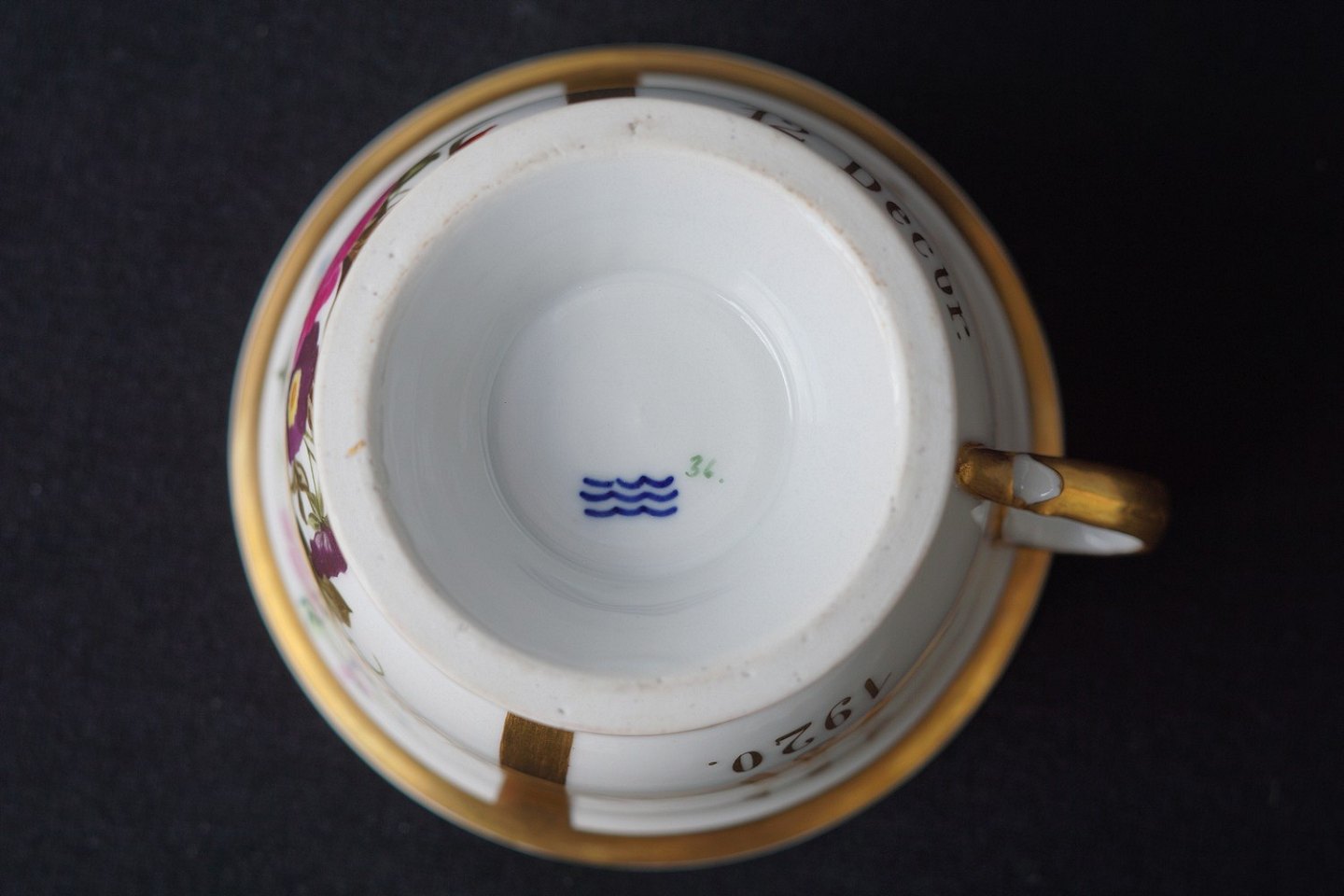 Stor kop dekoreret med blomster og årstal. Selve kop faconen er fra 1860-1880, men den er malet i 1920