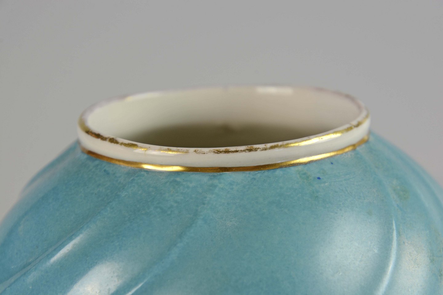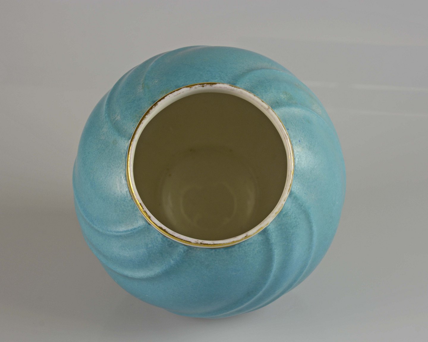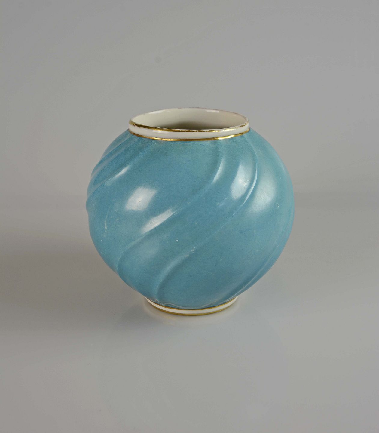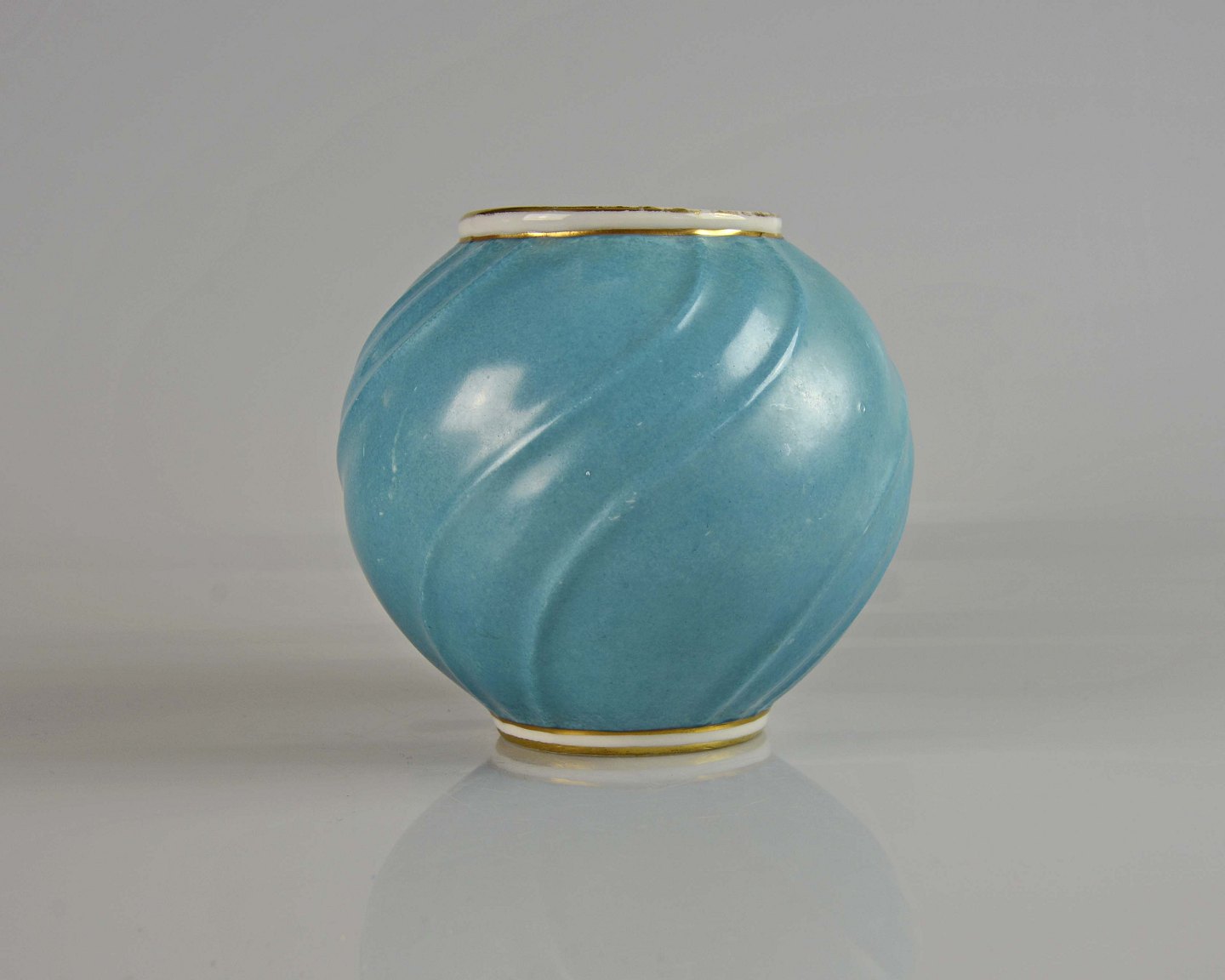 Sjælden rund svejfet vase i støvet blå farve med gyldne kanter