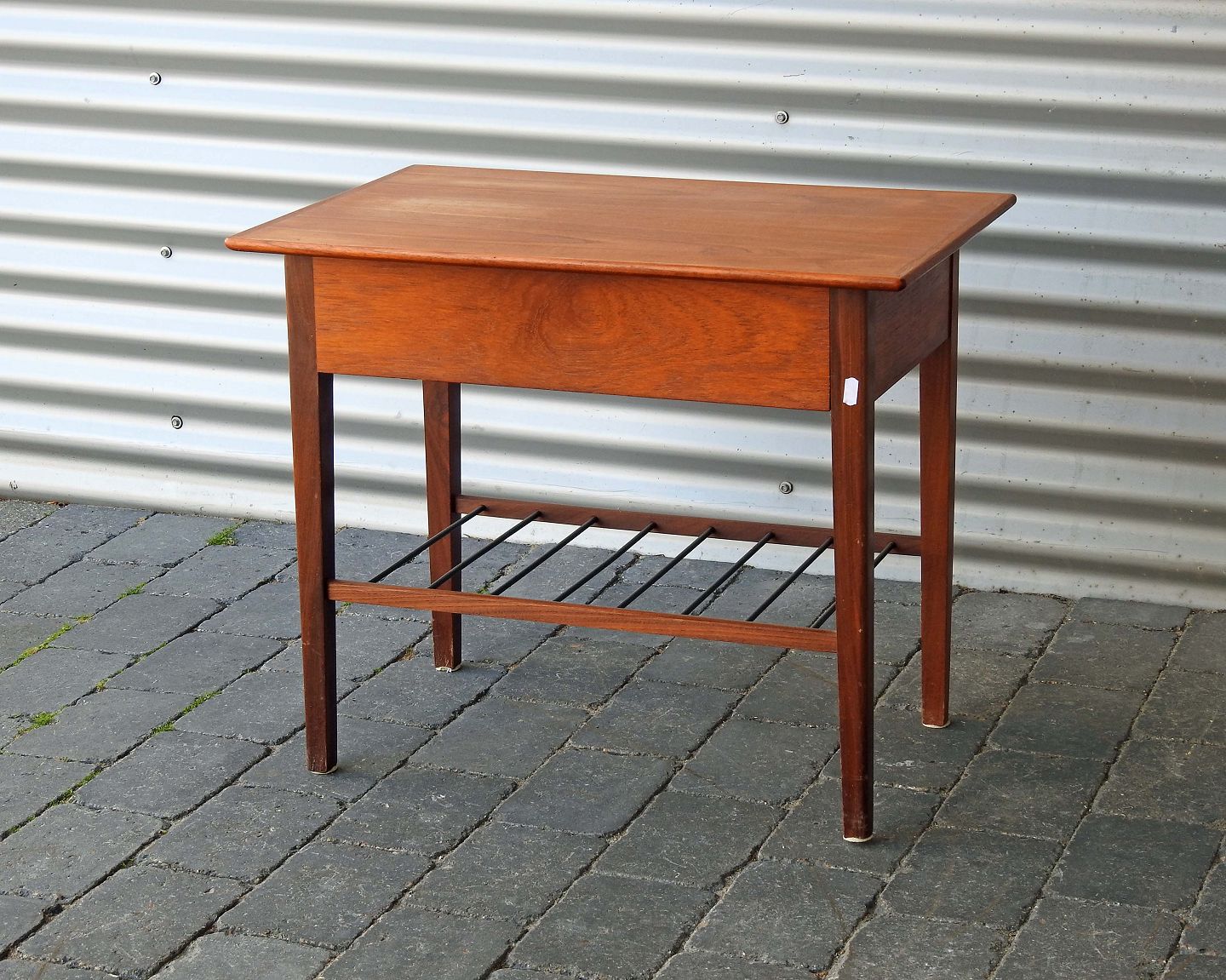 Sybord i teaktræ med tremmehylde og indsatskuffe