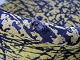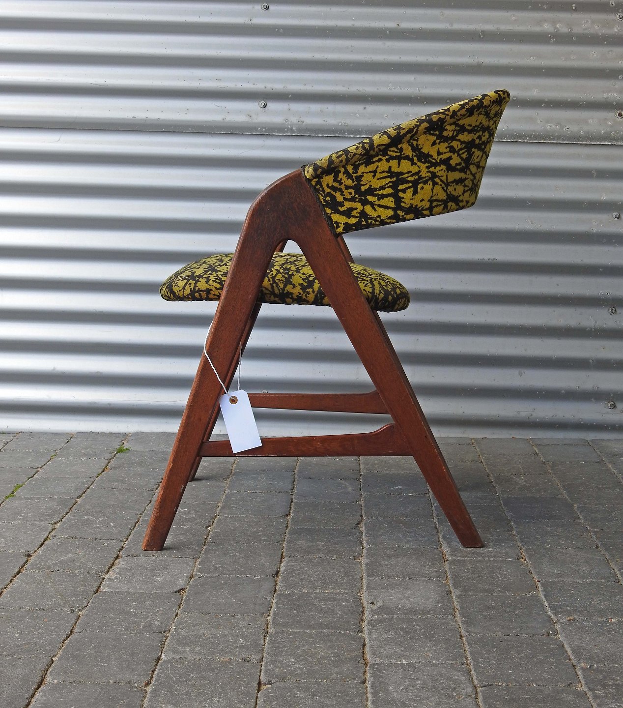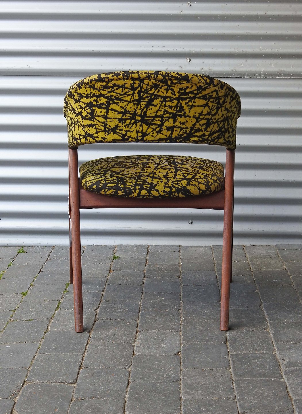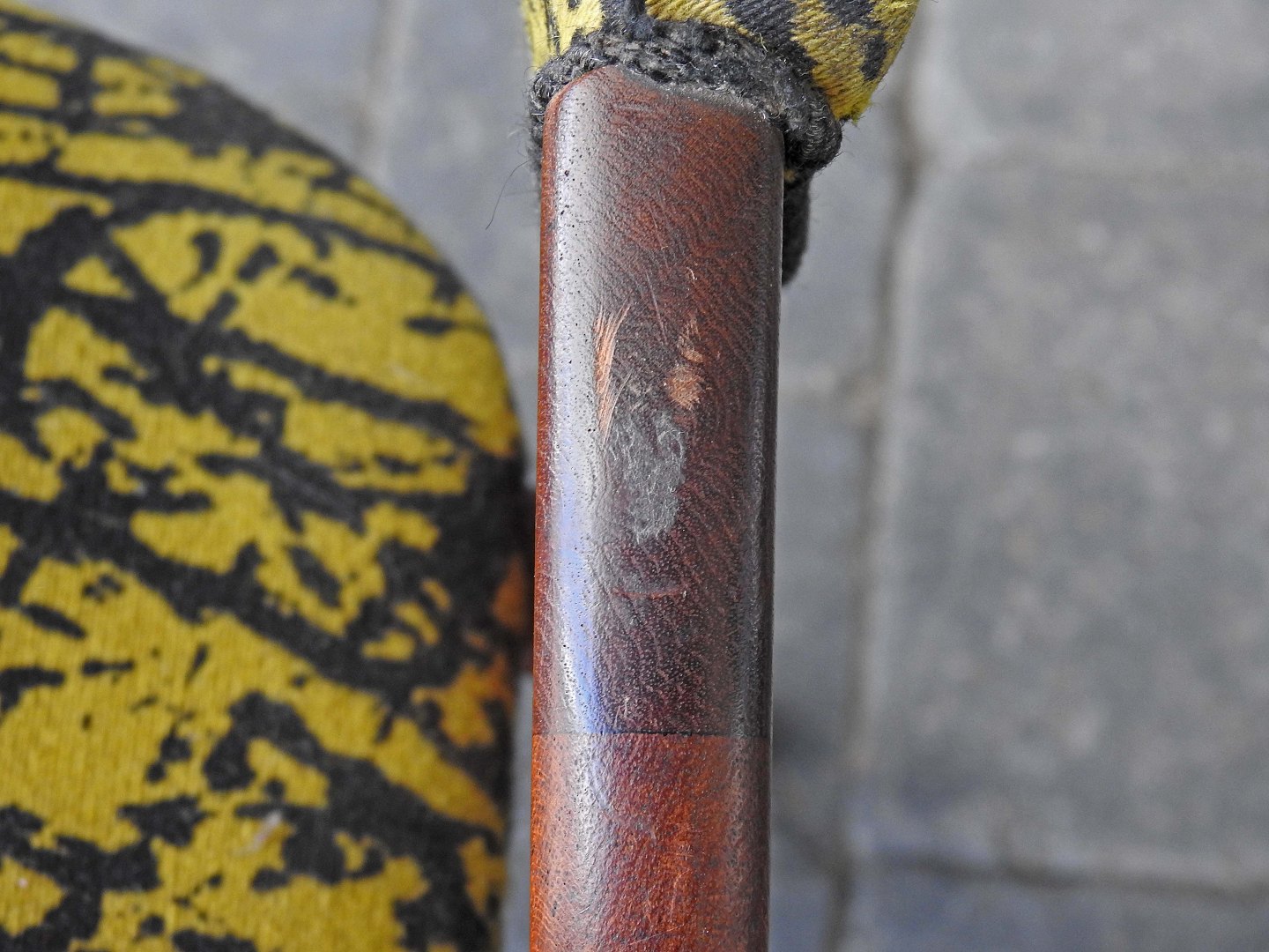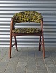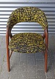 Stolen er betrukket med sort og gulmønstret stof