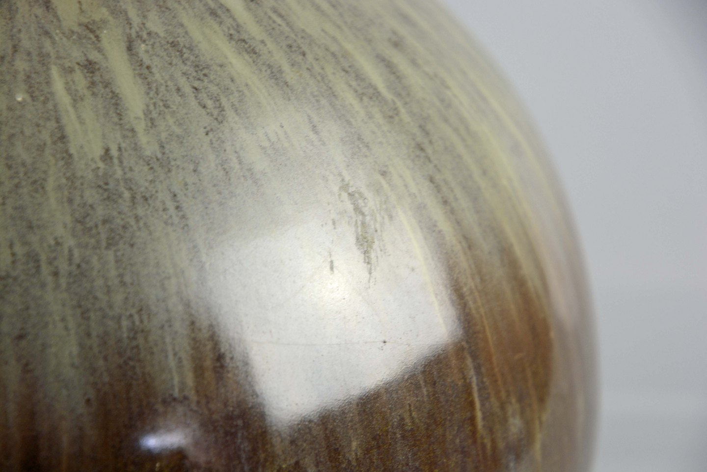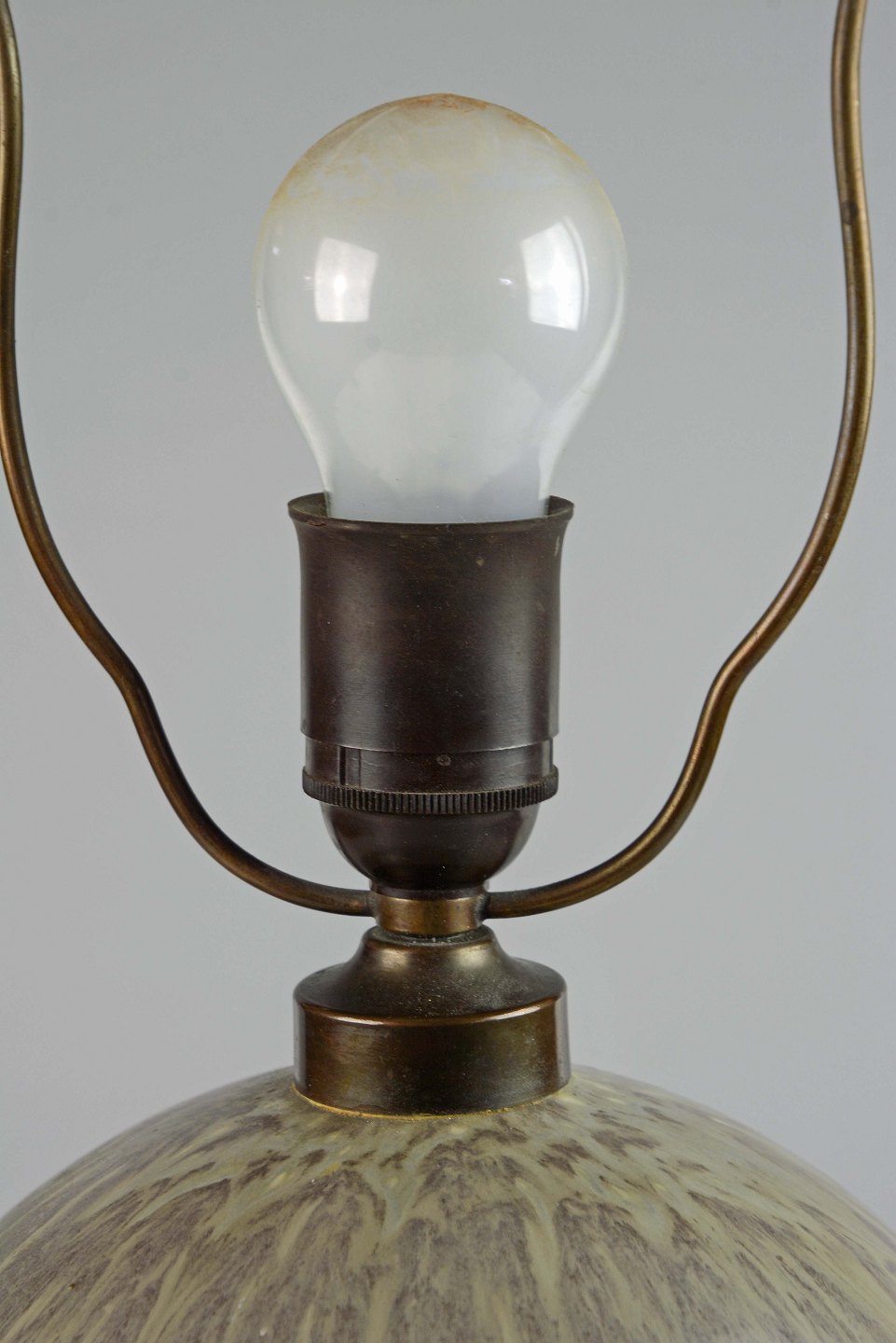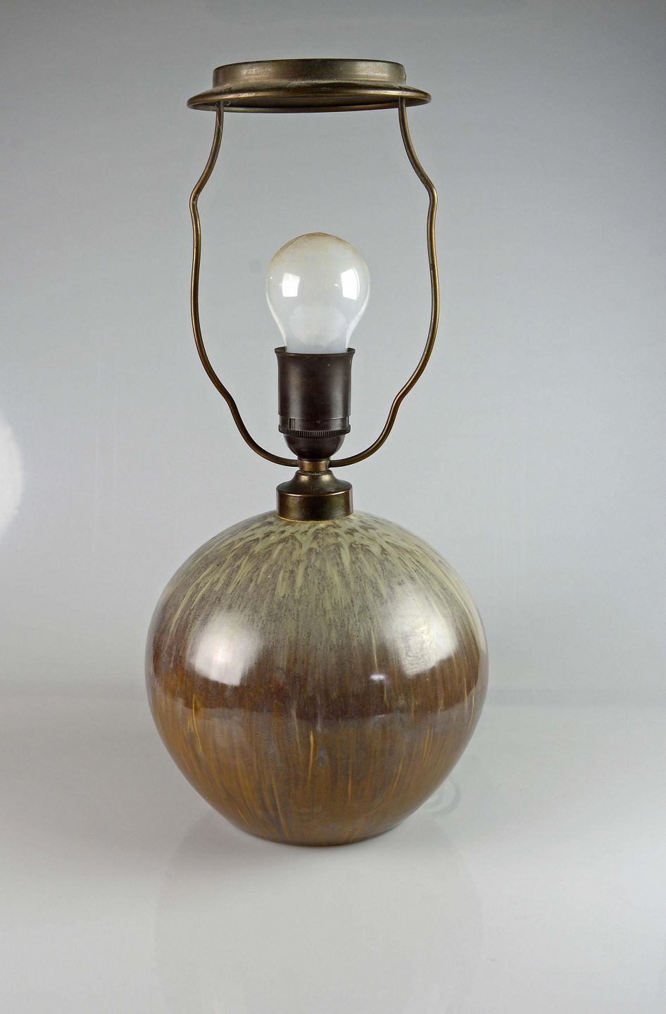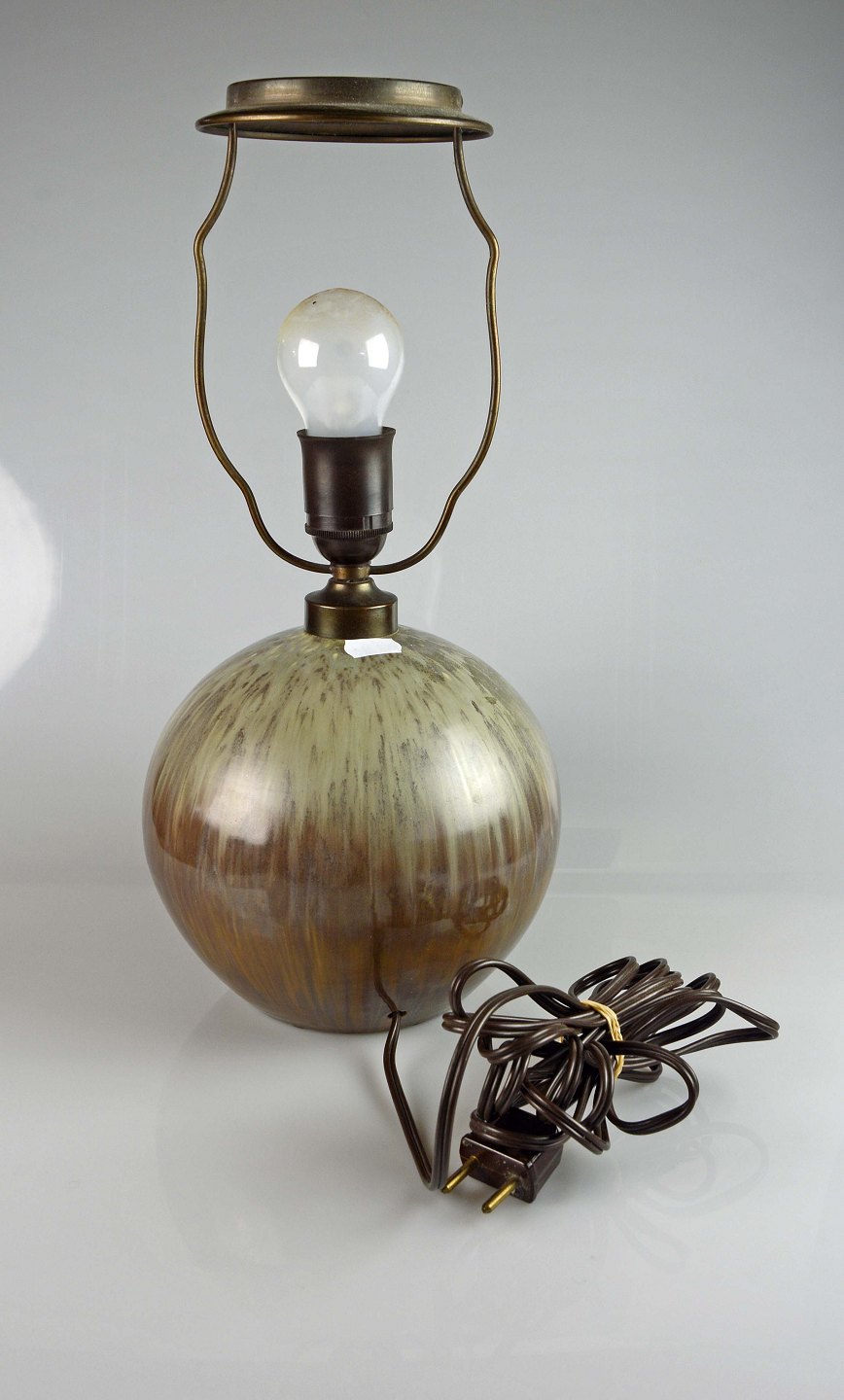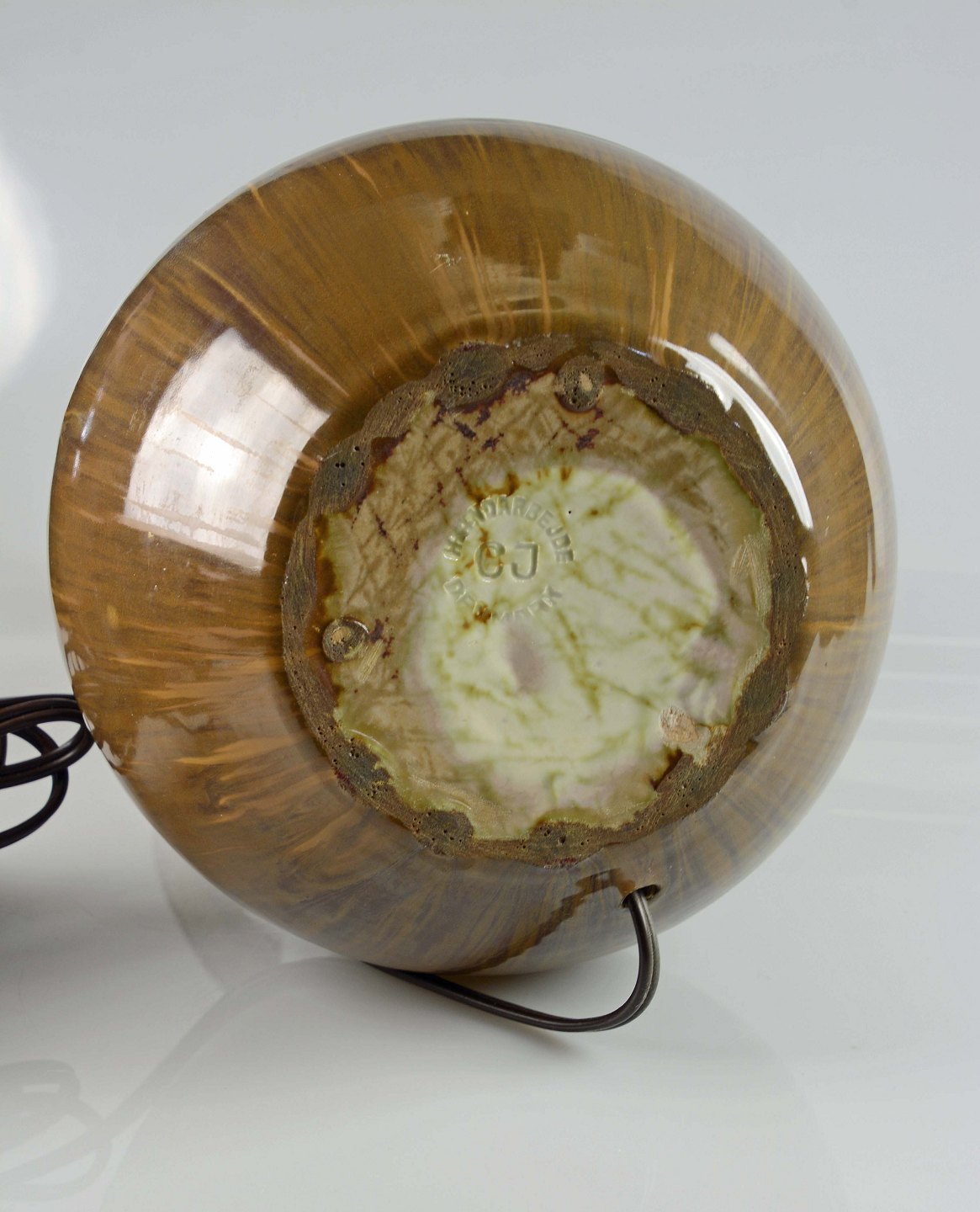 Stor lampefod i keramik, i gyldne og brunlige nuancer