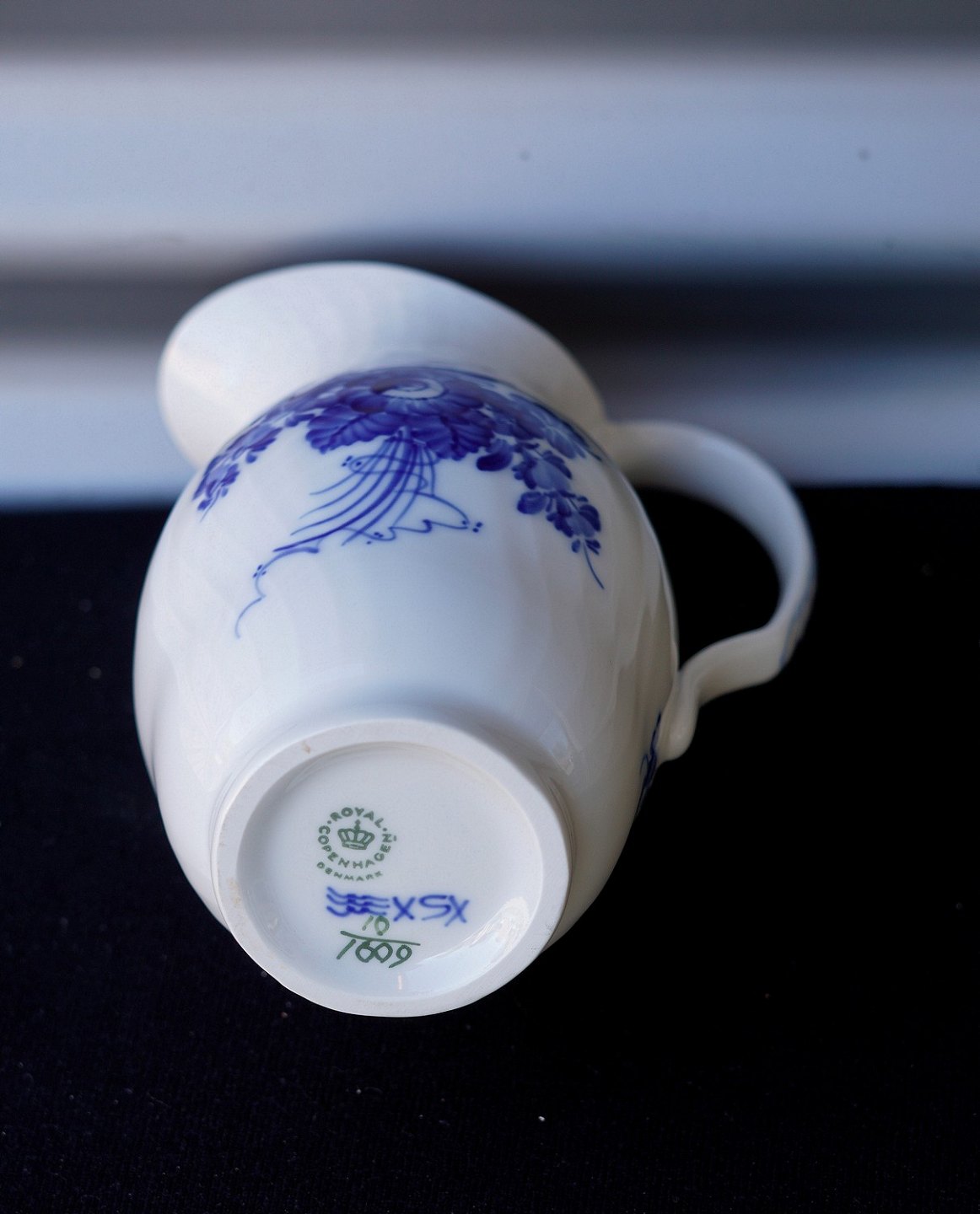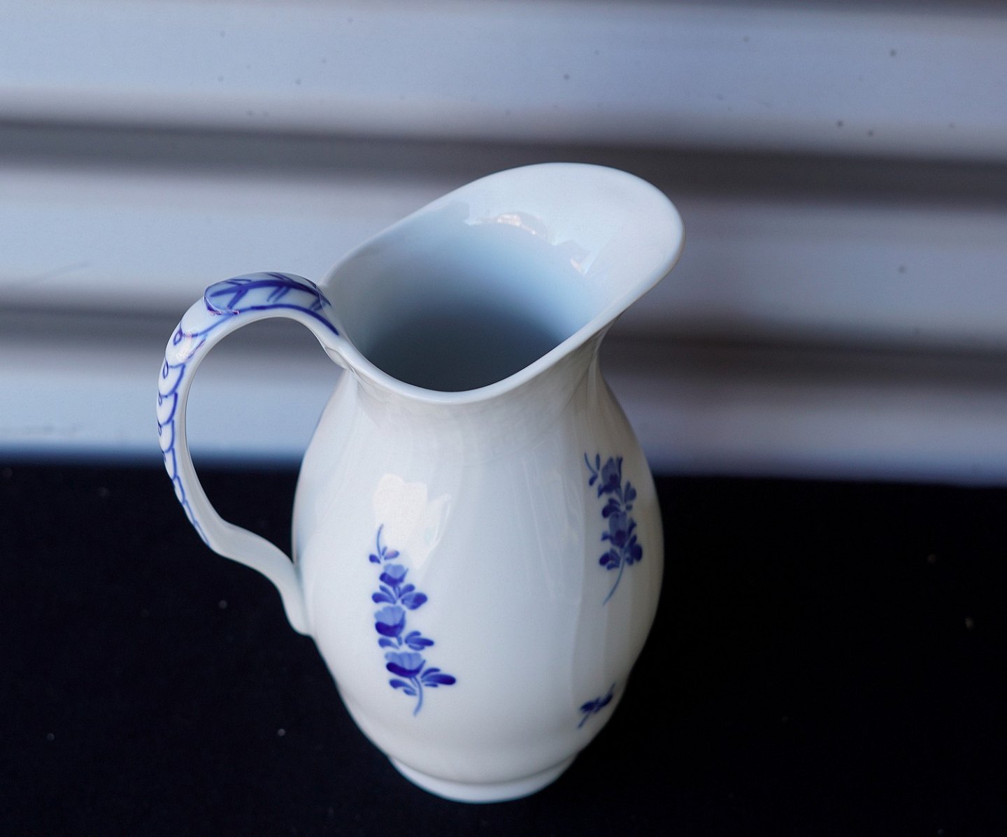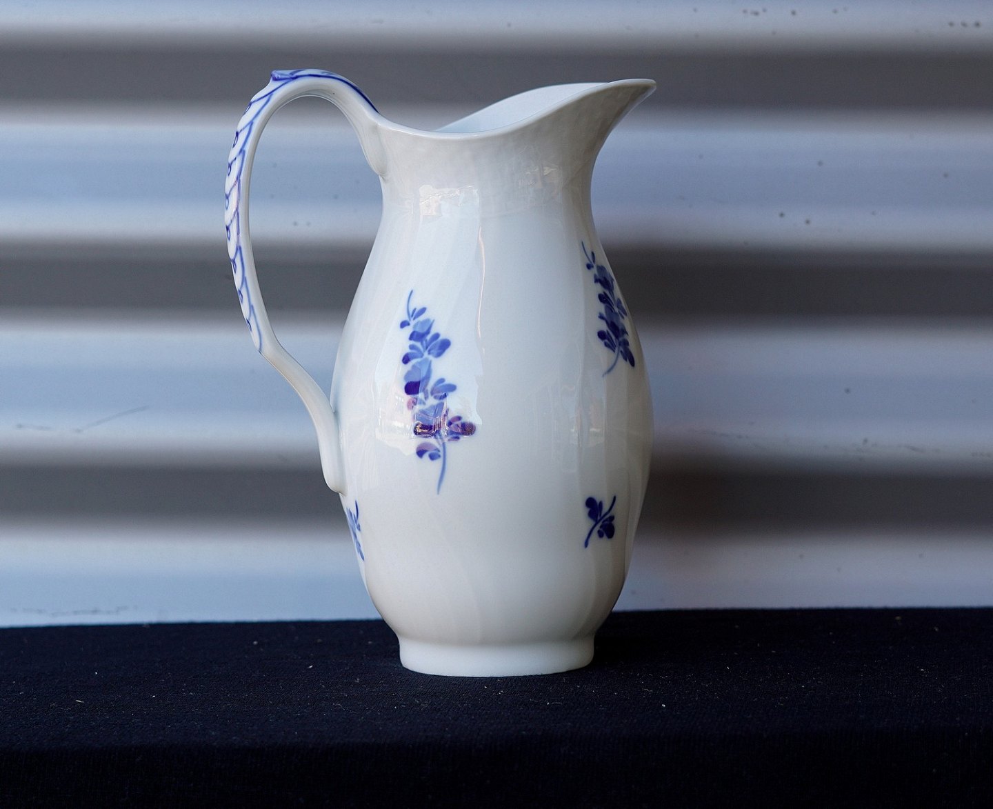 Kongelig Blå blomst mælke-/vandkande (10/1609). Kanden er svejfet