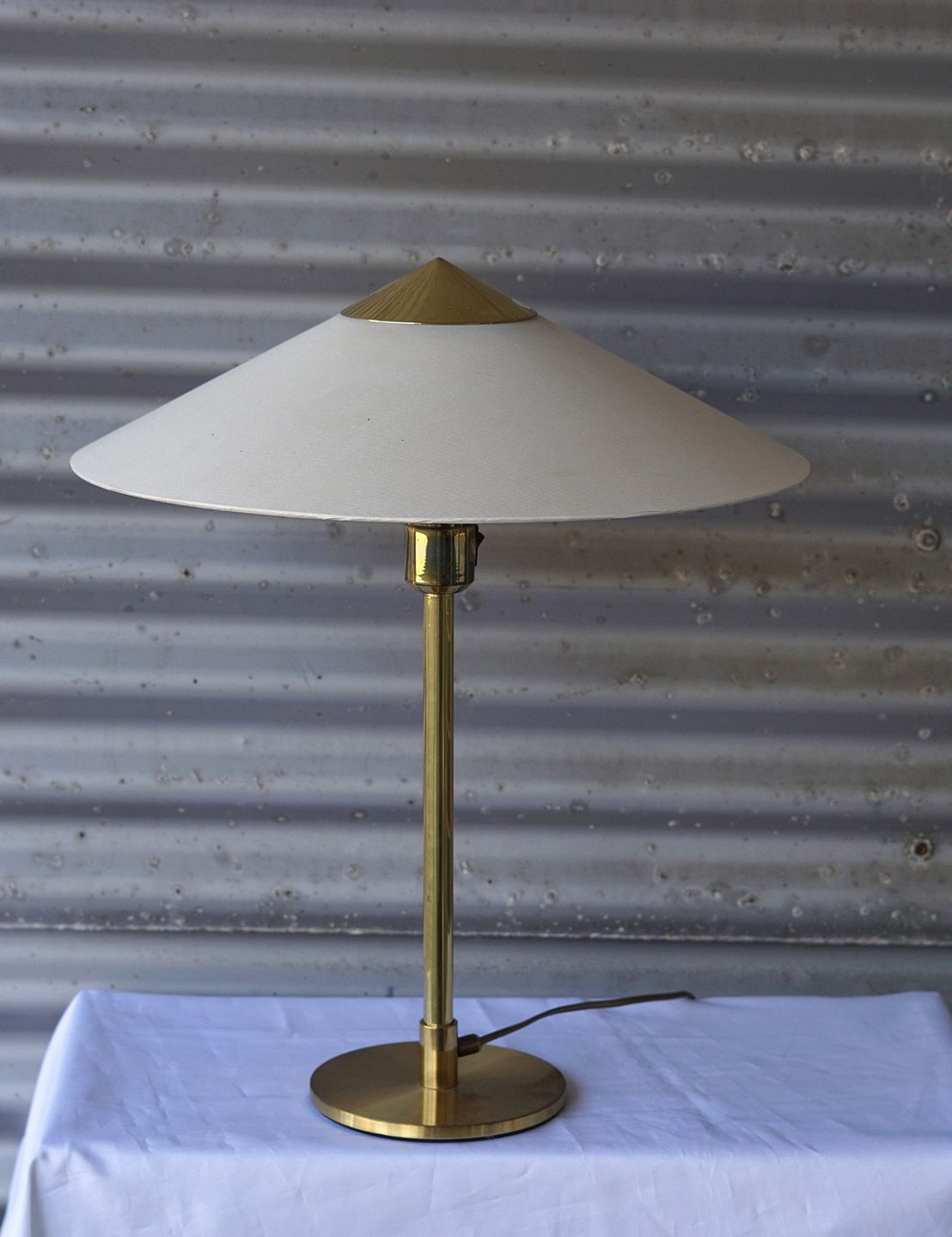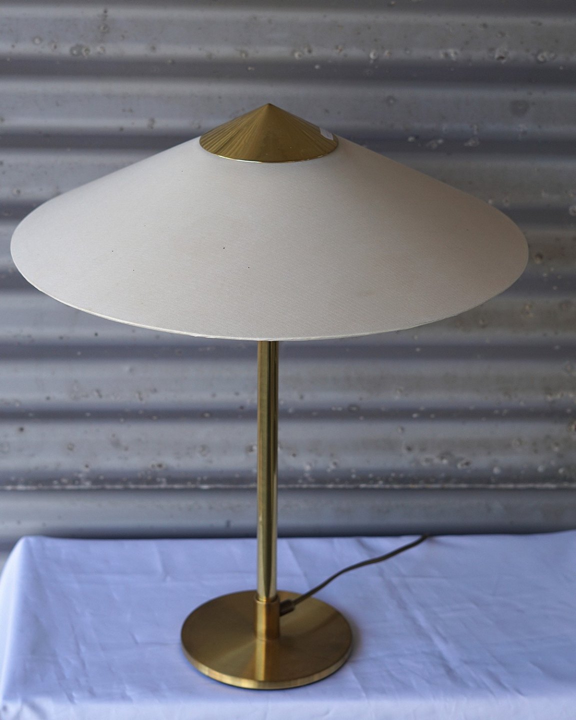 Retro, stilren bordlampe i messing og med stofskærm. Darø Tara st 1213 bordlampe Kongelys
