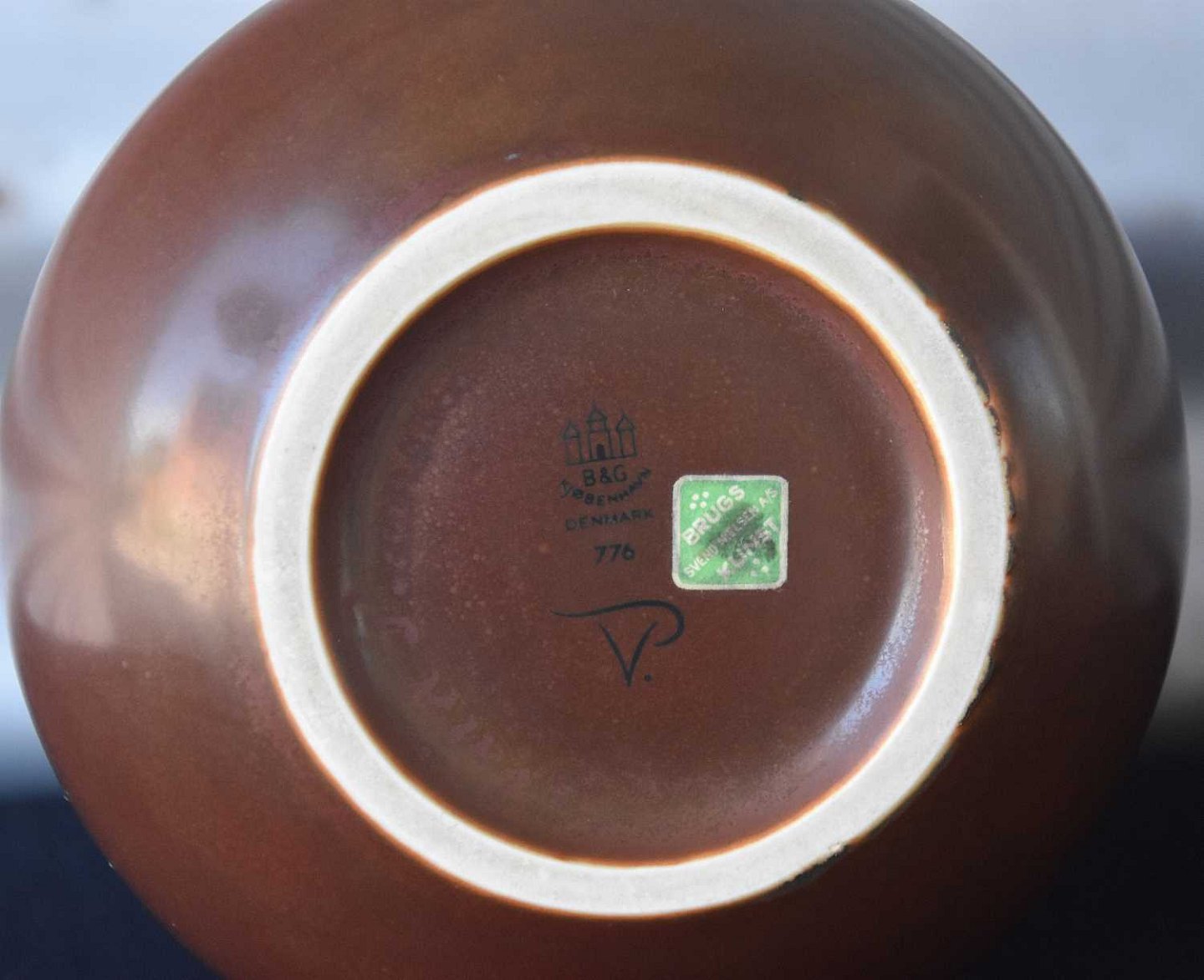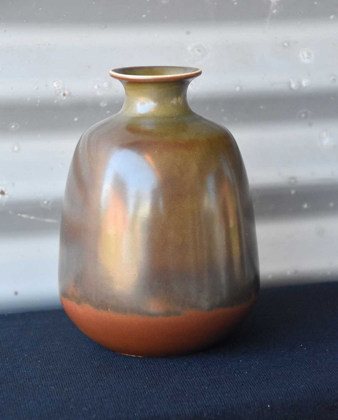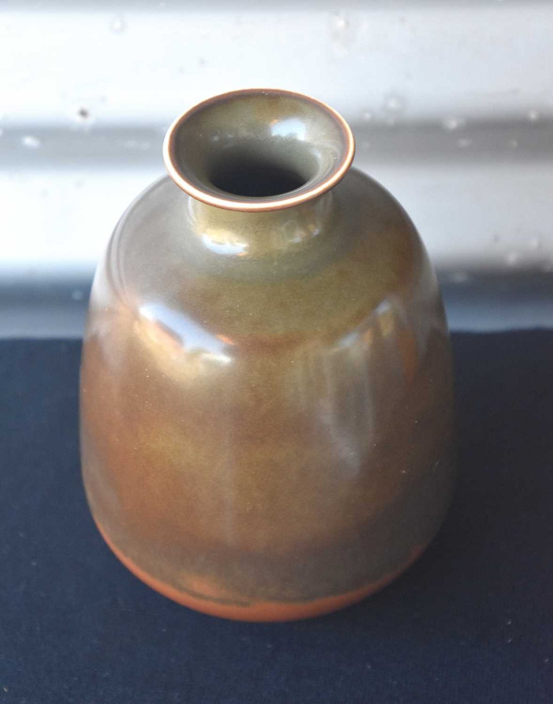 Vase, nr. 776, af stentøj med glasur der gør at vasen changerer i brunlige farver. Vasen er med monogram VP