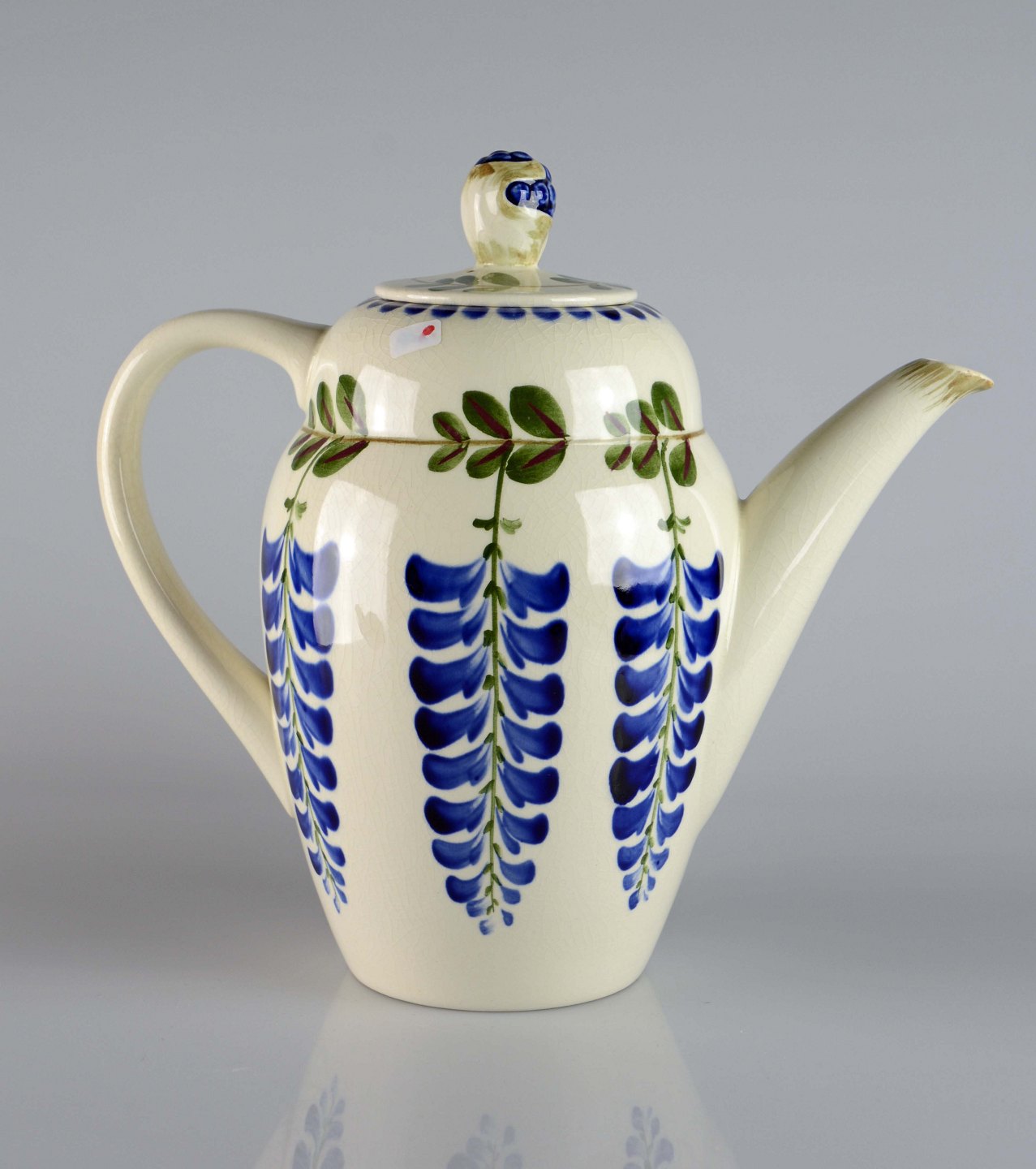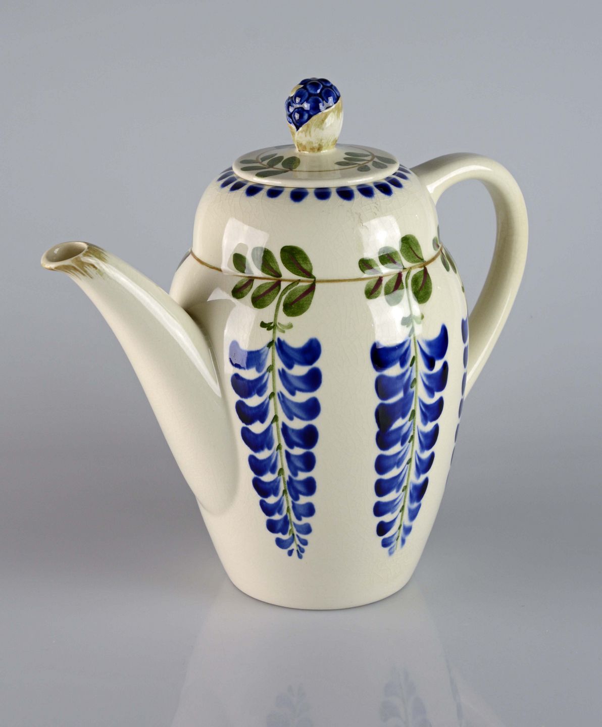 Blåregn kaffekande med låg i fajance fra Aluminia nr. 522/634