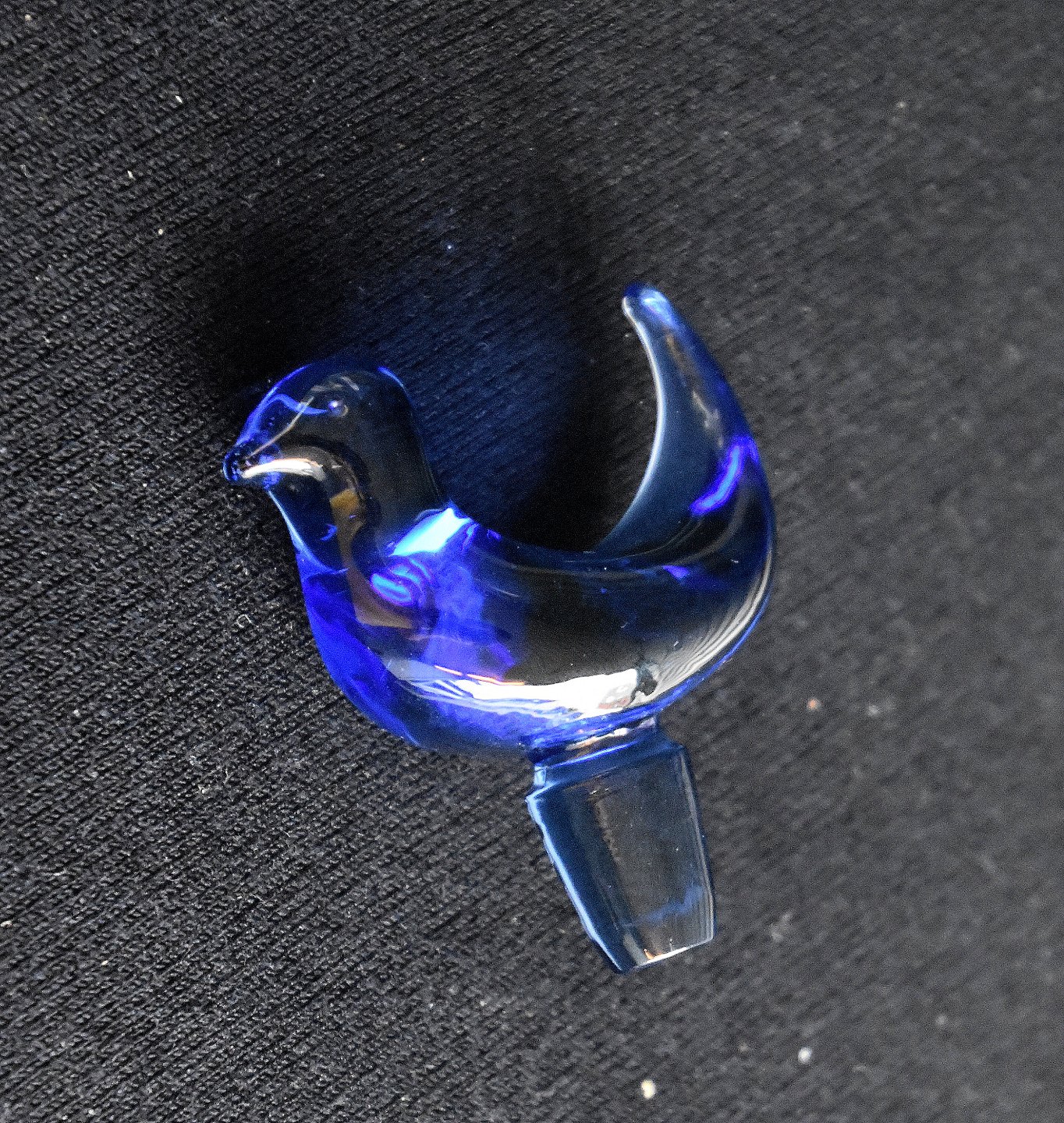 Tøndeformet karaffel fra serien "Noah" med hals og udsvejet flad rand. Safir blå prop udformet som en fugl