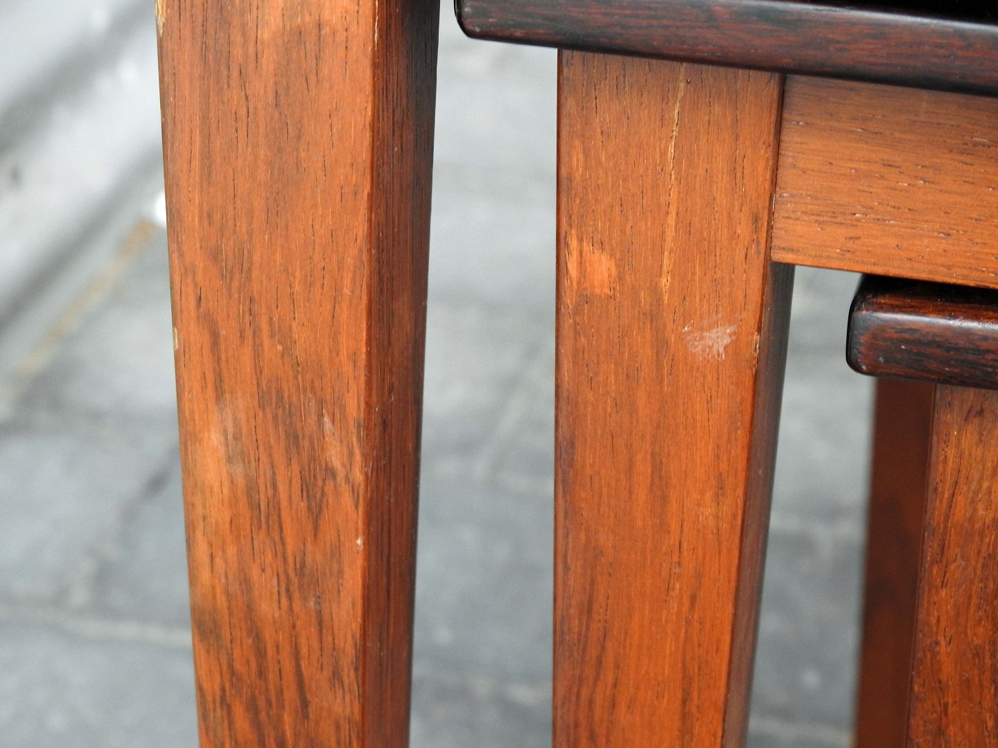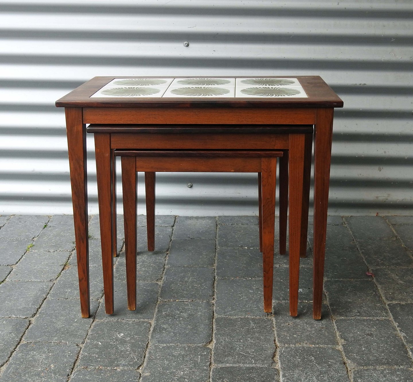Et sæt indskudsborde i palisander med Royal Copenhagen kakler på øverste topplade
