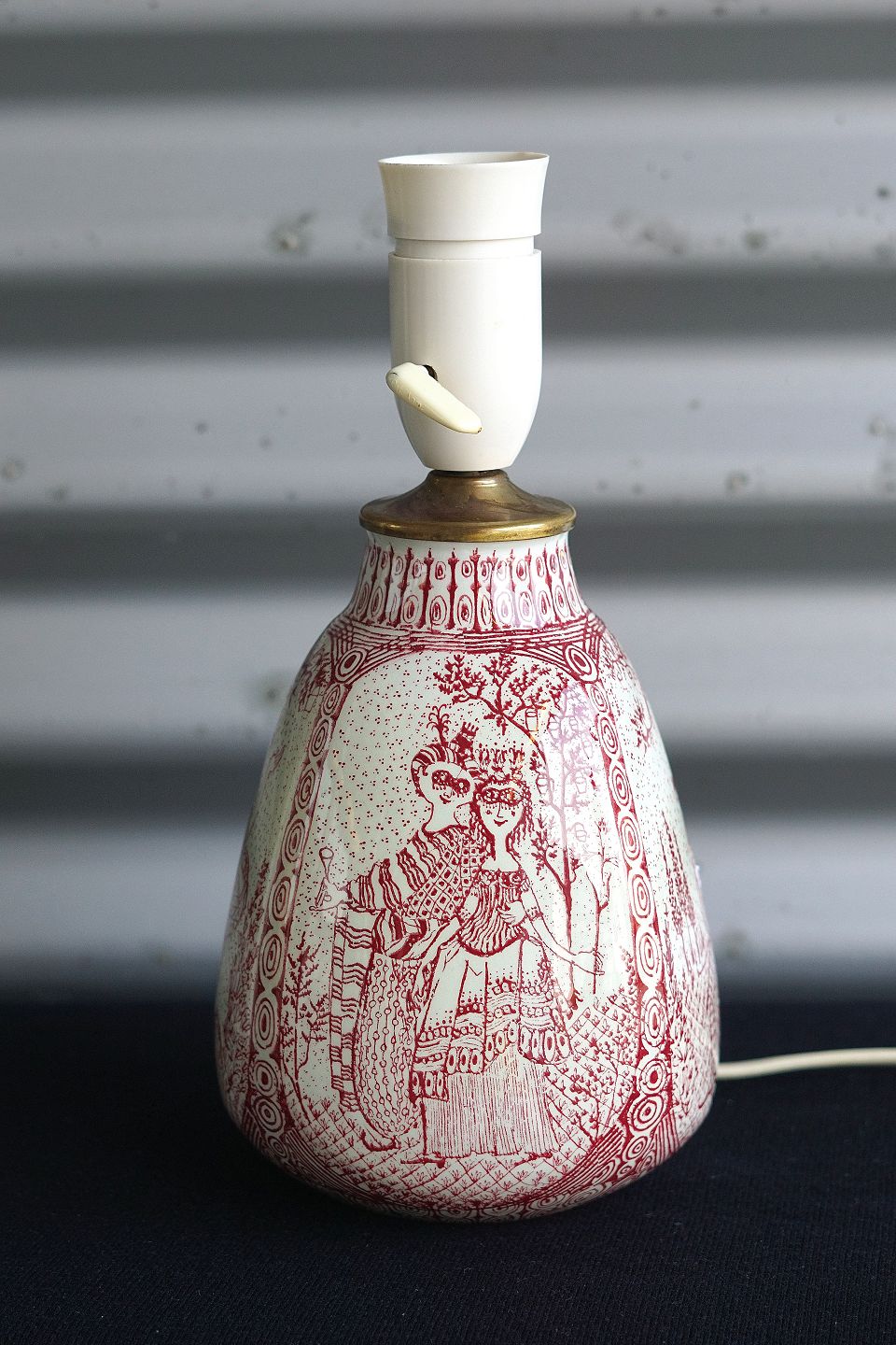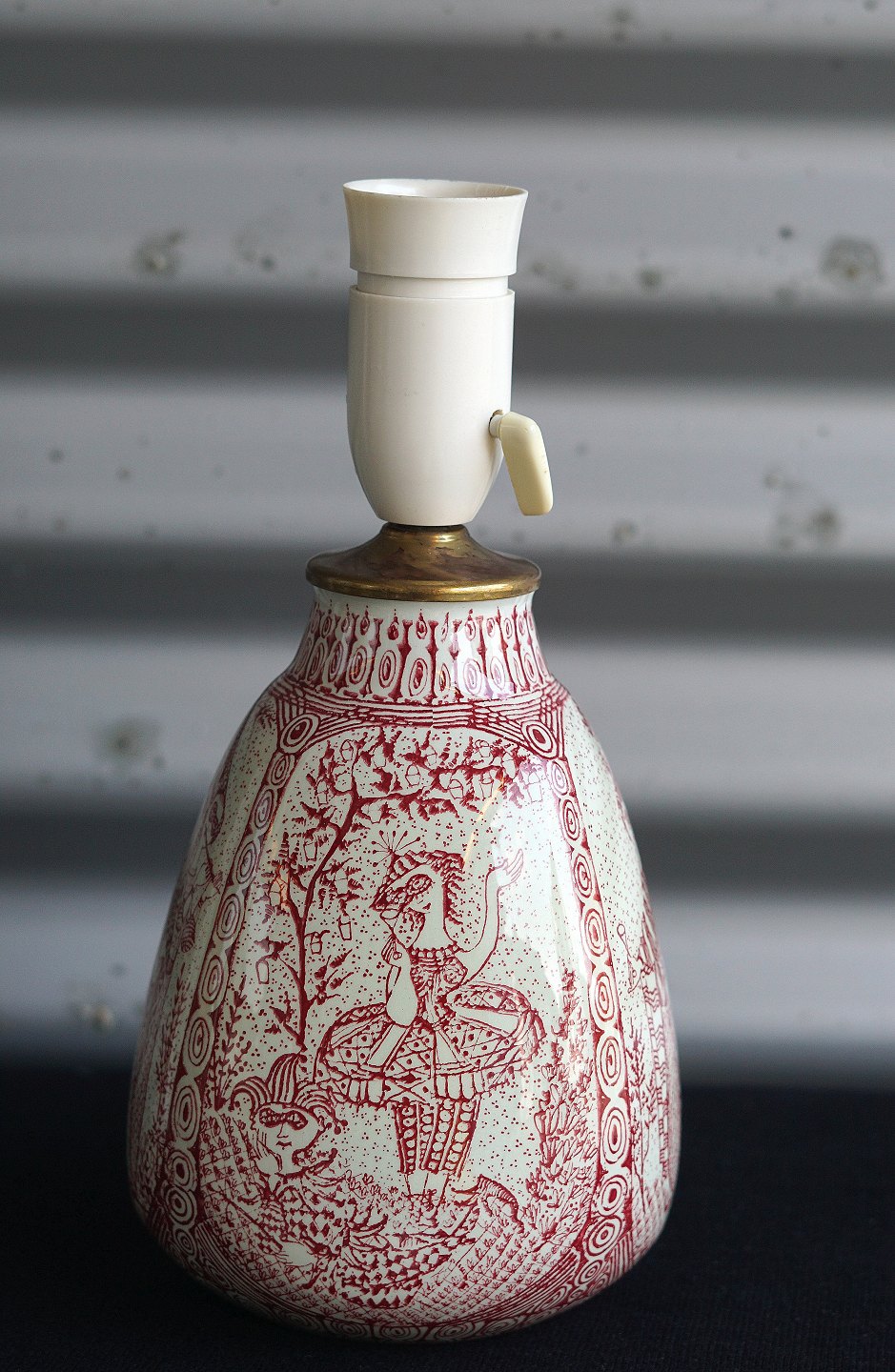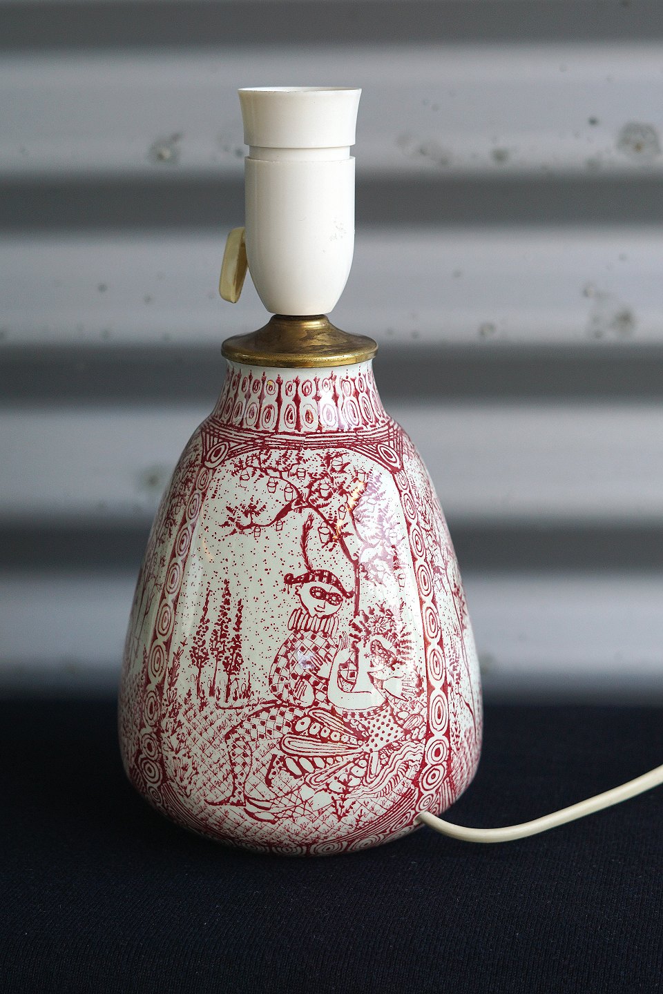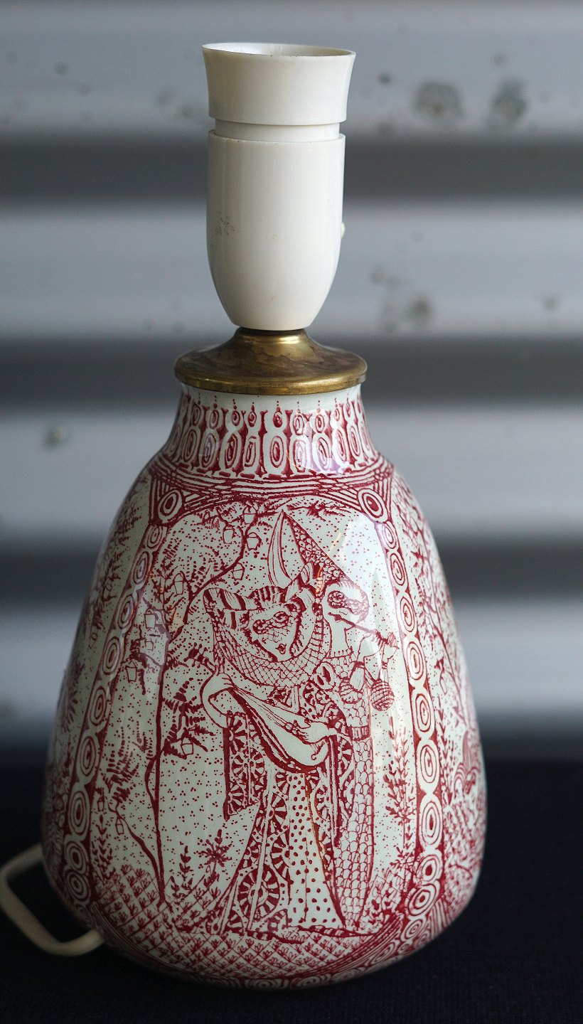 Bordlampe, produceret på Nymølle, med Commedia Dell`Art figurer. Bordlampen er tegnet med rødstreg
