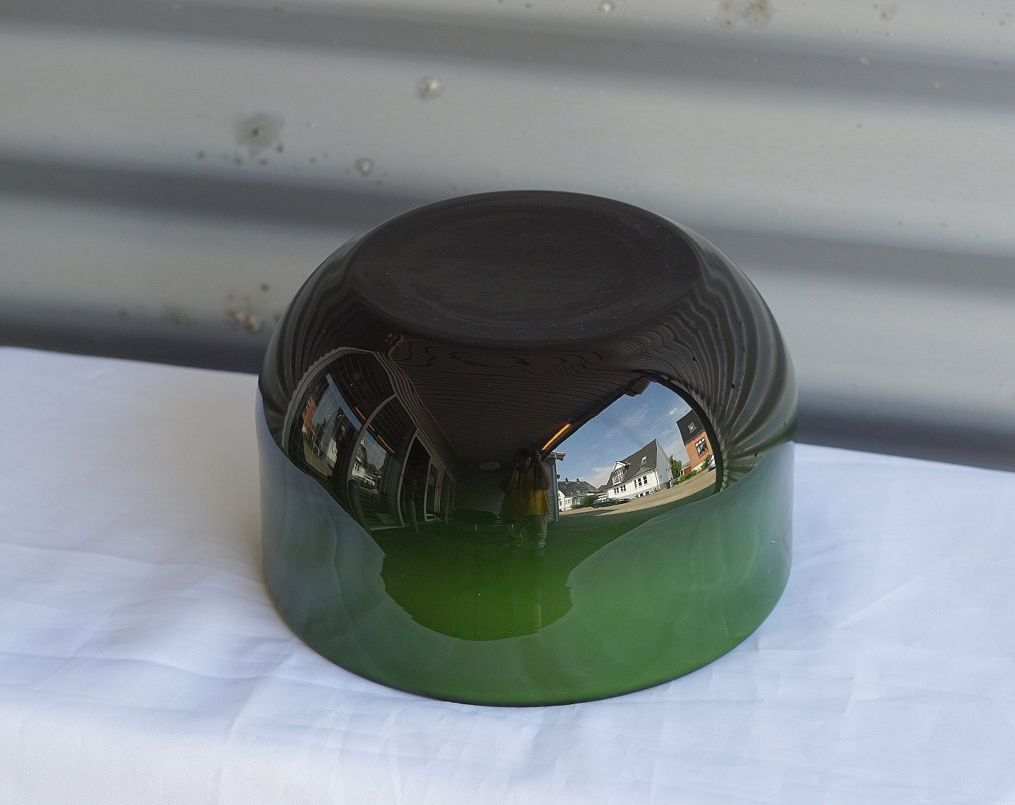 Palet-serien, jadegrøn skål. Fremstillet på opal post med farvet og hvidt glas overfang. Produceret på Fyens Glasværk, fra 1969 til 1976, for Holmegaard Glasværk