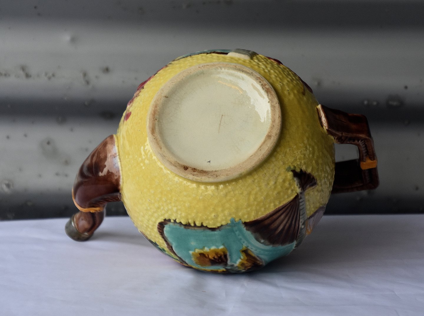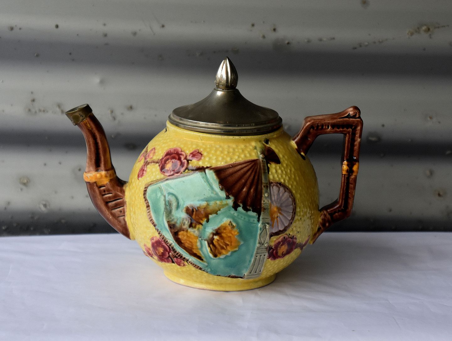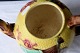 Gul tekande i keramik dekoreret med vifte og blomster, med metal låg