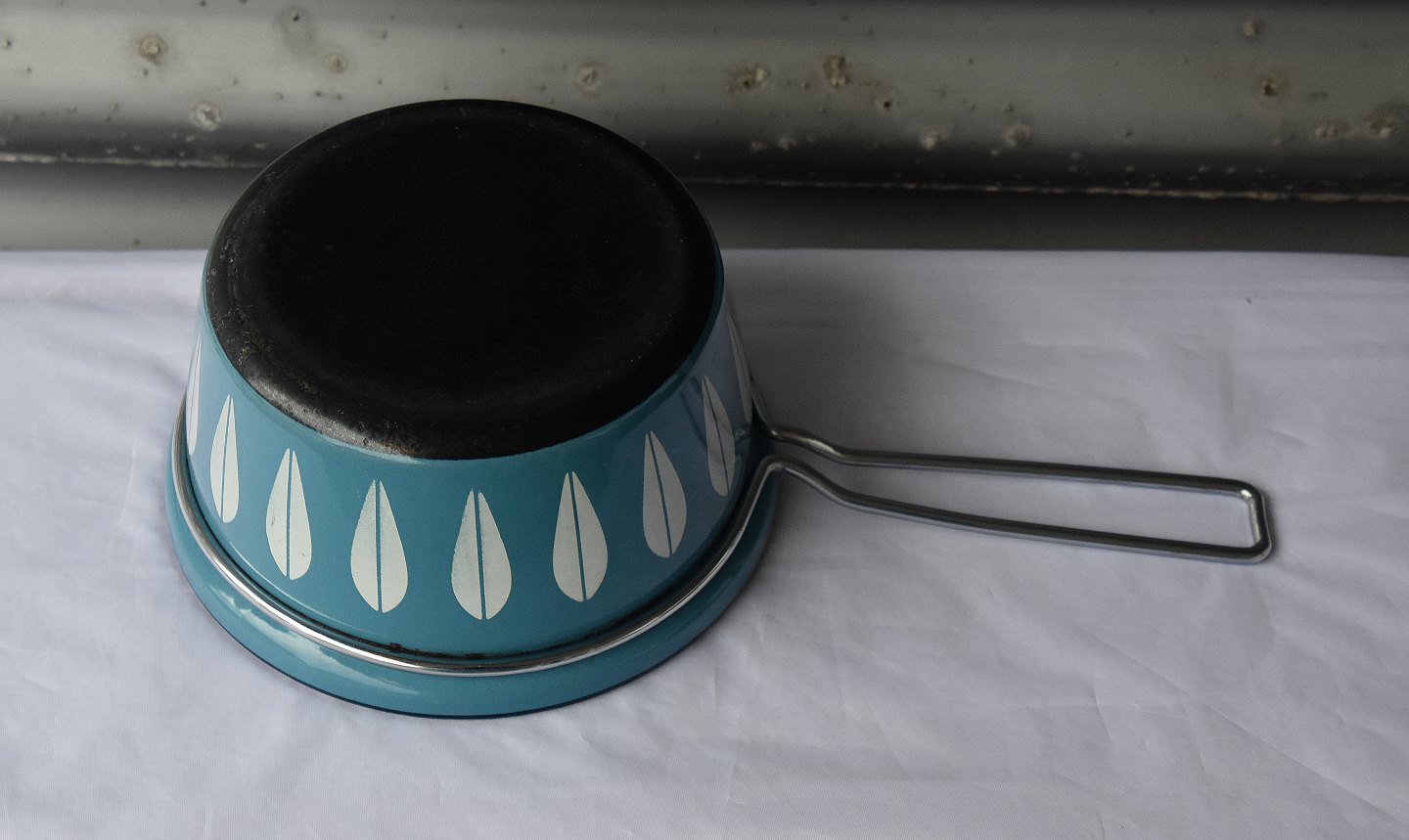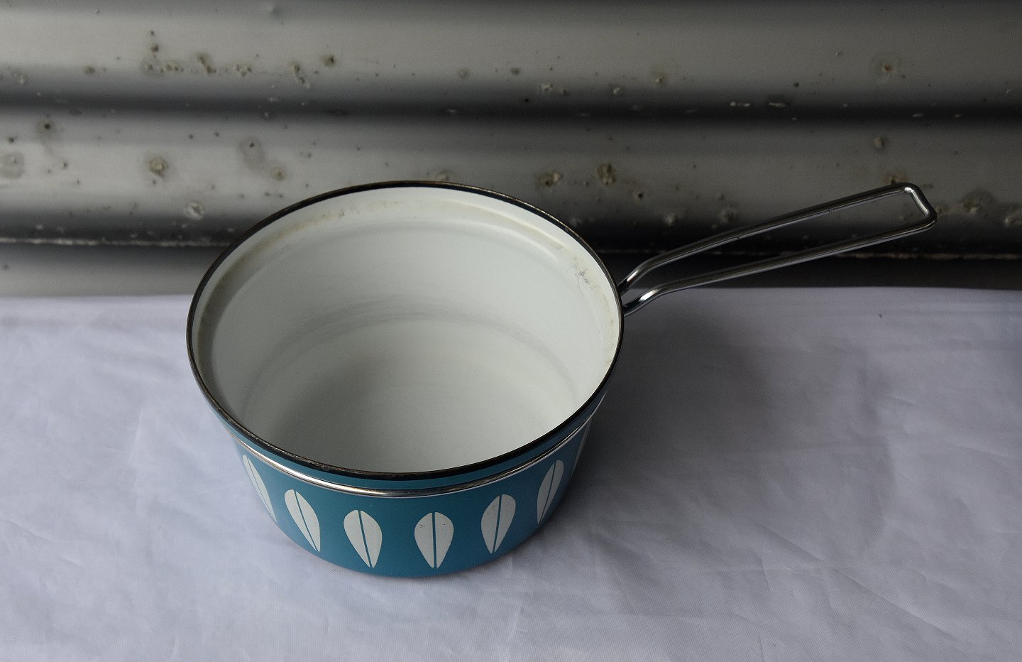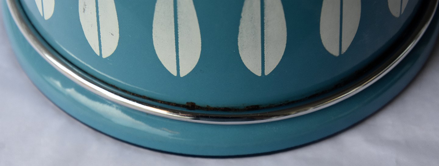 Kasserolle, blå emaljeret med hvide blade, låget er også blåt. Kasserollen er emaljeret