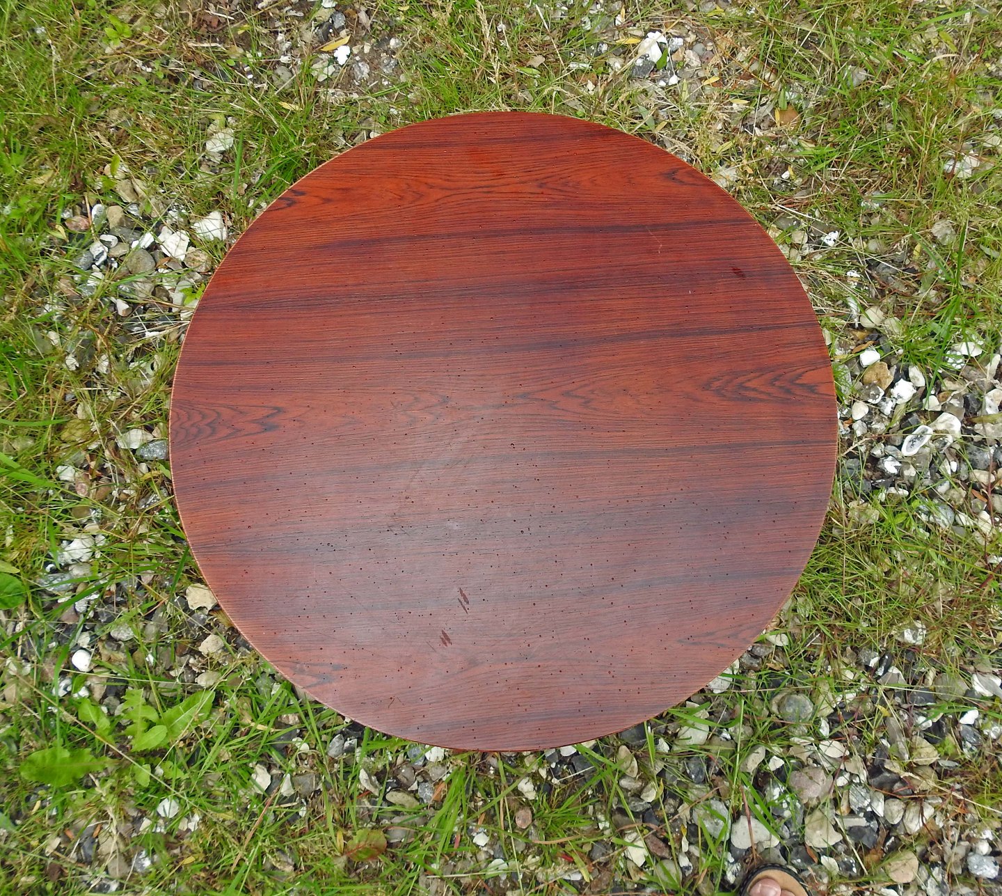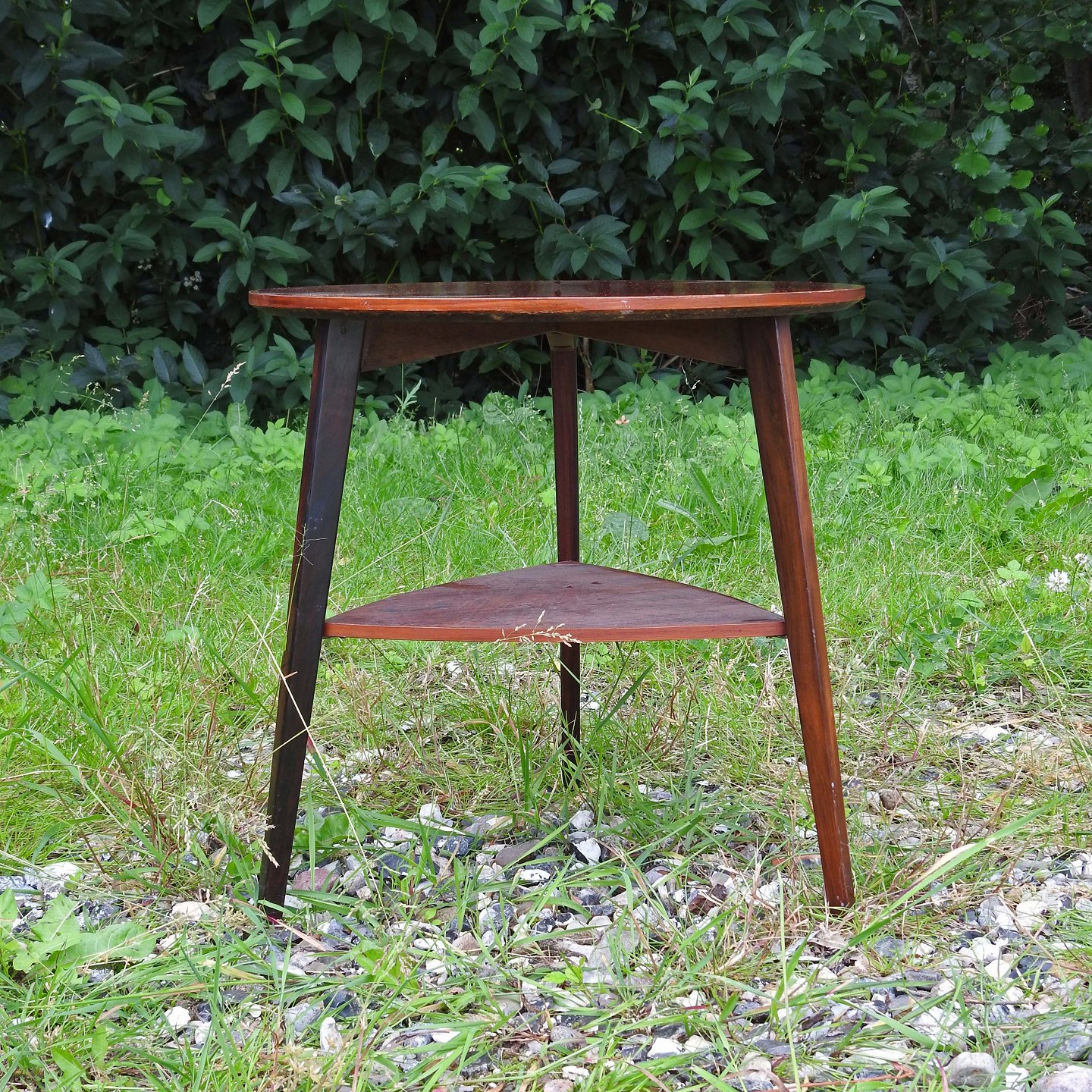 Rundt sidebord i lakeret palisander med trekantet hylde