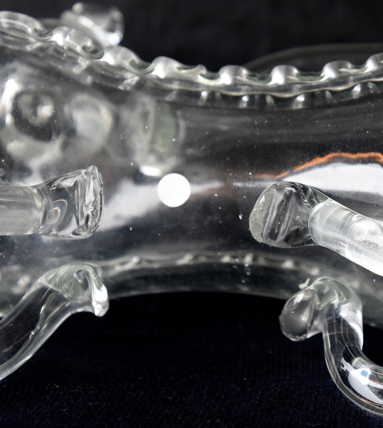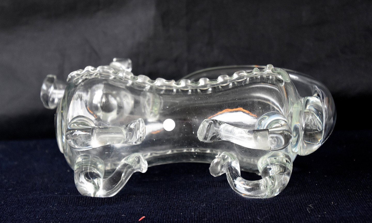 Snapsehund glas, med påsat hale som hank og påsatte ører, både hank og ører er af klart glas, glas med blålig tone