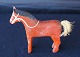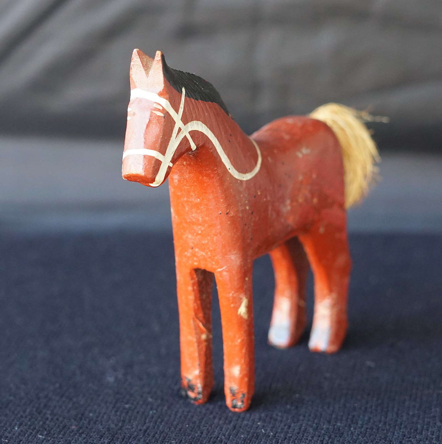 Gammelt legetøj, formodentligt en lille fængselshest. Hesten er udført i træ og malet rødbrun, hale er pjusket, manke er malet på med sort maling og til seletøjet er der brugt hvid maling