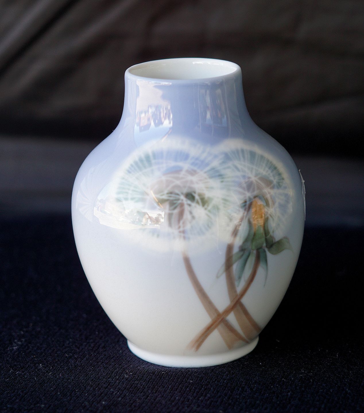 Royal Copenhagen, vase 2136/45A. Vasen er dekoreret med 2 udsprungne mælkebøtter, bagsiden er dekoreret med 1 vissen mælkebøtte