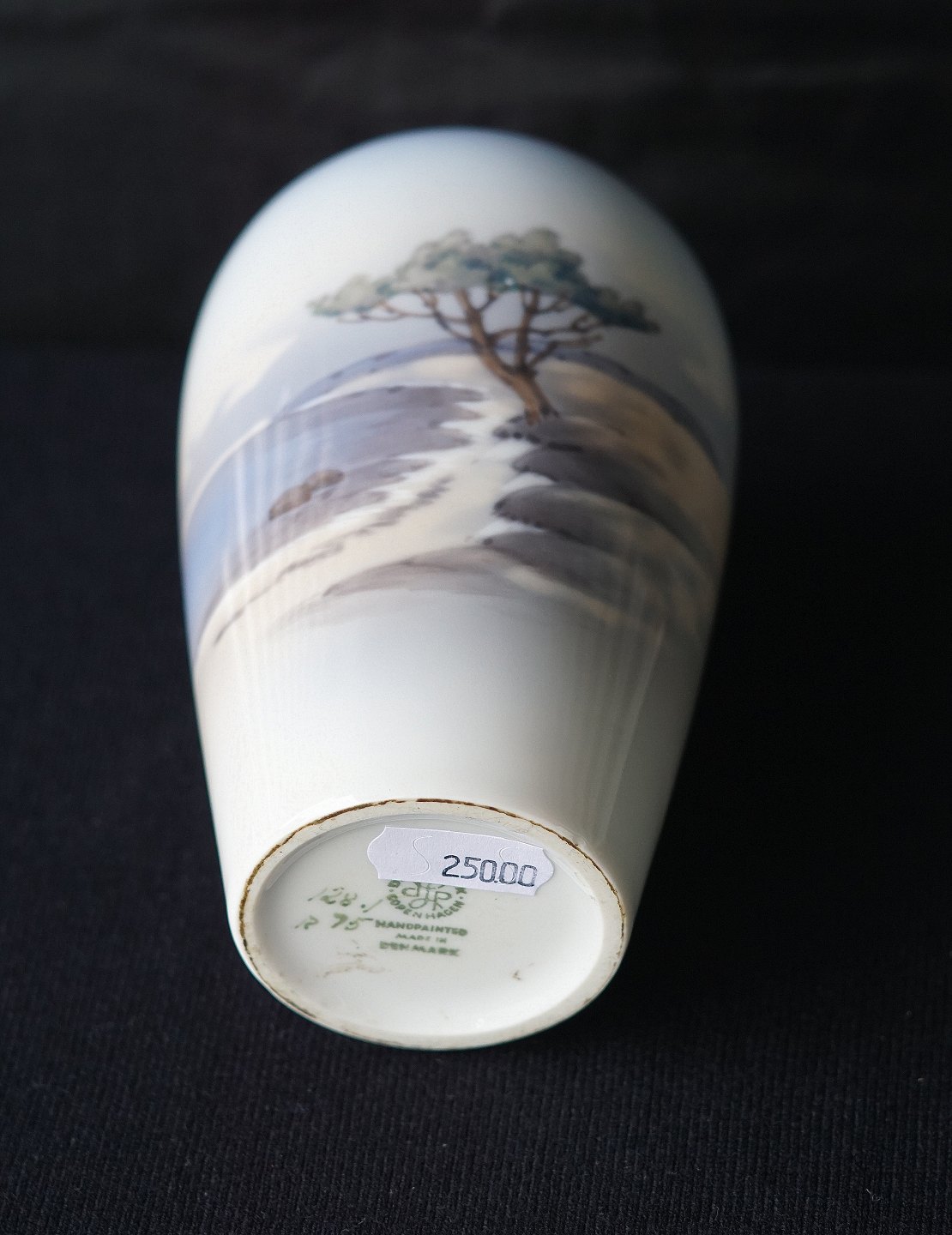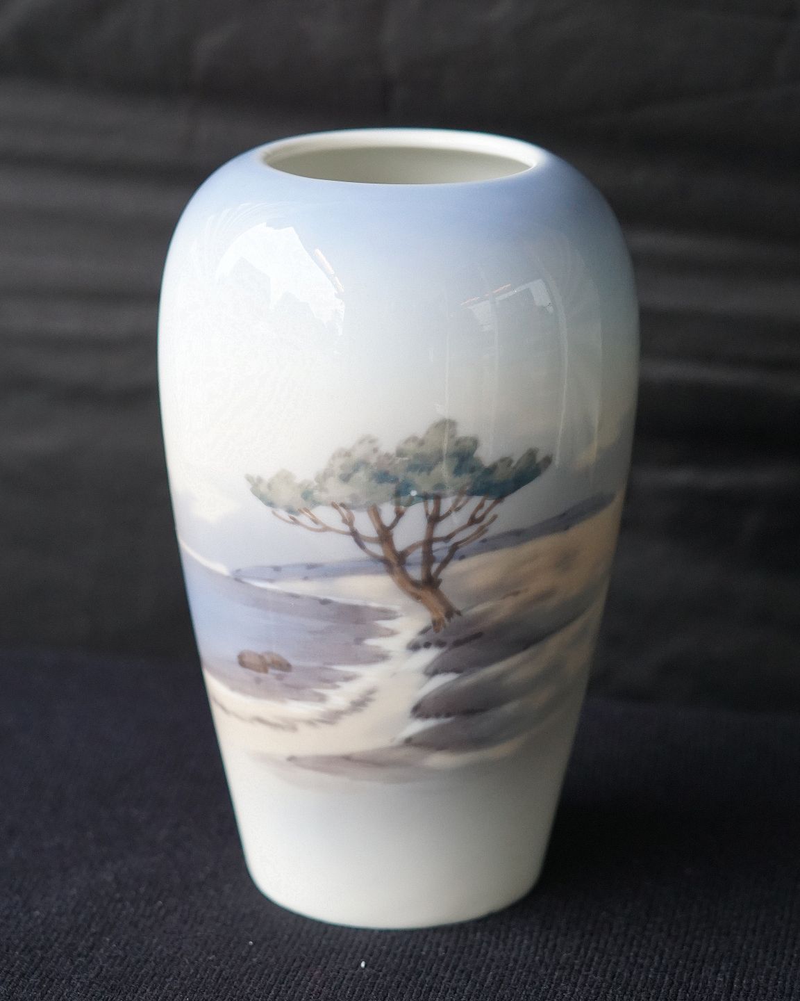 Lyngby Porcelæn, vase 128-1/75, 1. sortering. Vasen er håndmalet og dekoreret med et træ med grøn trætop, træet står ved en å