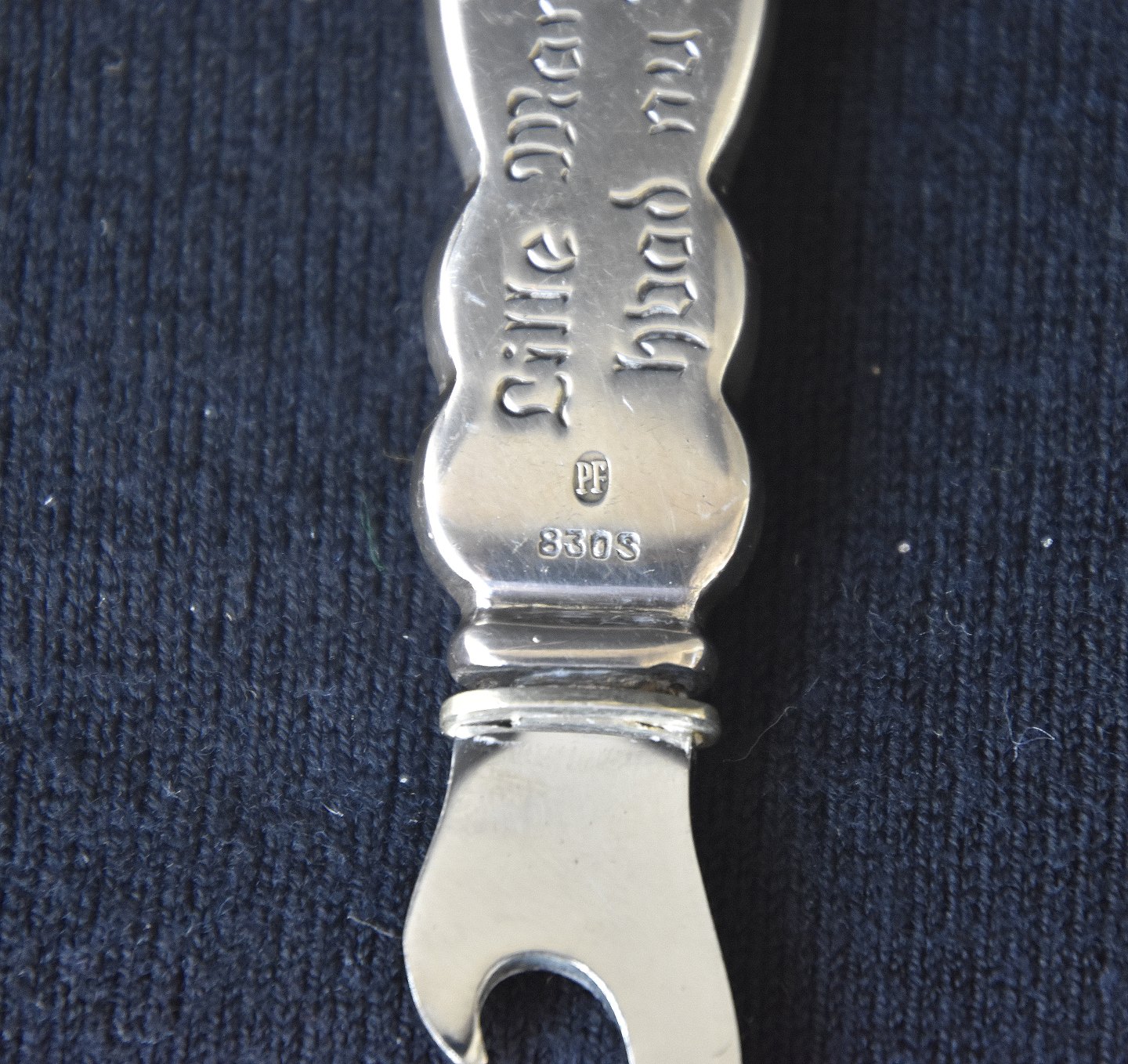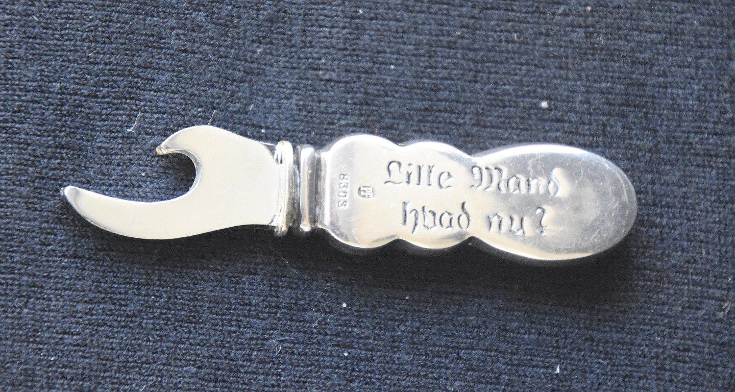 Pfeibring Solingen, oplukker med indskrift, "Lille mand hvad nu", oplukker er af stål, håndtaget sølv 830s