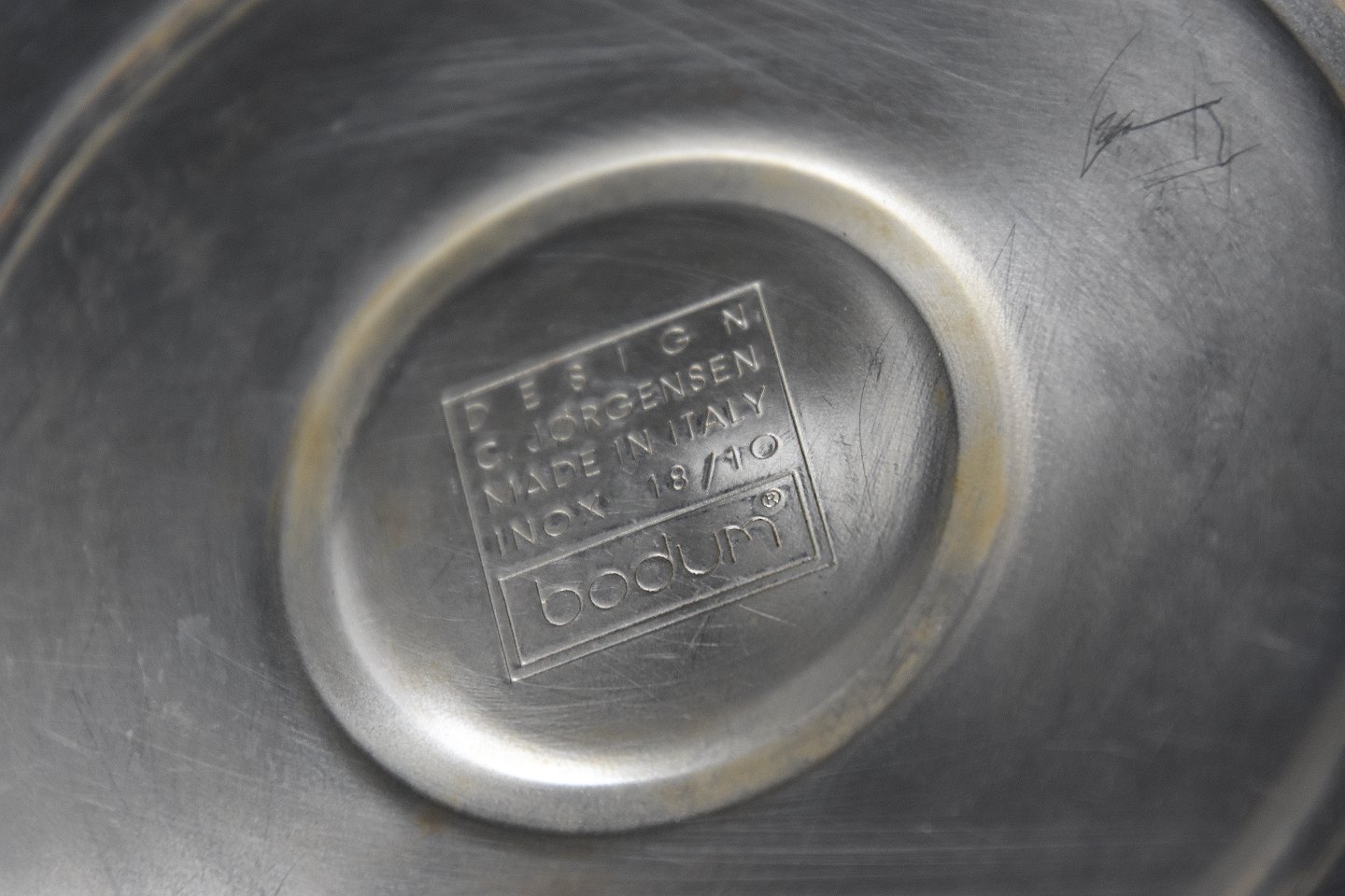 Bodum tekande med teaktræshåndtag. Kanden er lavet af blankpoleret stål, INOX 18/10. Hank er af teaktræ og der sidder en lille blå kugle på toppen af låget. Kanden er nittet sammen og de skruer der er brugt er af messing. made in Italy