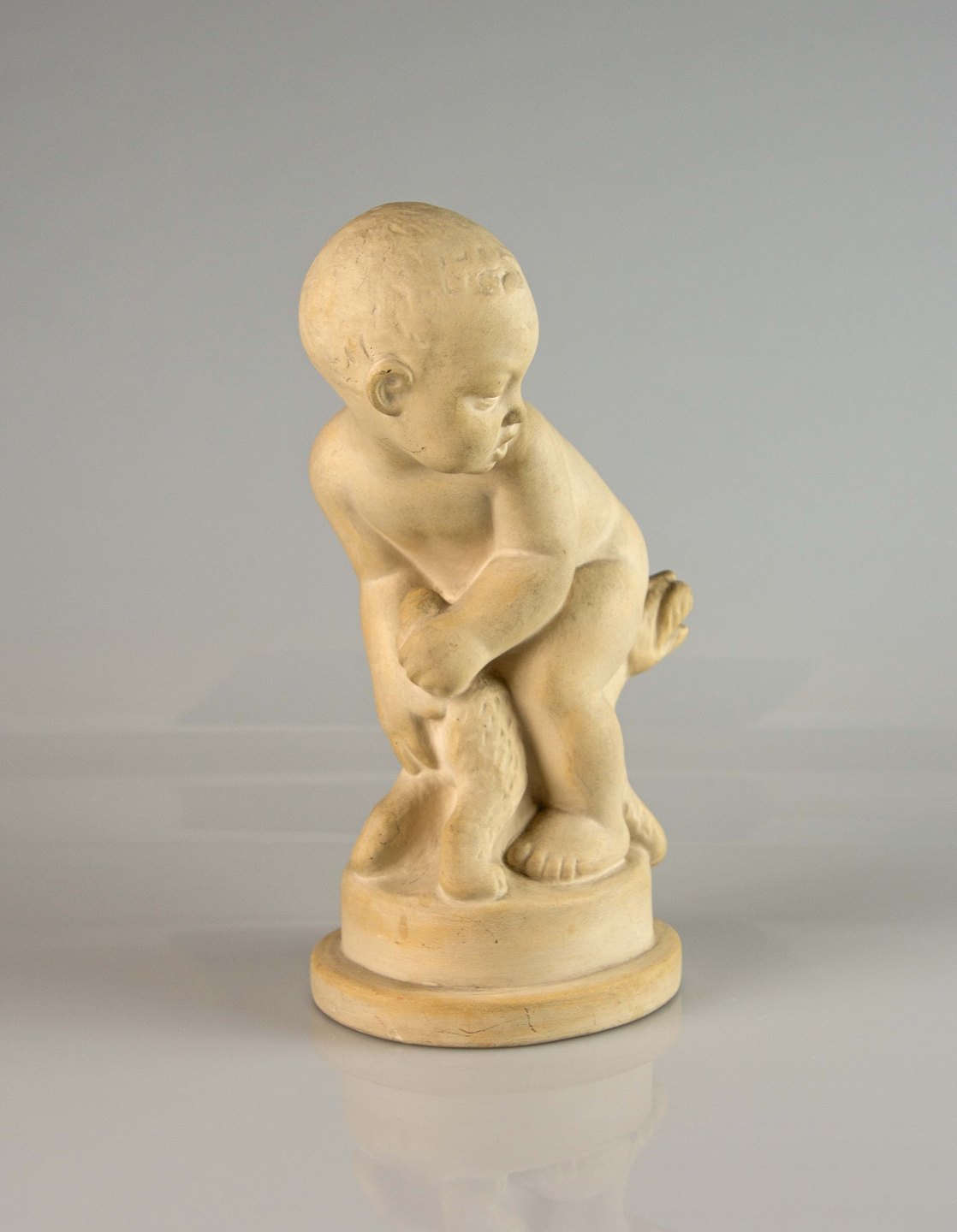 Figur i keramik med motiv af dreng med hund mellem ben